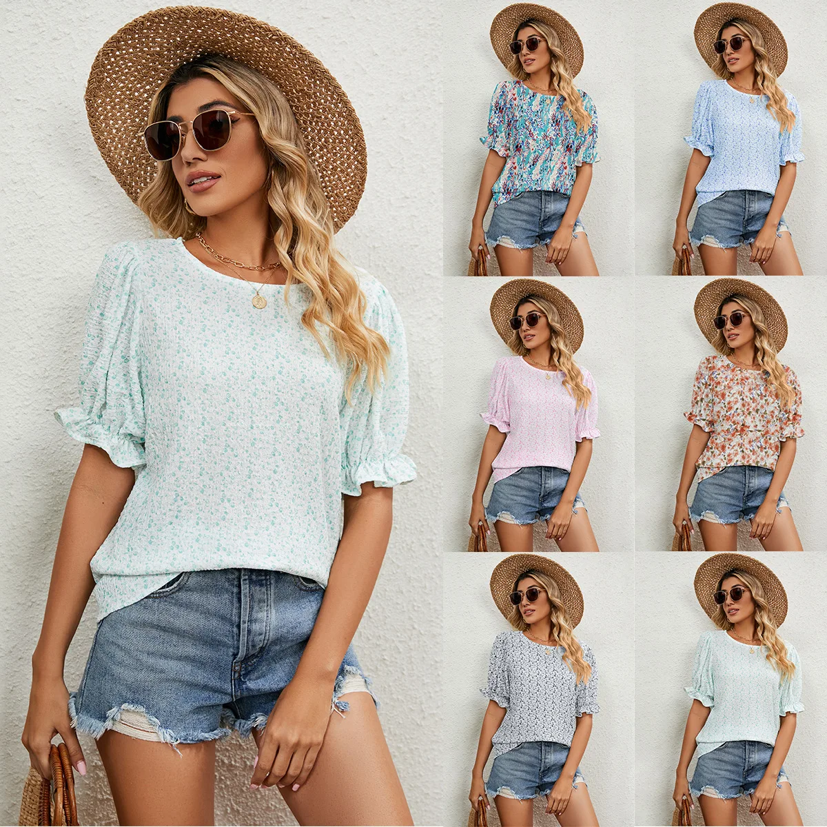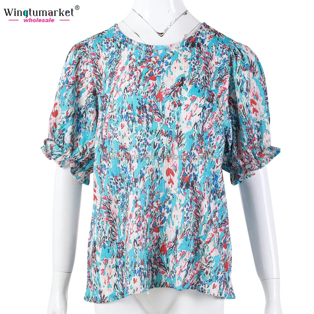 Designer Summer Woman Blouses Crepe Floral Tops Frills Puff Sleeves Casual Ladies Blouse Elegant Shirts for Women