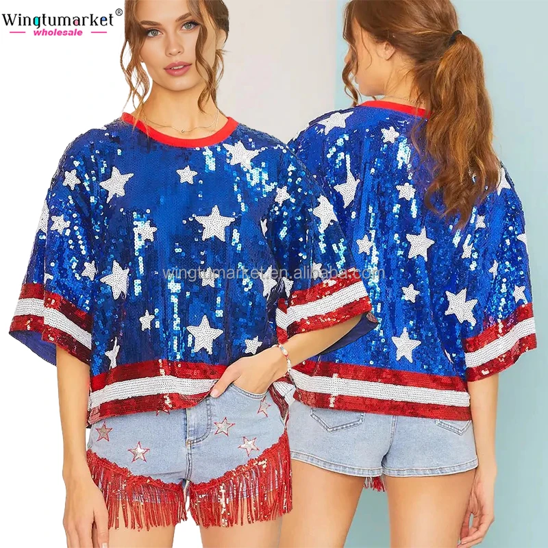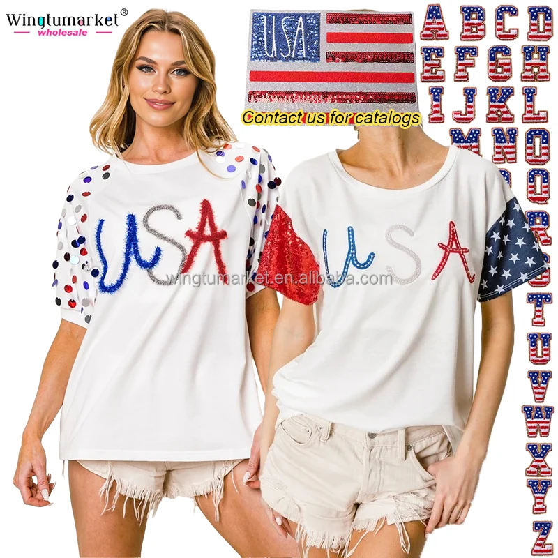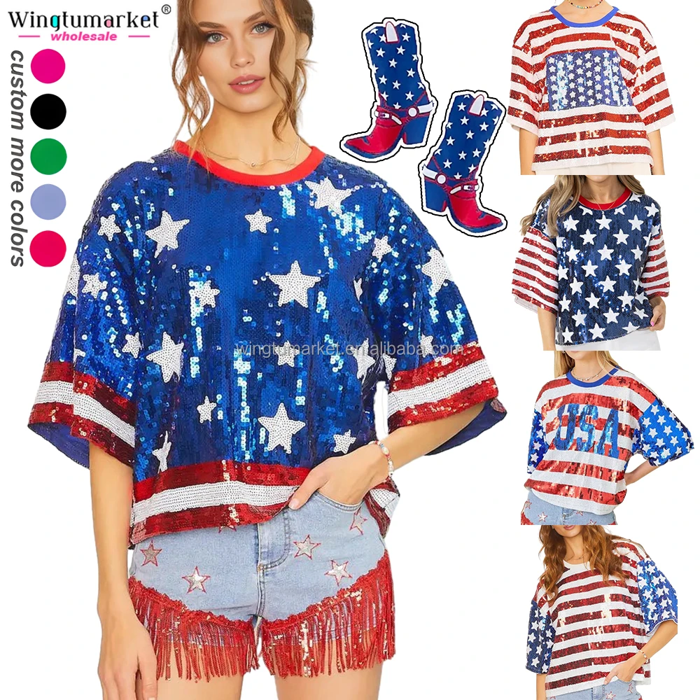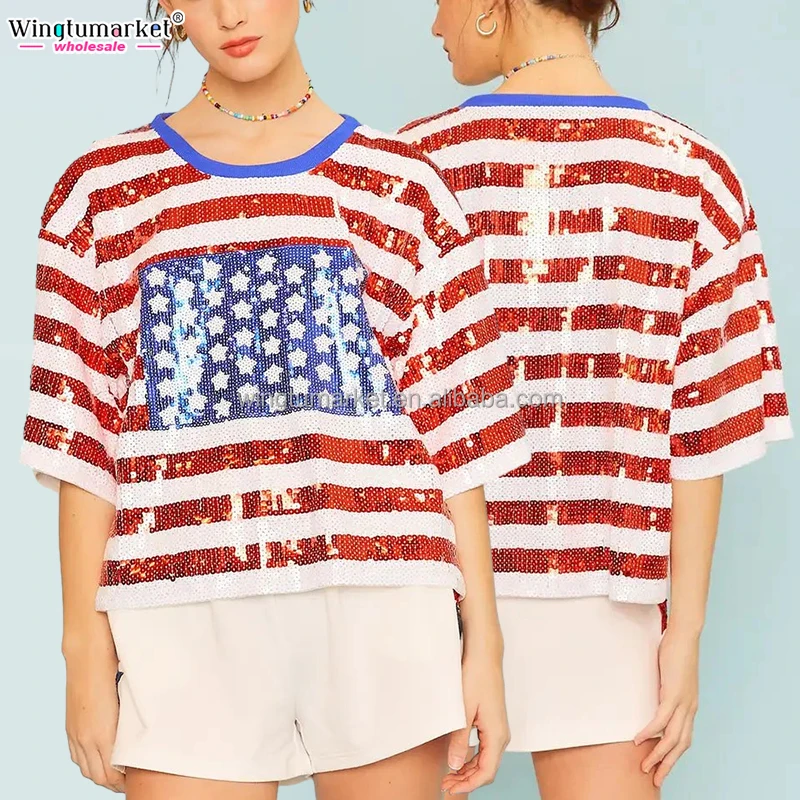 Wholesale Patriotic USA Top Sparkler Embroidered Metallic Short Sleeve Striped Star American Shirt Boxy Sequin Women t Shirts