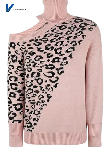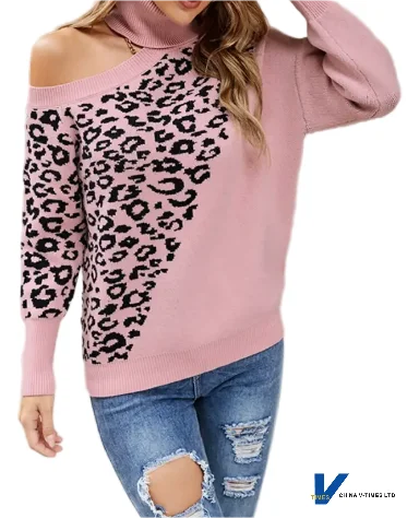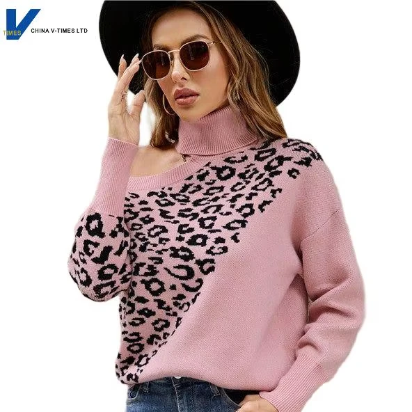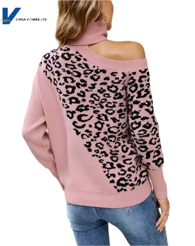 Women's Turtleneck Cold Shoulder Sweater Long Sleeve Leopard Jacquard Casual Knit Pullover
