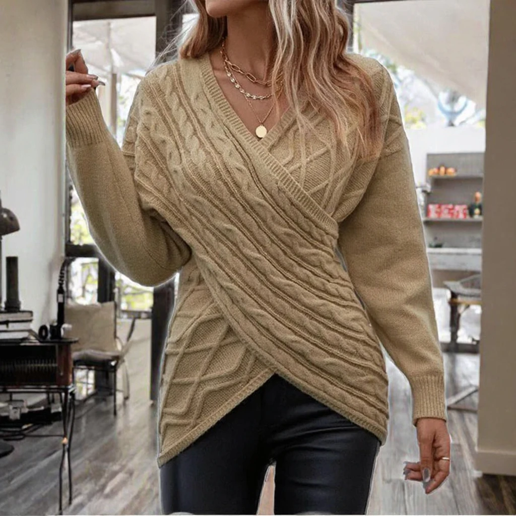 China V-times Women's Sweater New V-Neck Long Sleeve Overlap Casual Breathable Autumn Solid Color Warm Elegant Knitted Sweater