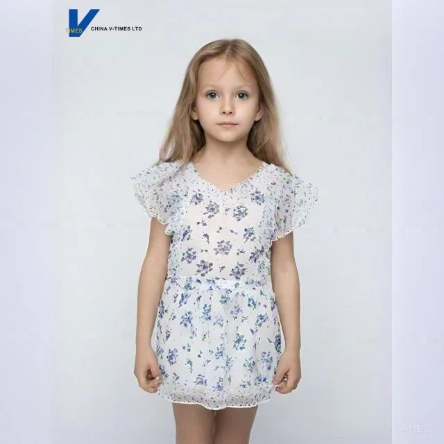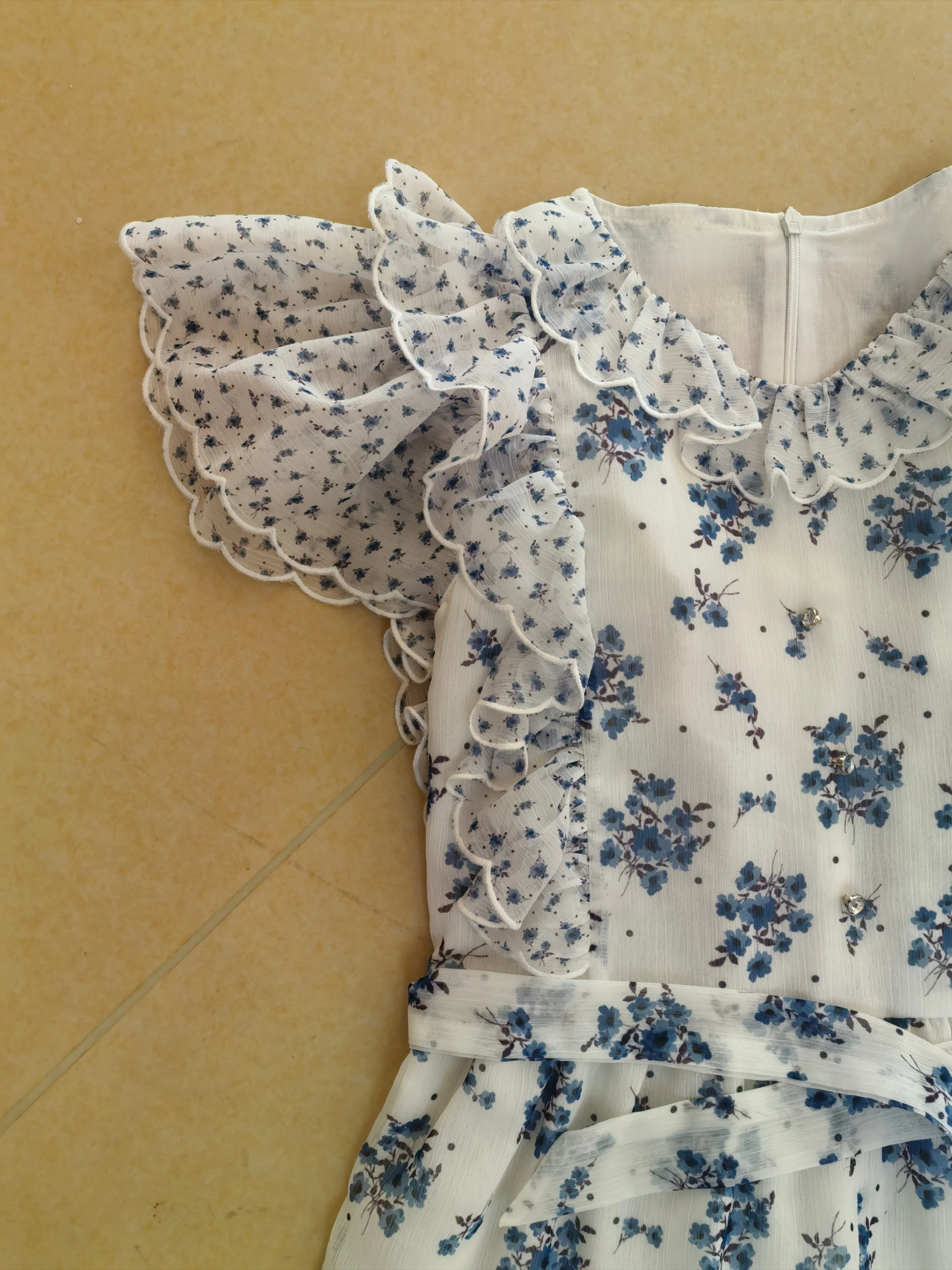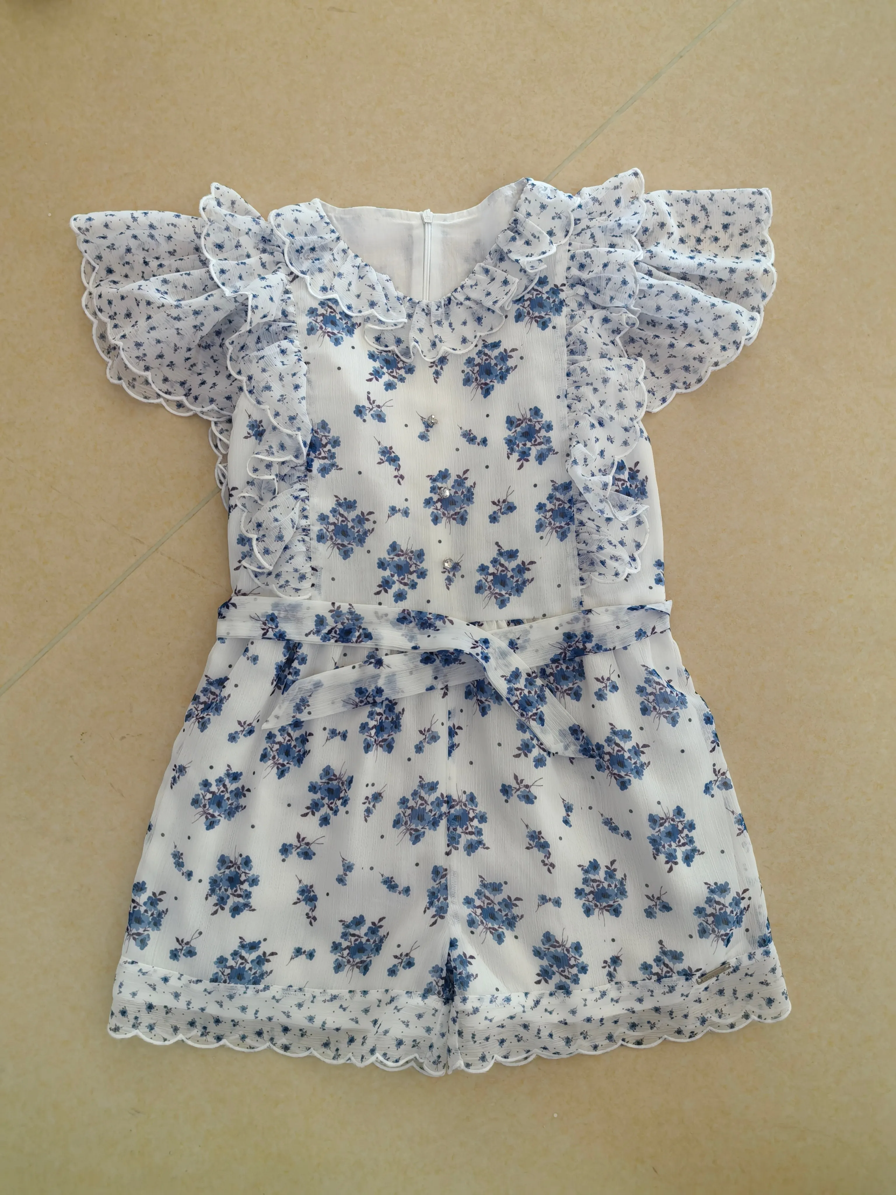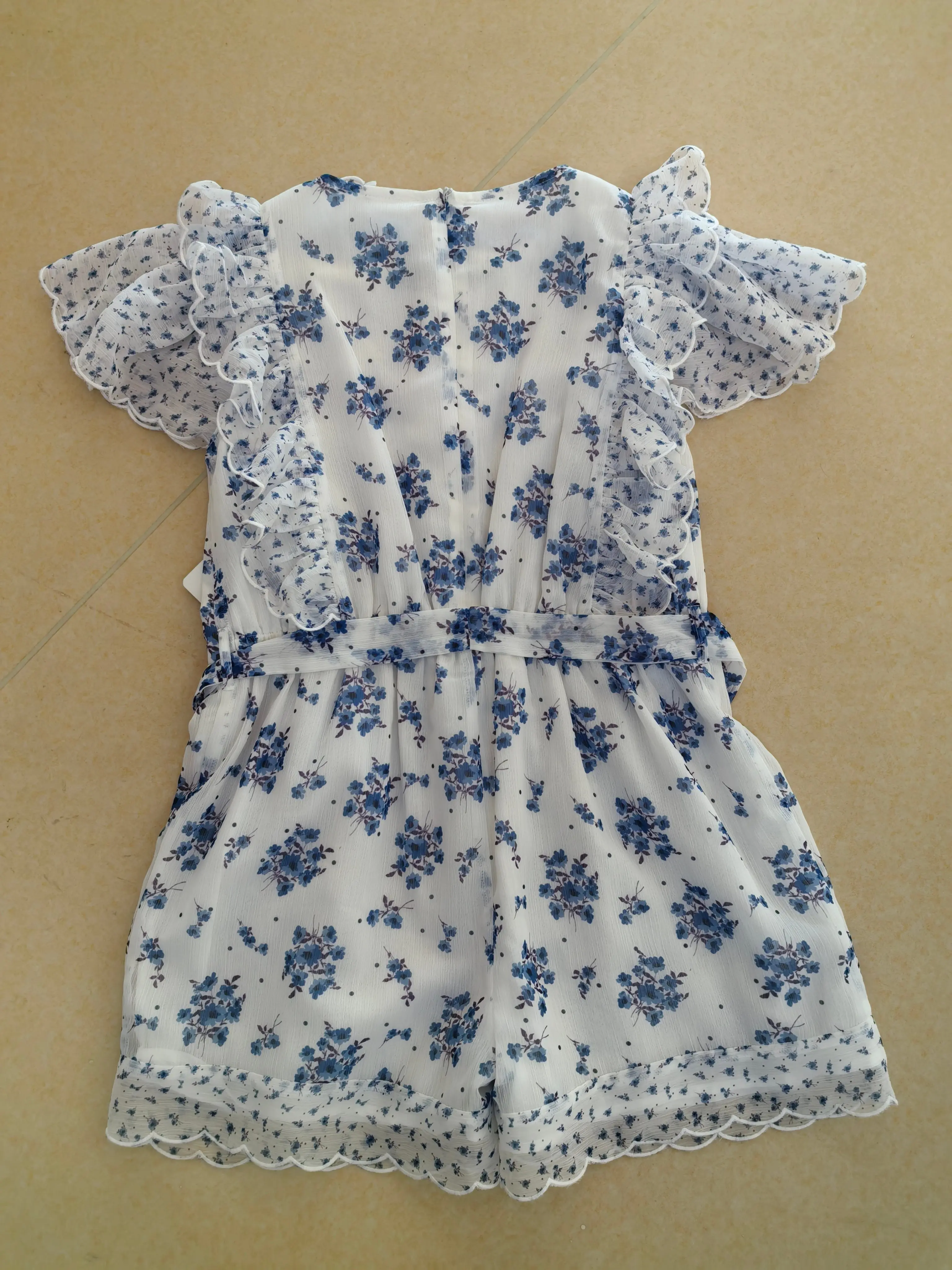 Fresh White Denim Blue Floral Ruffled Collar and Cuff Tied Belt Casual Eco-friendly Girls' Summer Short-Sleeve Jumpsuit