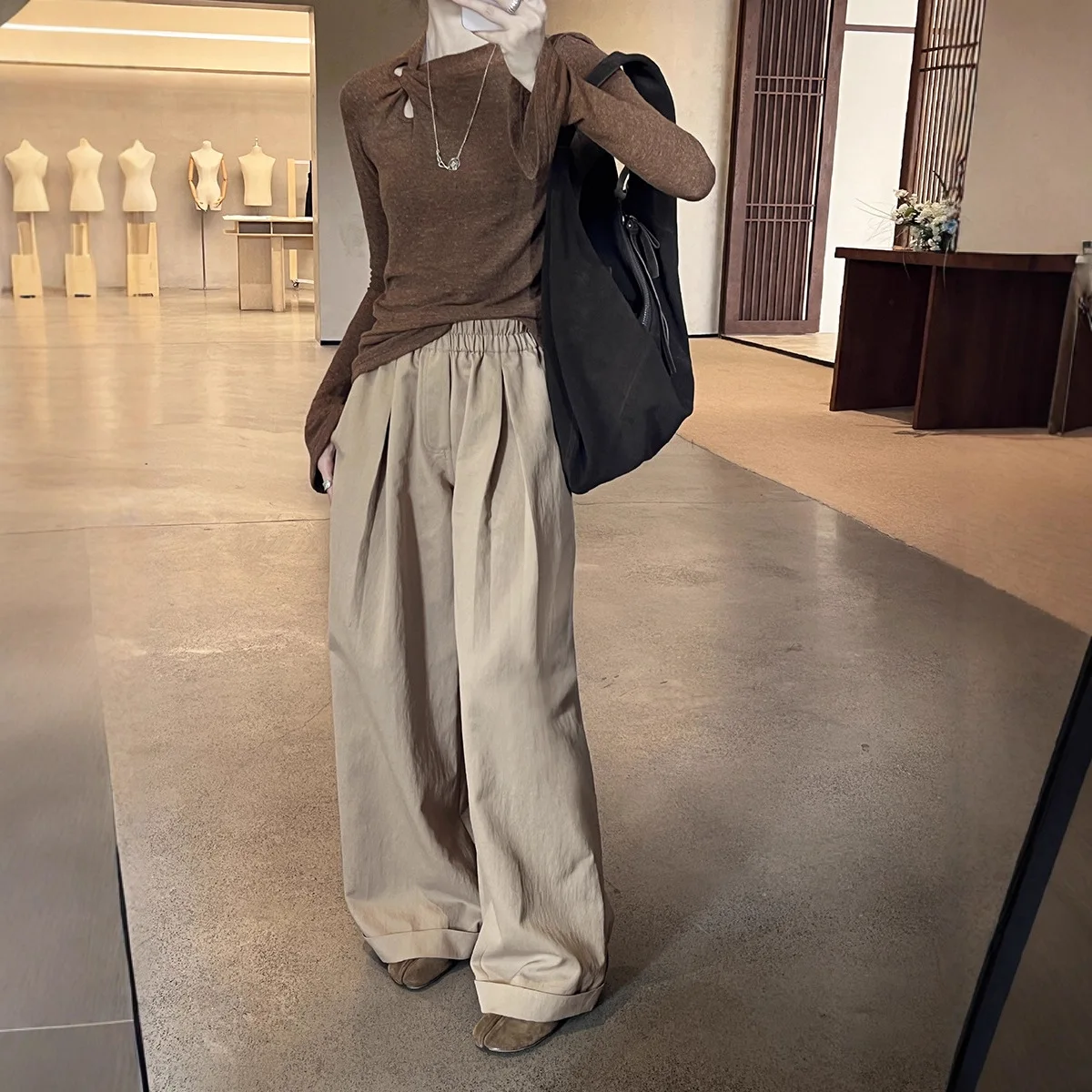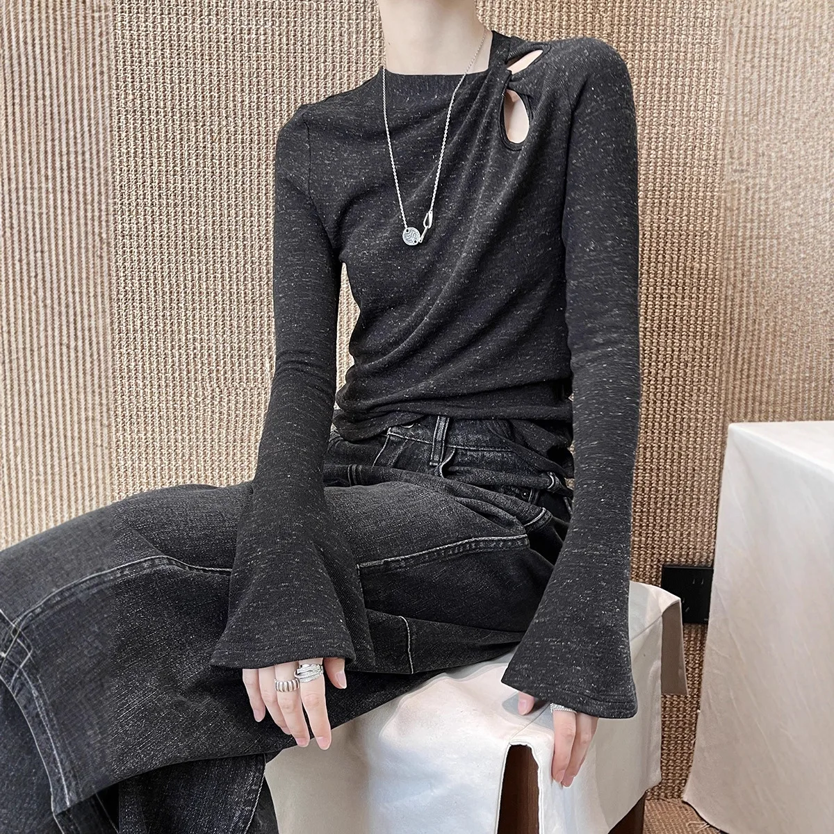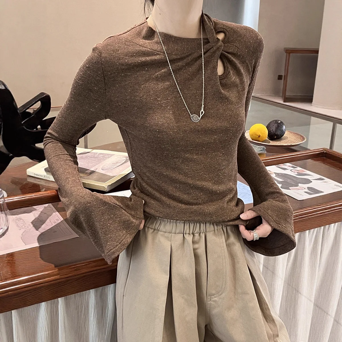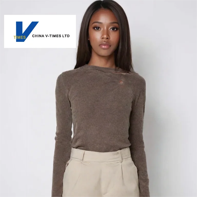 China V-Times Autumn Women's Slim Fit Long Sleeve T-Shirt Sleeve Floral Yarn Twist Design Korean Style Front Logo Knitted