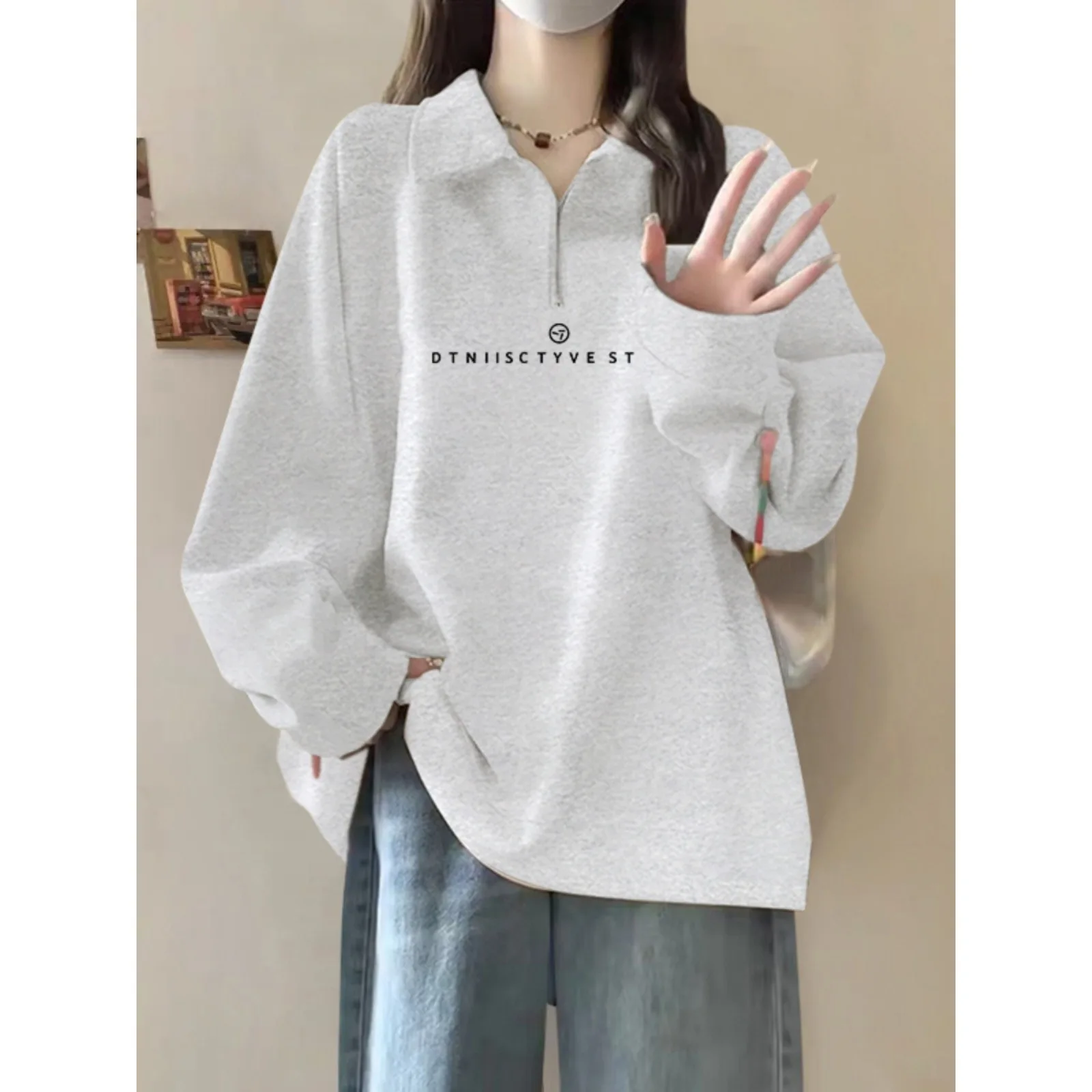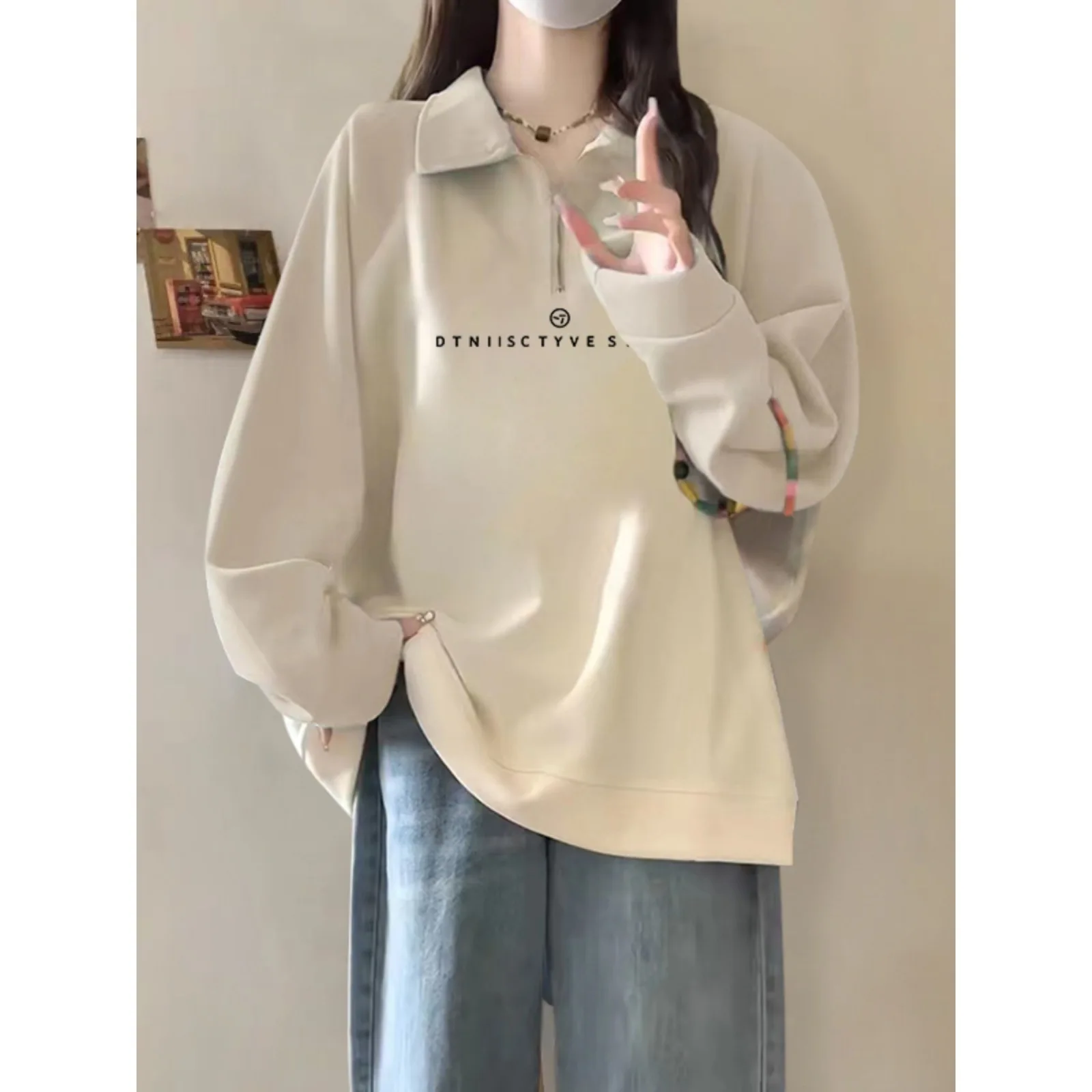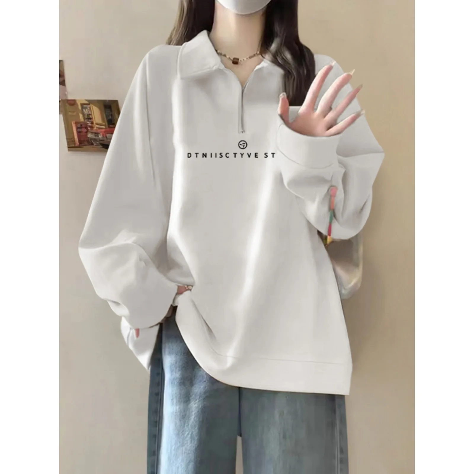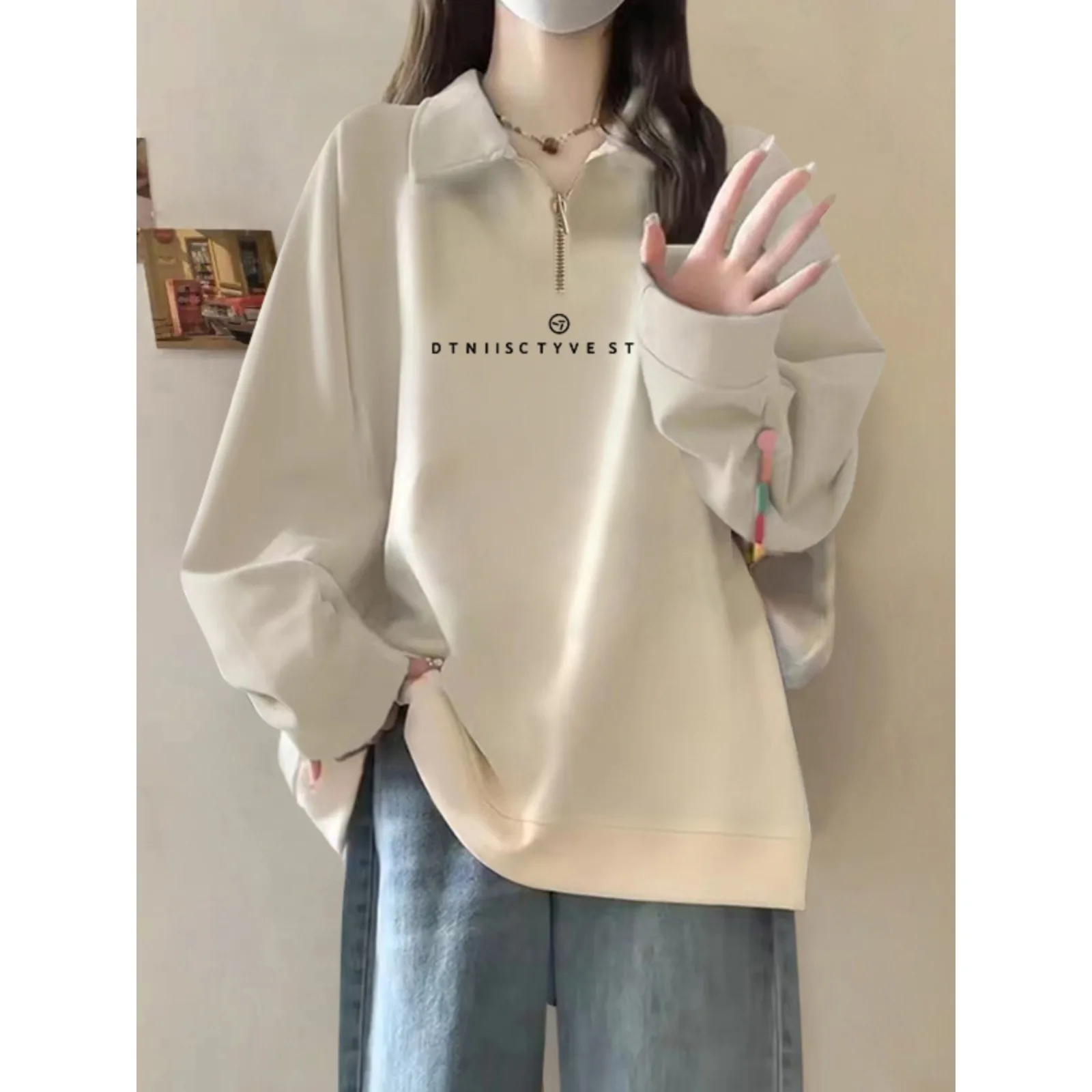 China V-Times Autumn New Style Trendy Letter Print Half-Zip Sweatshirt for Women Thickened Polo Collar Fleece Lining Long Front