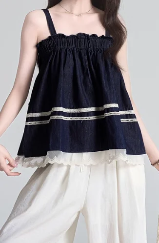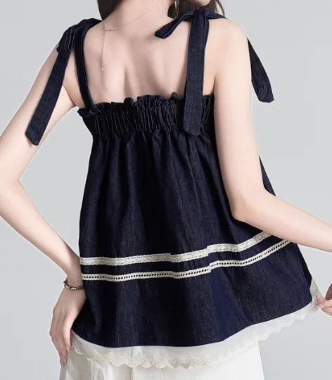 Retro Patchwork Camisole Top - Lace Trim Color Block Lace-Up Bow Summer Women's Blouse