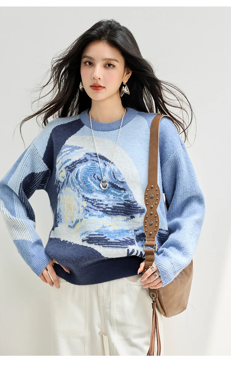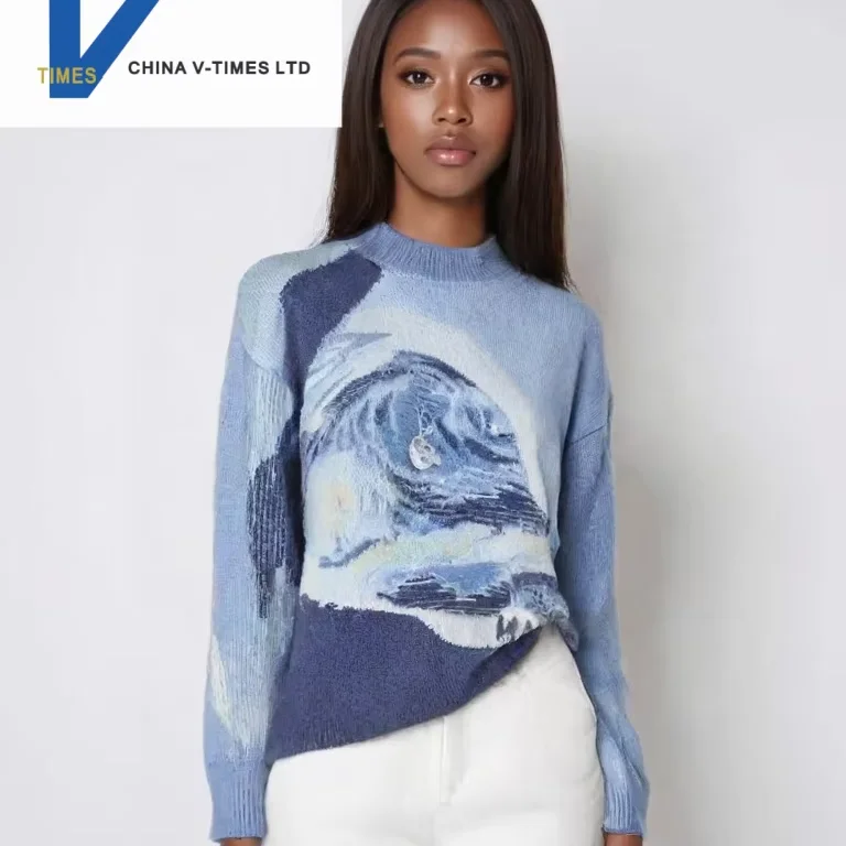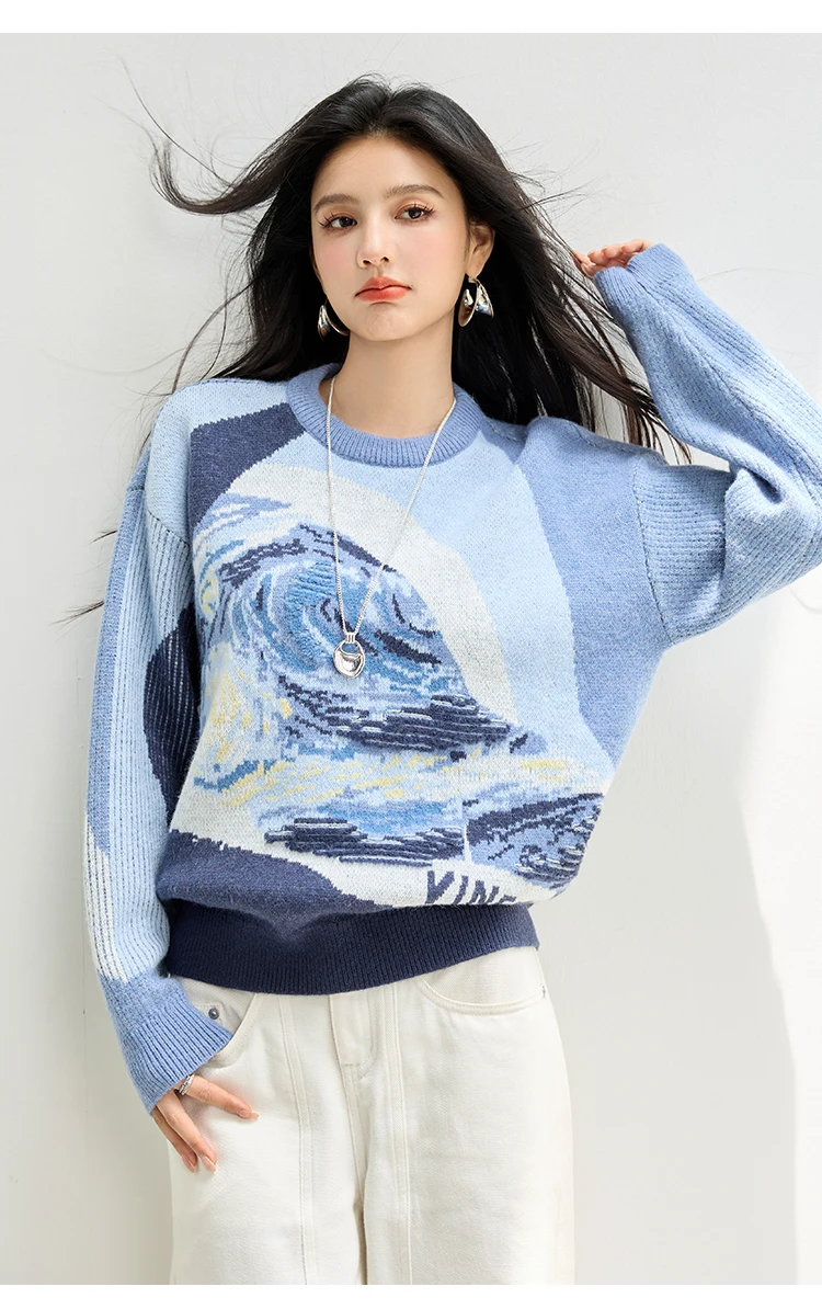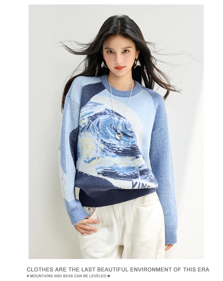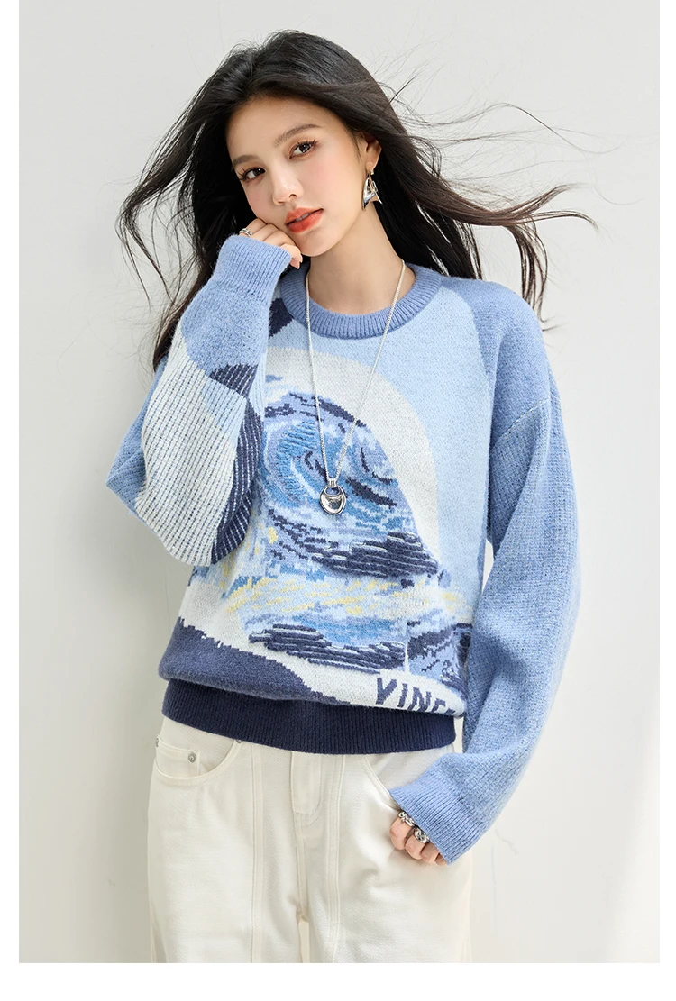 China V-times 2026 Autumn New Women's Elegant Loose Jacquard Knit Sweater Round Neck with Long Length