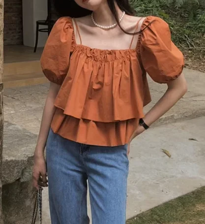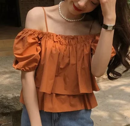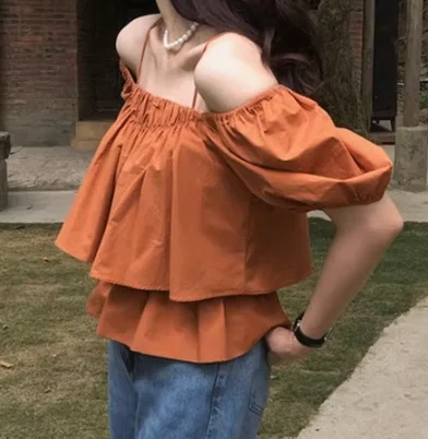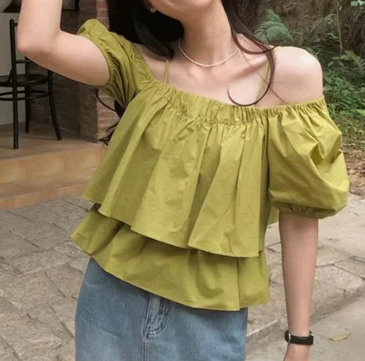Women's Summer One-Shoulder Puff-Sleeve Camisole Babydoll Top for Short-Sleeve Off-Shoulder Blouse Solid Loose