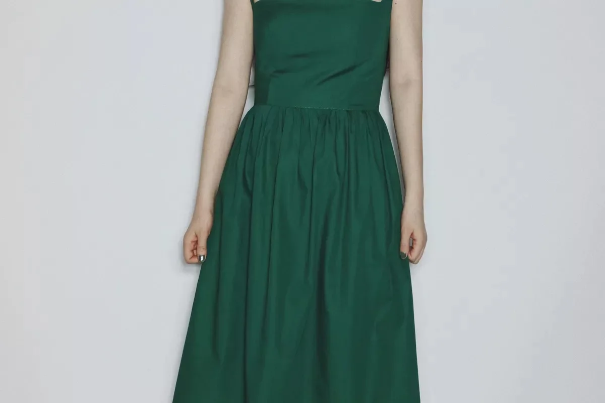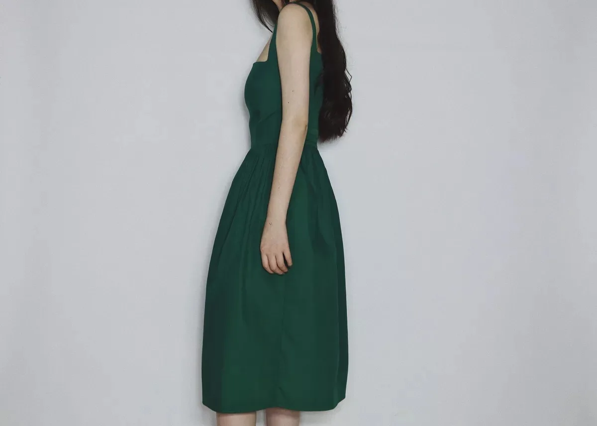 Original Retro Summer Dress Dark Green Strap Off-Shoulder Long Dress High Waist Pleated 100% Cotton Casual Chiffon Plain Dyed
