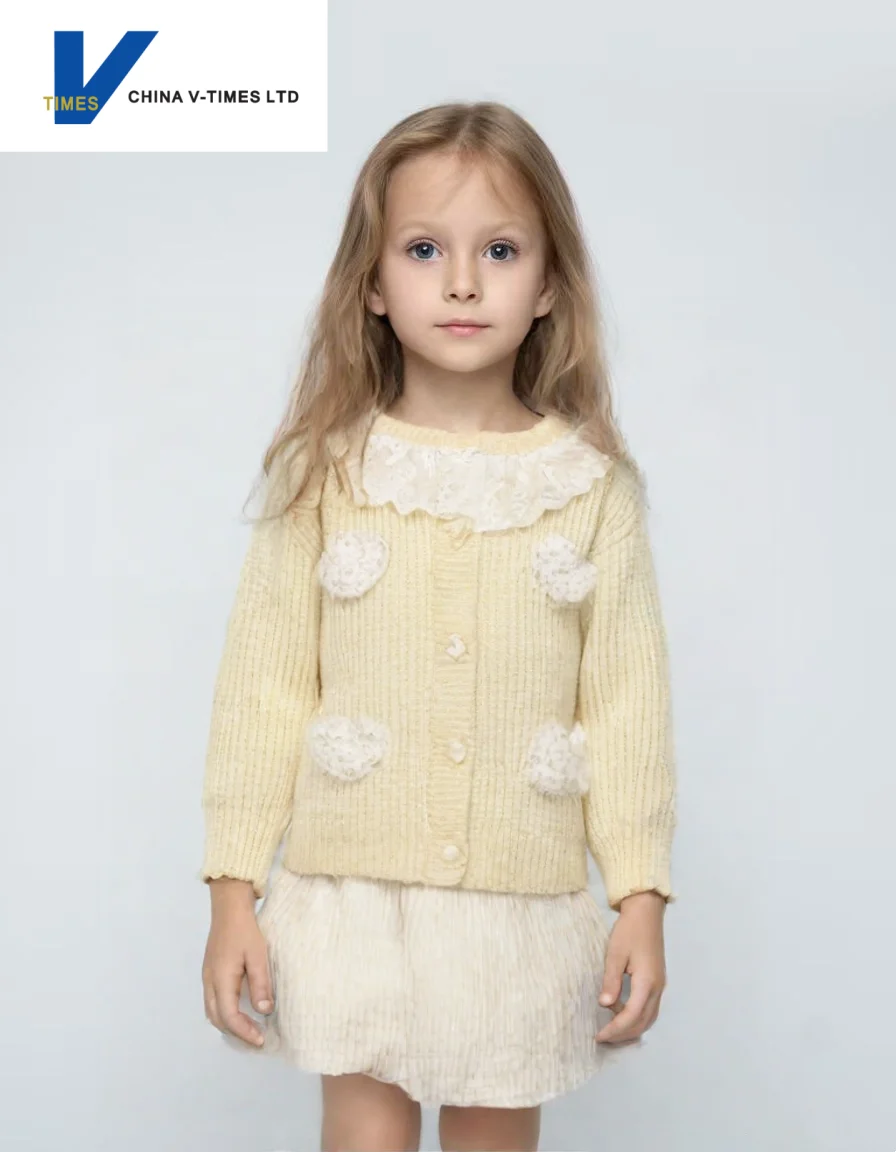 China V-Times 2026 Girls' Casual Style Sweater Trendy Cardigan Jacket for Spring Autumn New Children's Knitwear Clothing