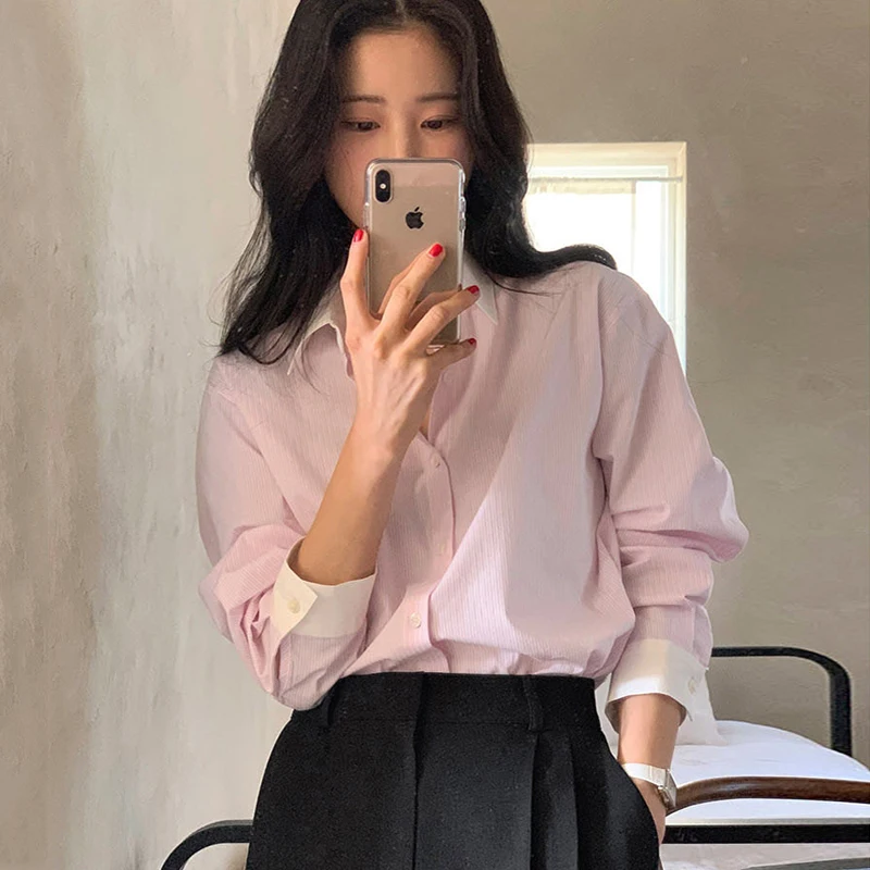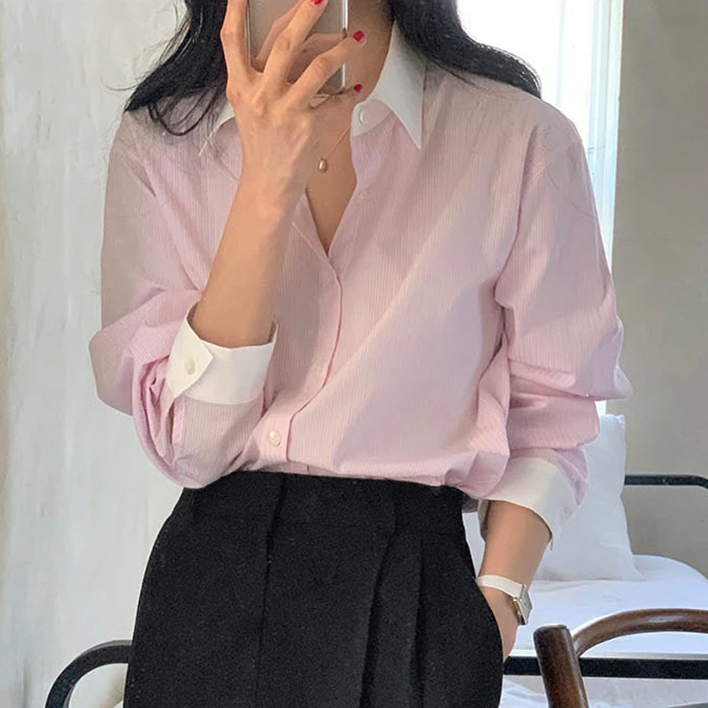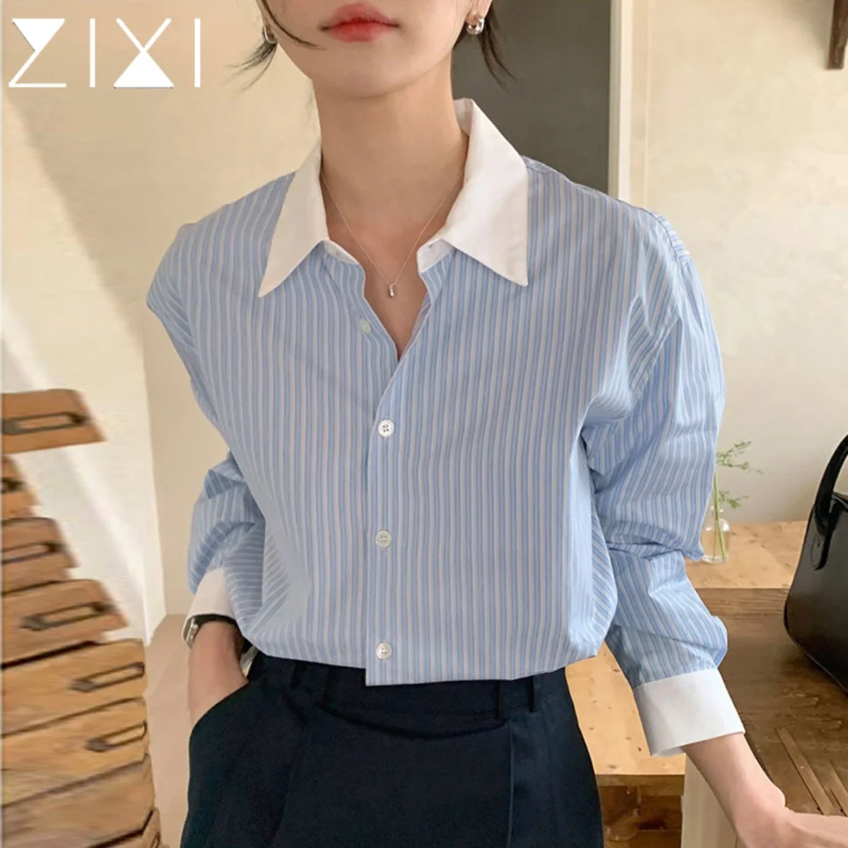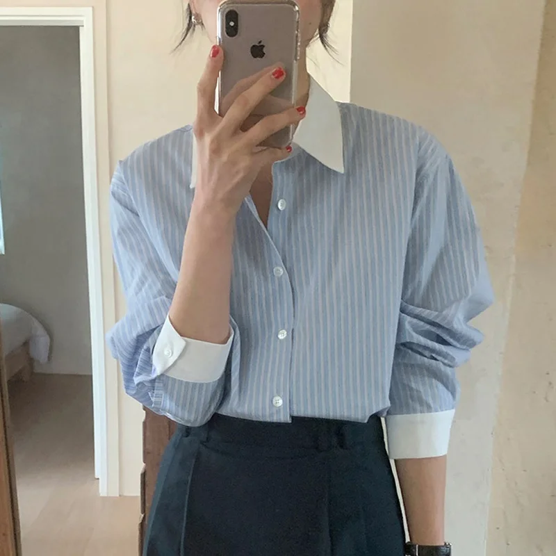 Blue Striped Casual Long-Sleeved White-Collar Shirt for Women Spring New Korean Style Petite Commuter Color-Blocking Patchwork