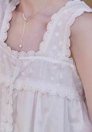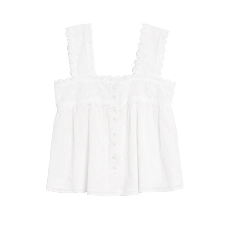 Summer French-Style White Camisole Top for Women Square-Neck Wide-Strap Delicate Lace Pure Cotton Knitted Short