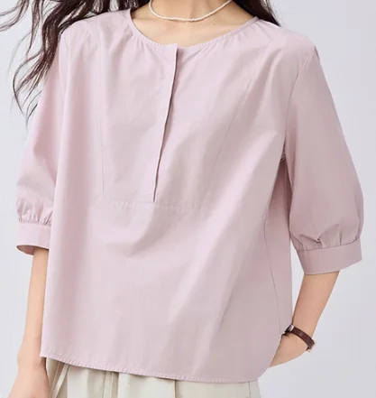 Women's Summer Casual Shirt Pure Cotton Poplin Round Neck Half-Open Front Mid-Sleeve Woven Simple Fashion