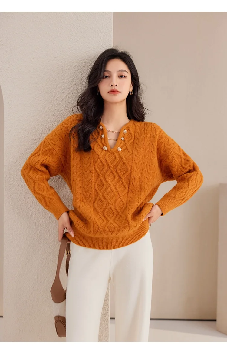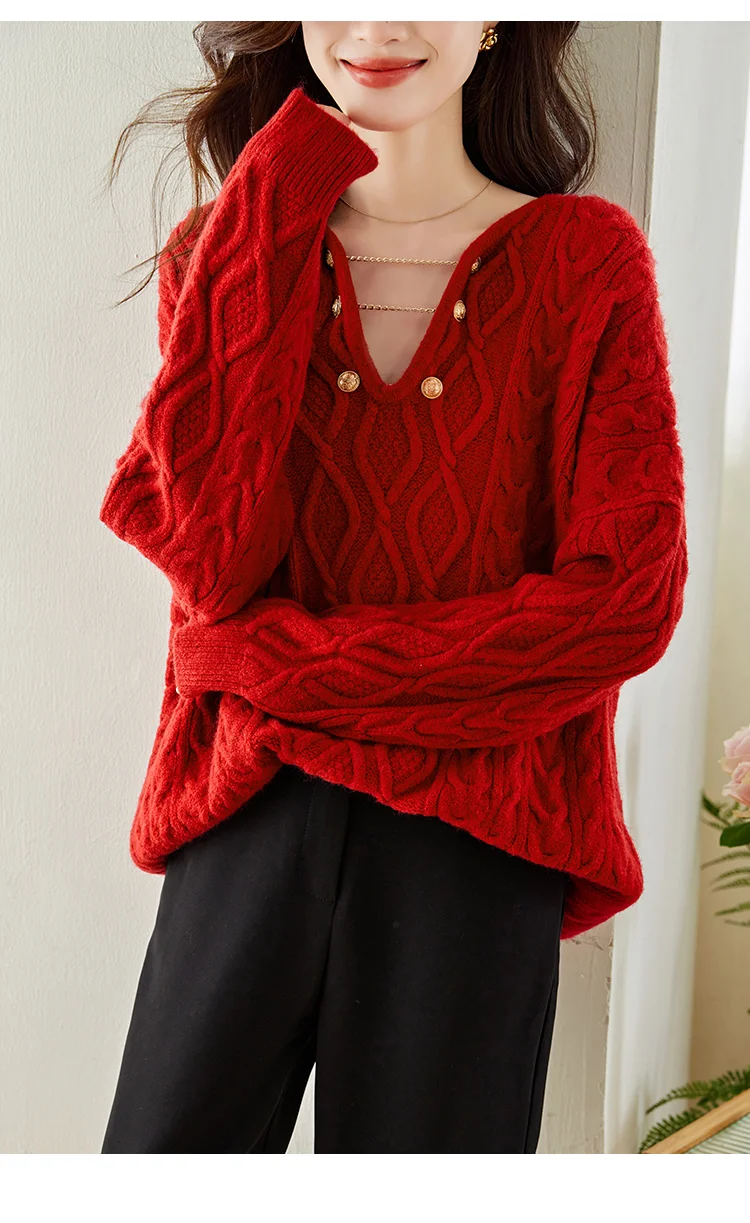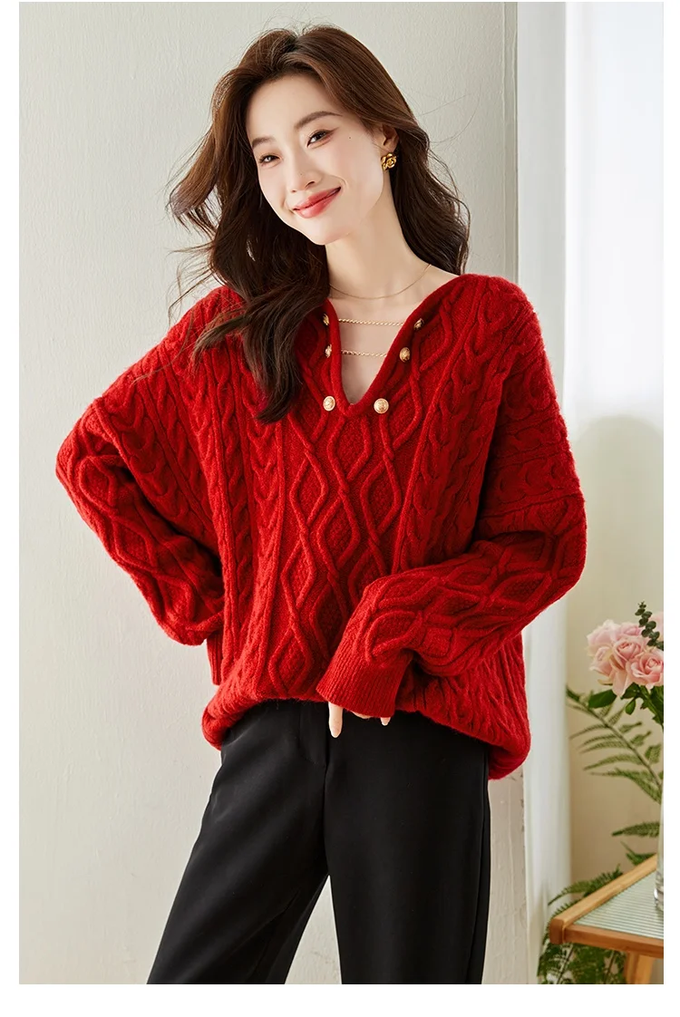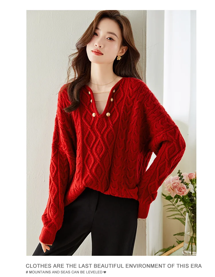 China V-times Autumn New Korean Style Red V-Neck Knitted Pullover Sweater for Women Long Sleeve with Front Logo