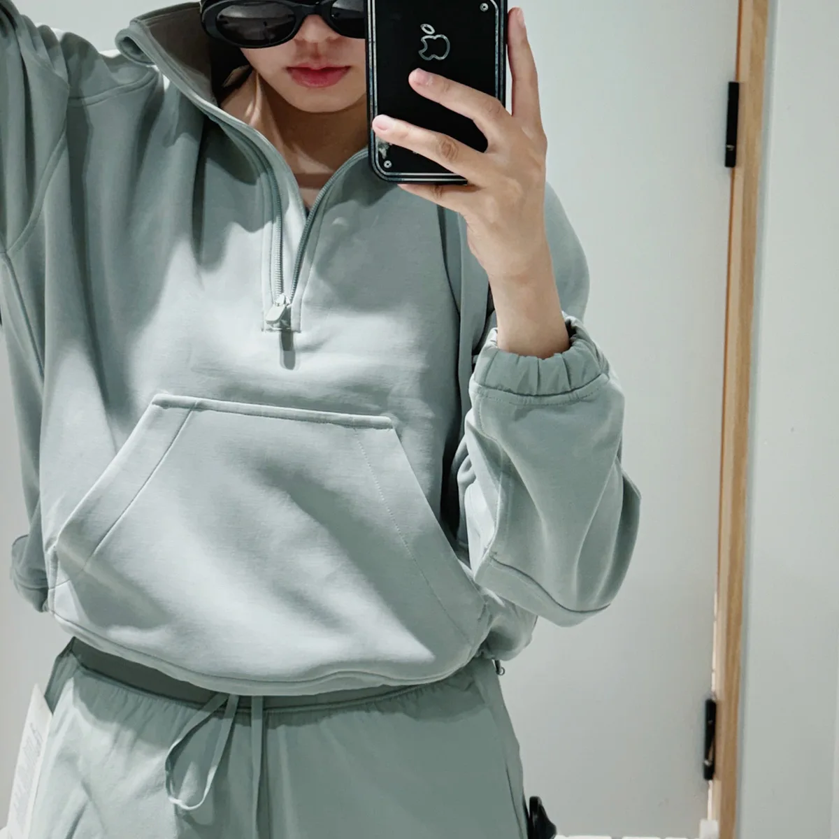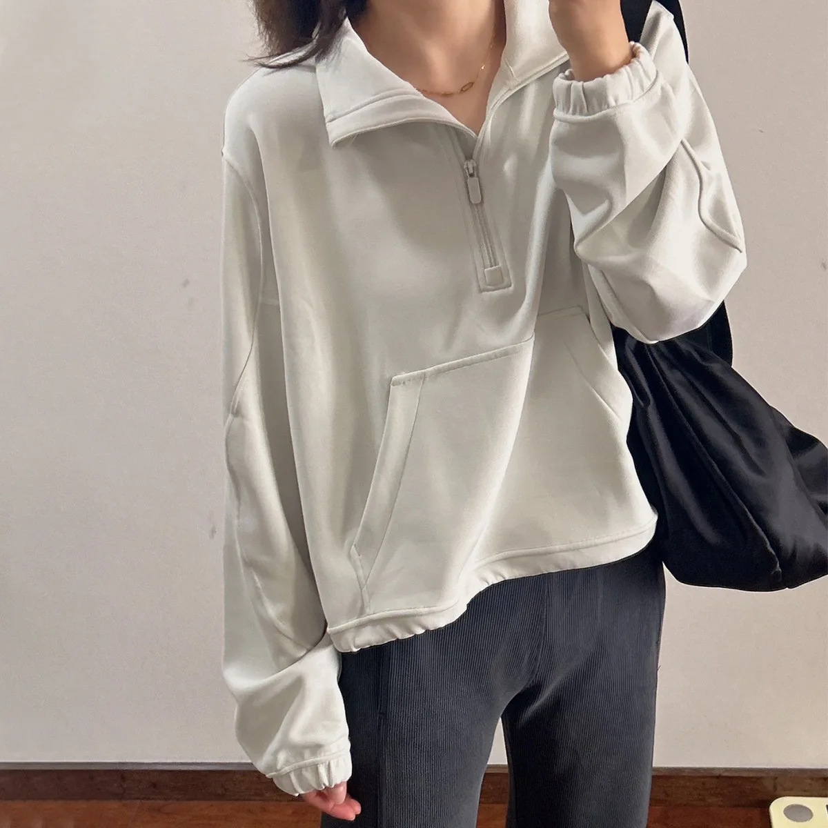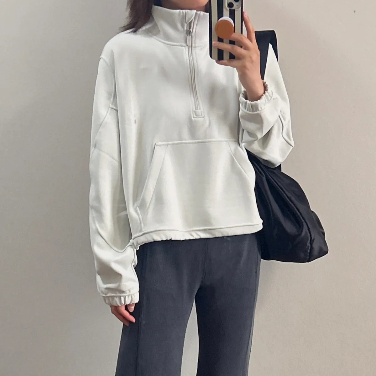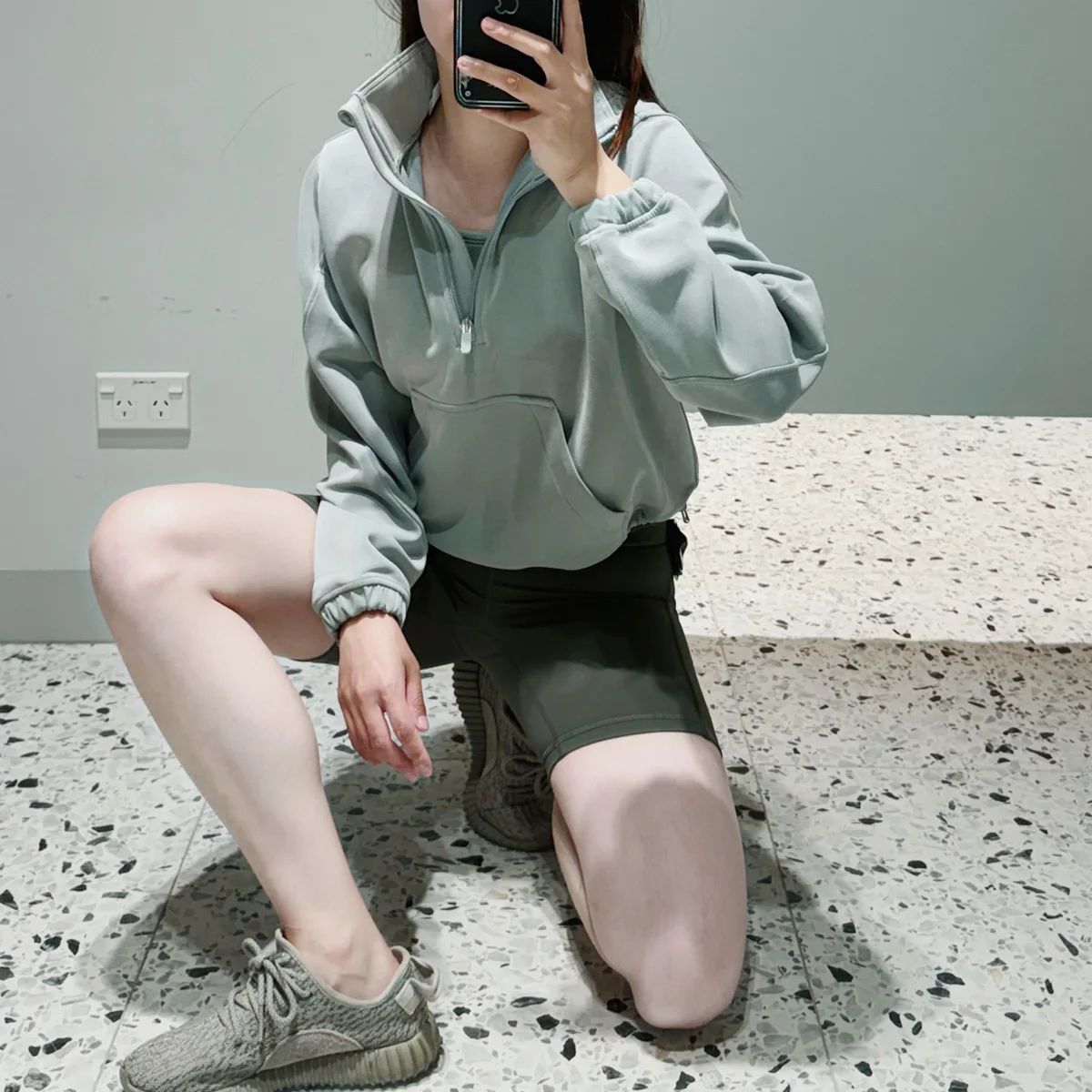 Women's Loose Fit Sports Running Fitness Top Spring Autumn Stand Collar Half-Zip Drawstring Waist Sweatshirt Casual Knitted