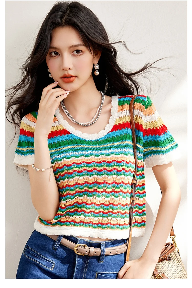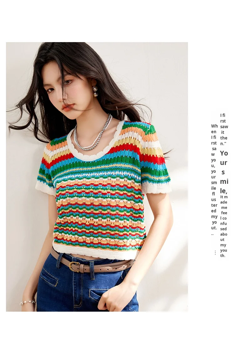 China V-times 2026 Summer New Design Casual Women's Top Color-Blocked Striped Hollow-Out Short-Sleeve Knit Top with Front Logo