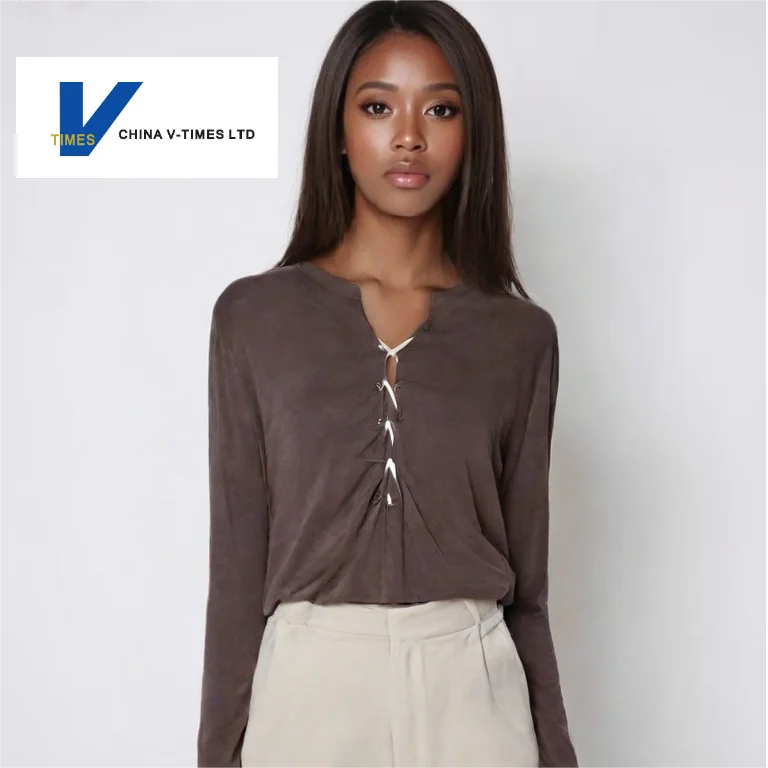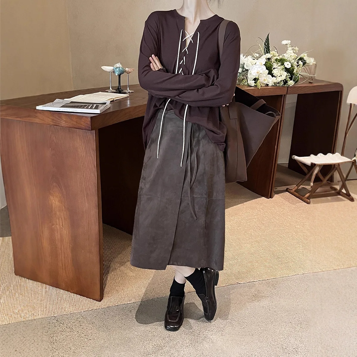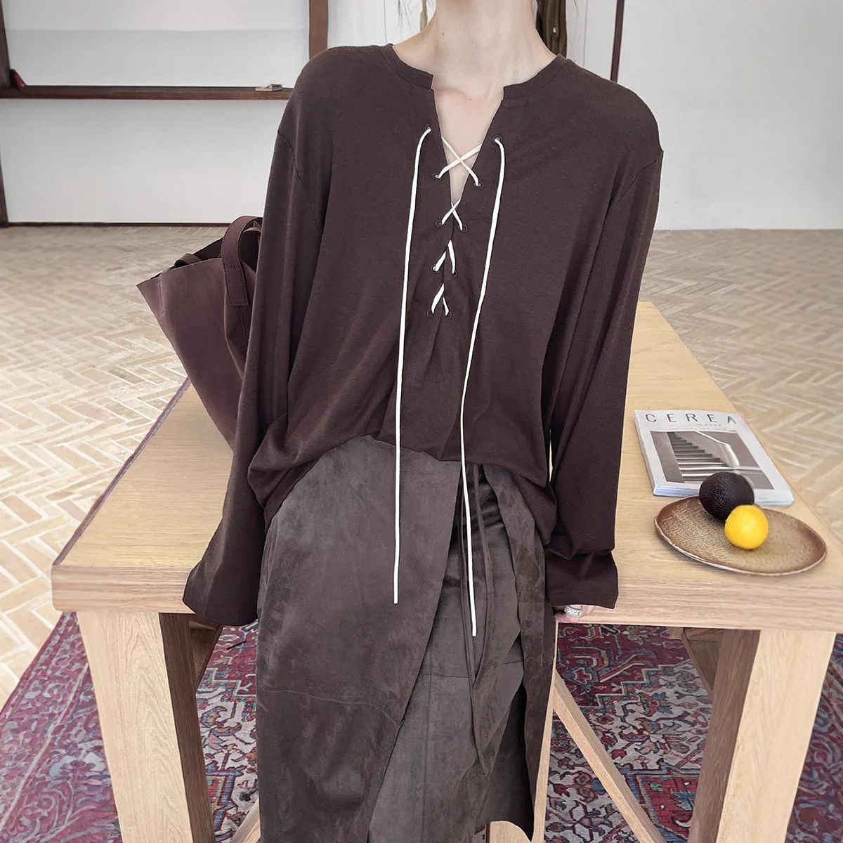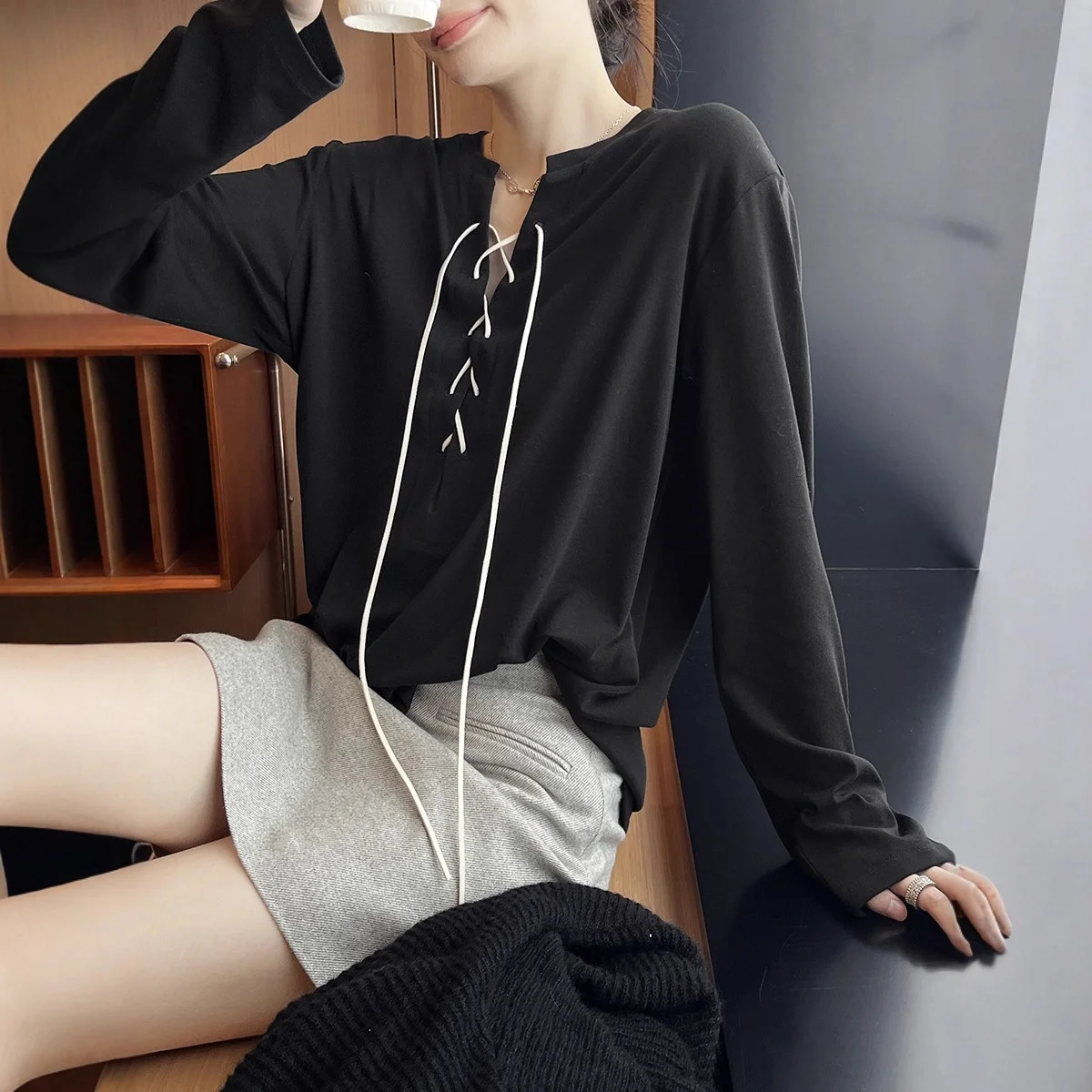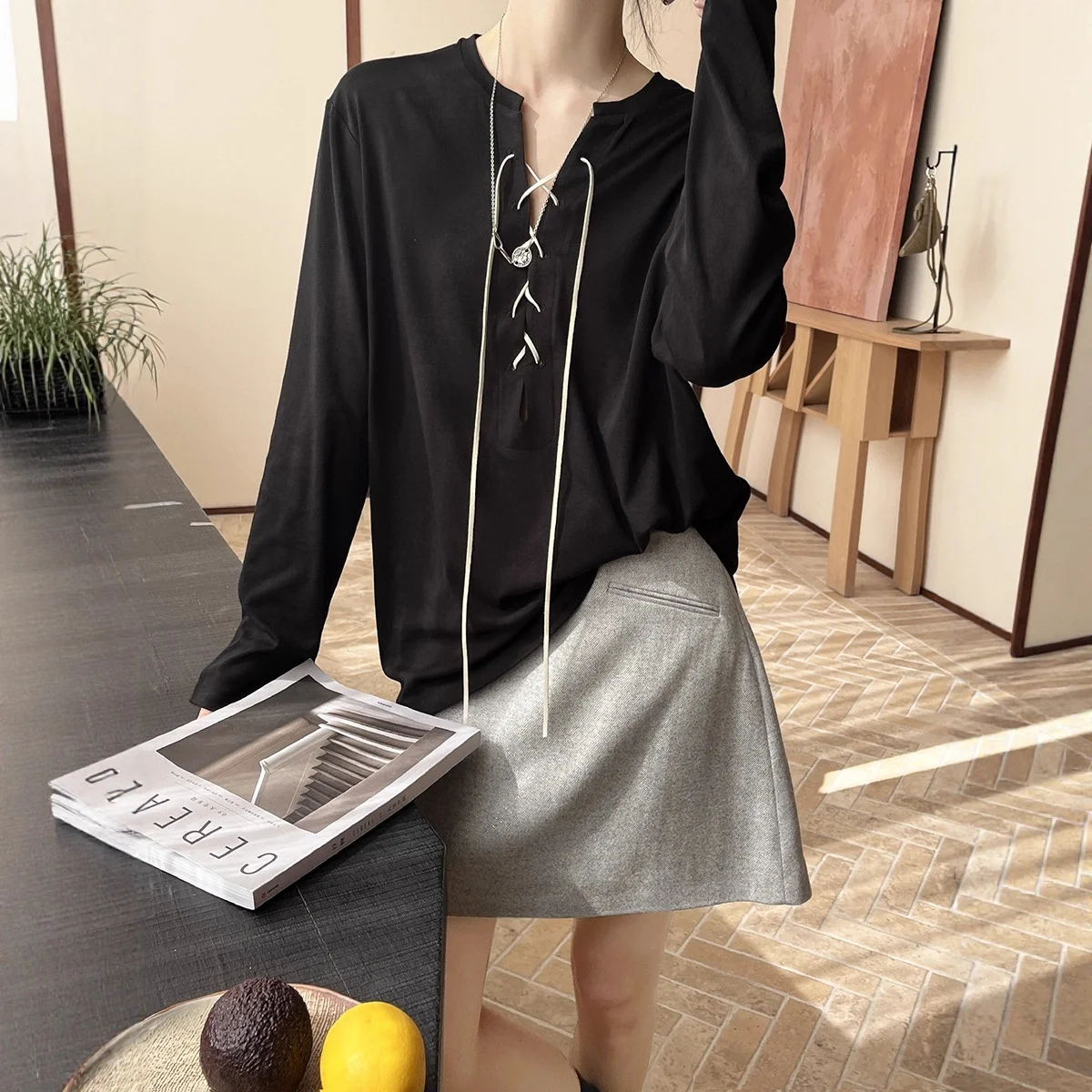 Women's 2026 Autumn/Winter Casual T-Shirt New Design Simple V-Neck Tie Long Sleeve Knitted Anti-Pilling
