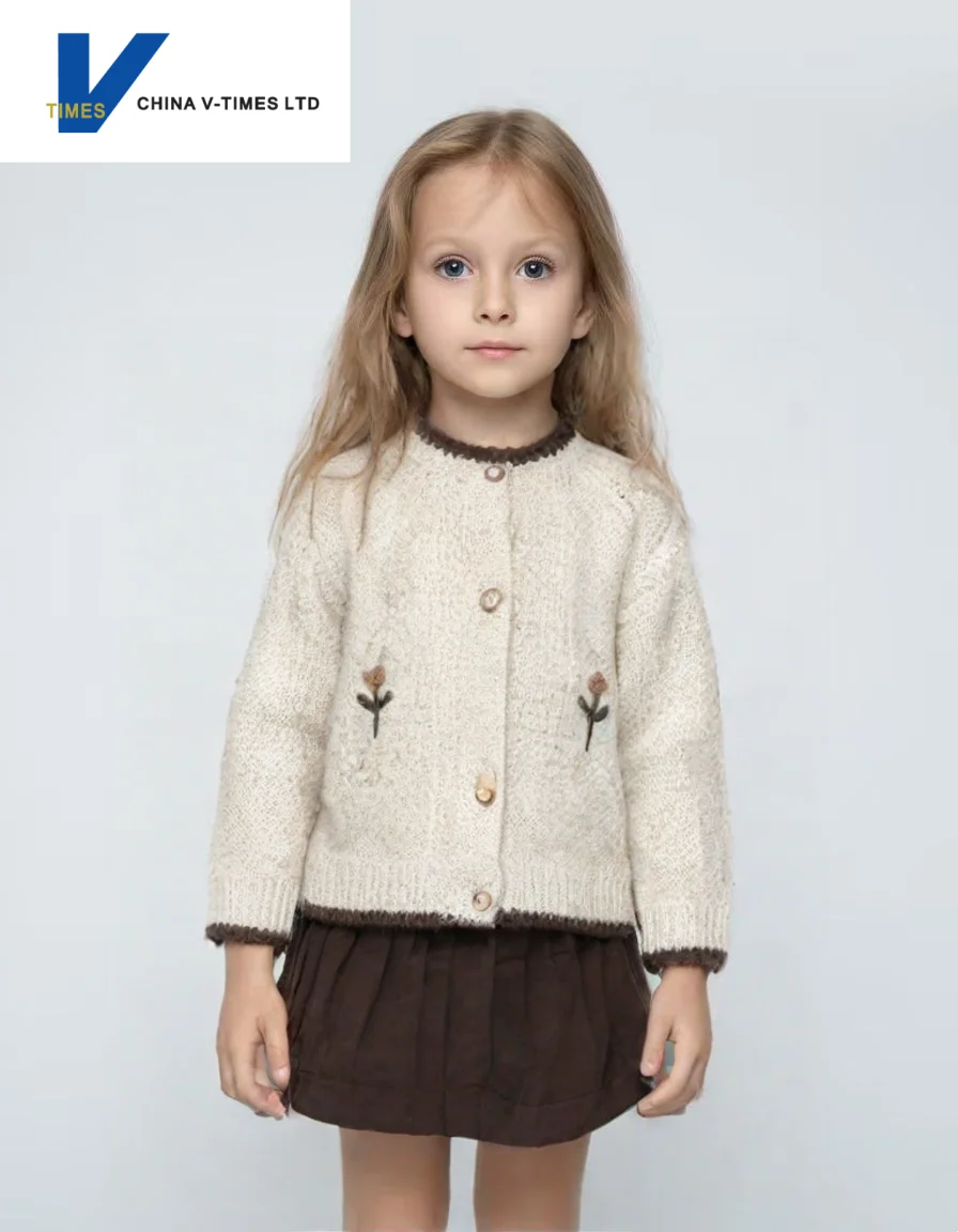 China V-Times 2026 Girls' Autumn Cardigan New Stylish Knitted Sweater for Spring & Fall Baby Children's Clothing