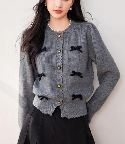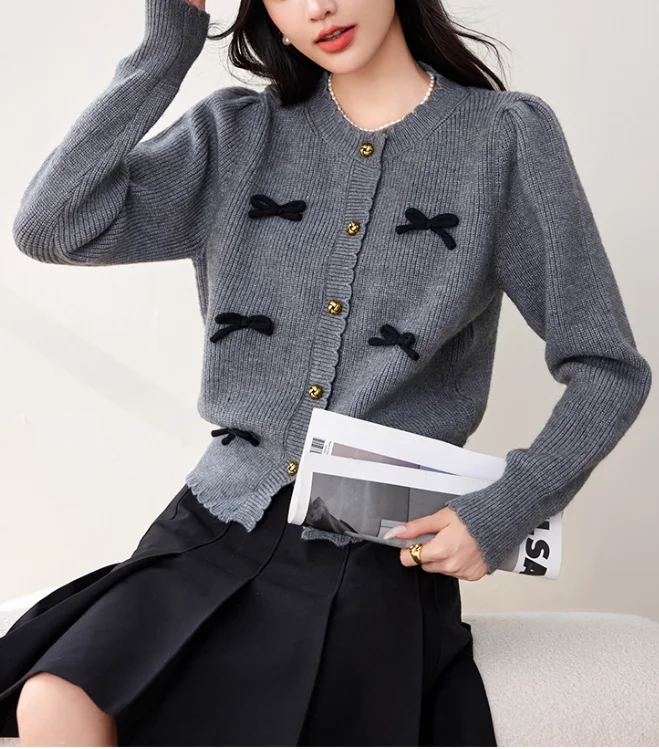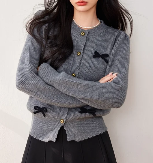 China V-times 2026 Autumn New Design French Style Gray Bow Knitted Cardigan for Women Loose Long Sleeve Top Solid Pattern Casual