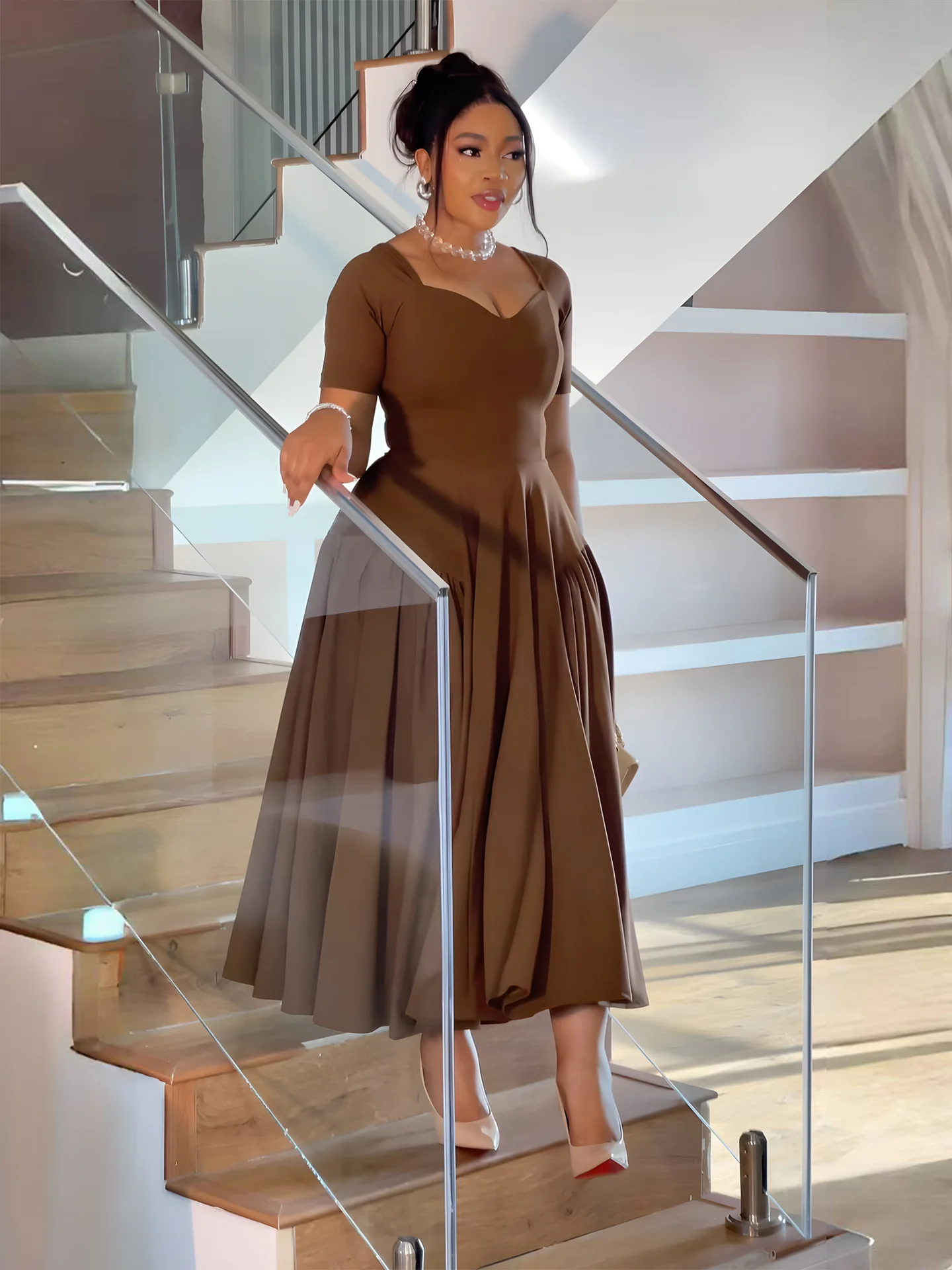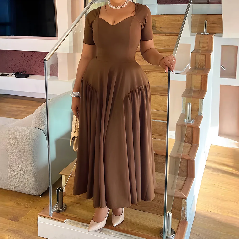 Summer Double Side Splicing Ruched Pleated Women V Neck Short Sleeve A-line Maxi Regular Fit Solid Spring Autumn Casual Dress
