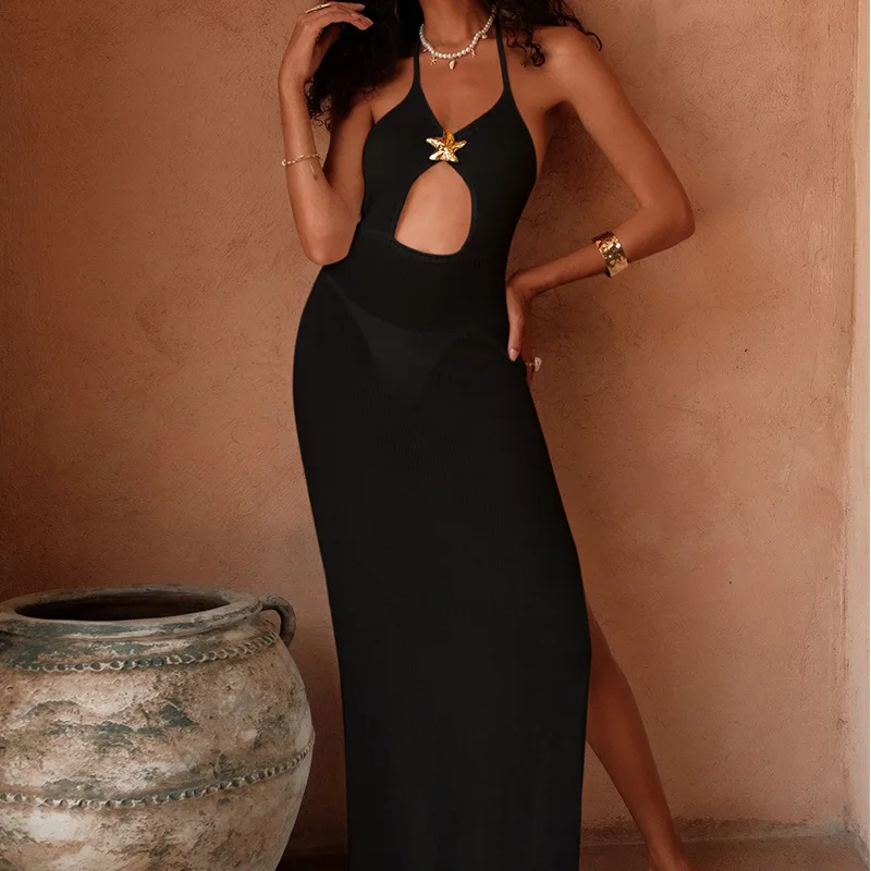 STOCK 3 Colors Summer Natural see through Anti-Static Cut Out Knitted Women Maxi Dress Backless Slit Cover Up Beachwear Swimwear