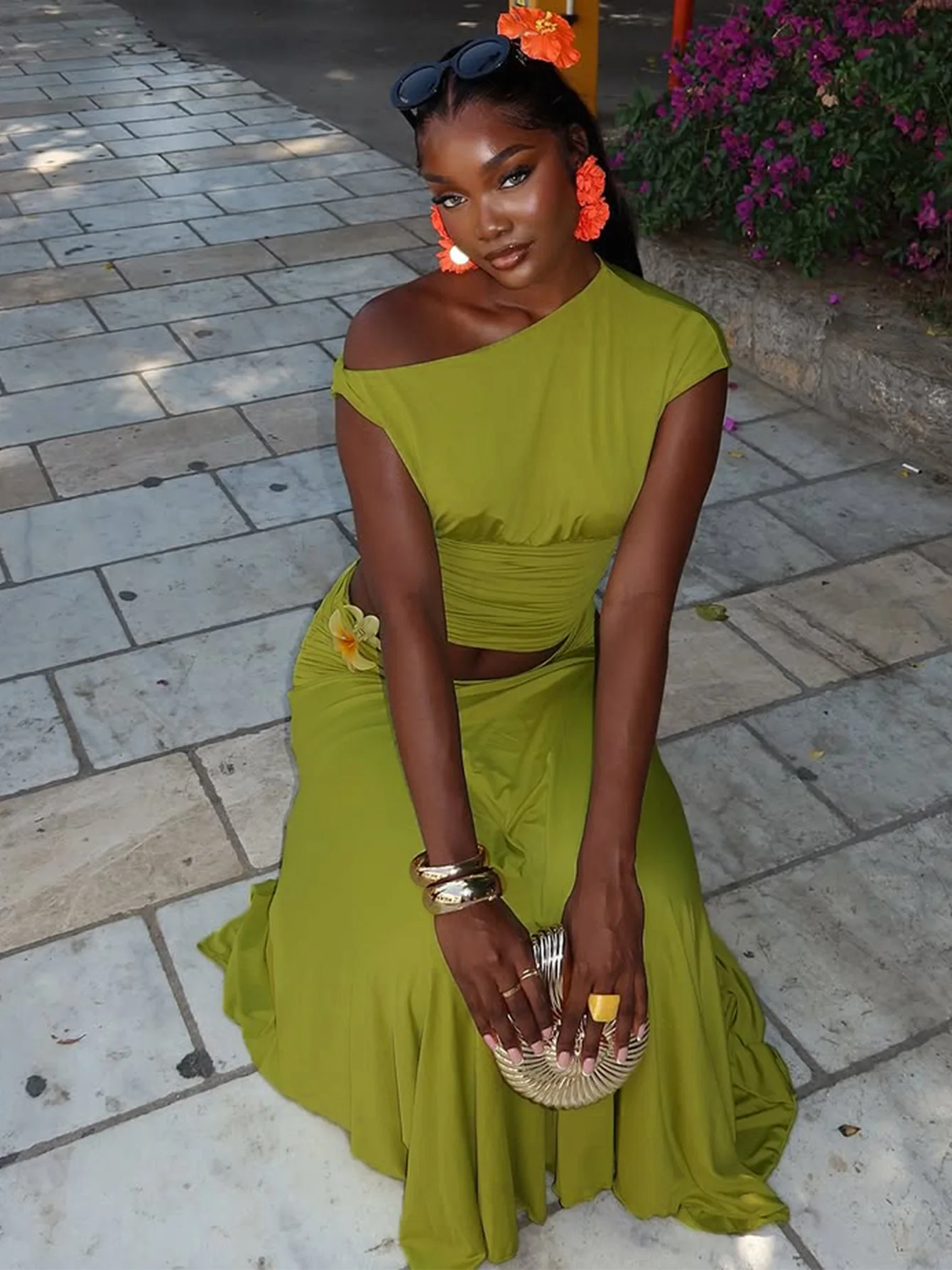 ZYHT 73903 Gemstone Crystal 3D Flower Decoration Ruched One Shoulder High Slit Long Sleeve Maxi Simple Elegant Evening Dress