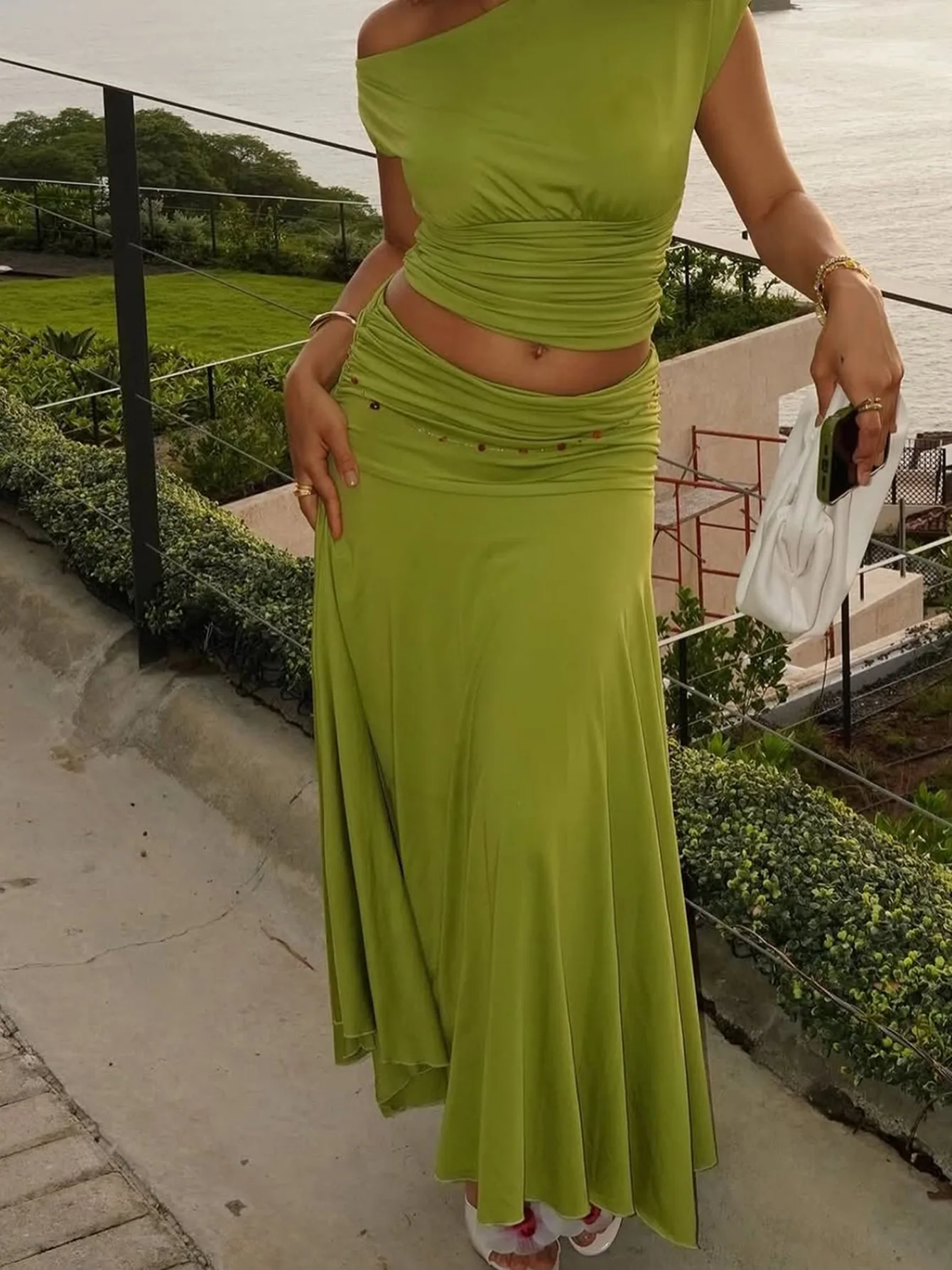 Popular Women's Solid Halter Neck Two-Piece Set Short Sleeve Top & Long Skirt Knitting Woven Beach Outfit Sizes