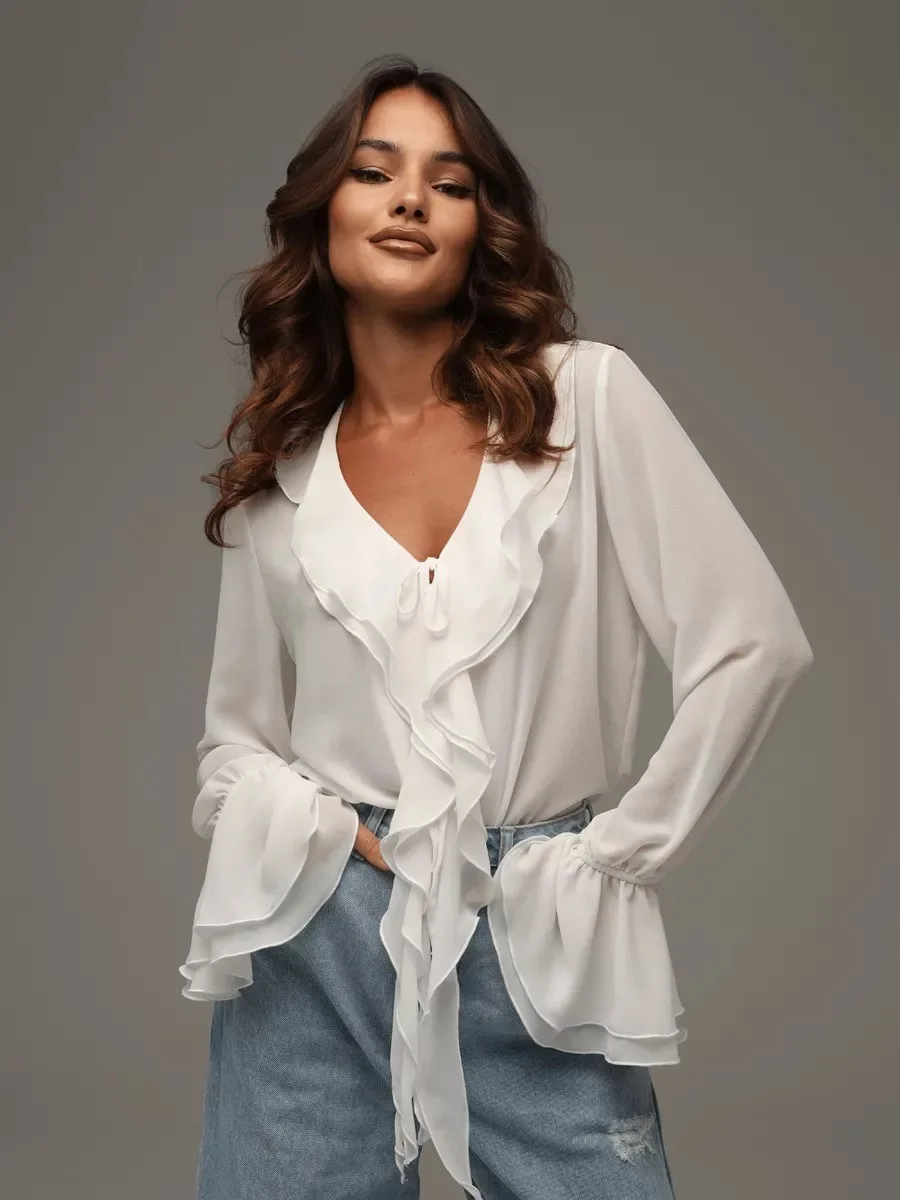 White Chiffon Tie Shirts Women's Solid Color Long Sleeve Lotus Leaf V-neck Eco-Friendly Breathable Horn Spring Summer Outwear