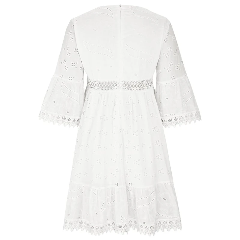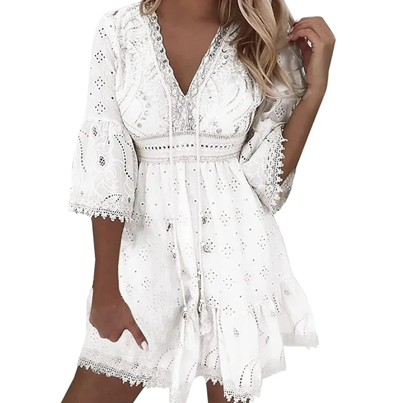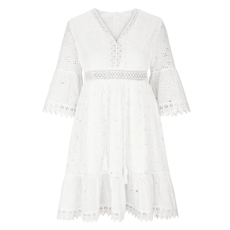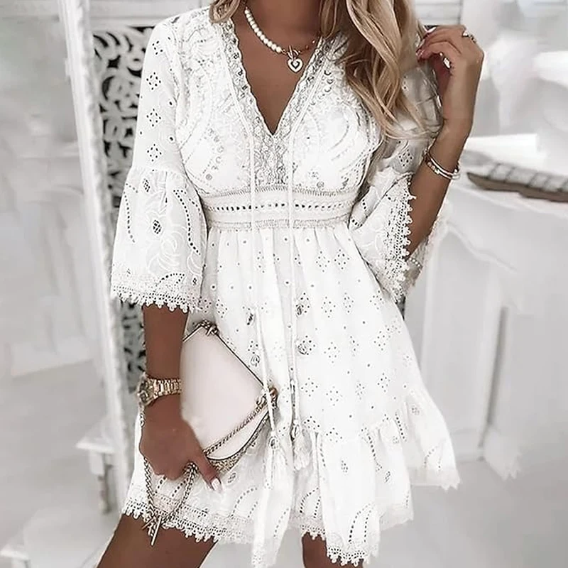 2026 Plus Size White v Neck Short Sleeve Hollow Out Tassel Lace Embroidery Vestidos Women Elegant Summer Casual Dresses