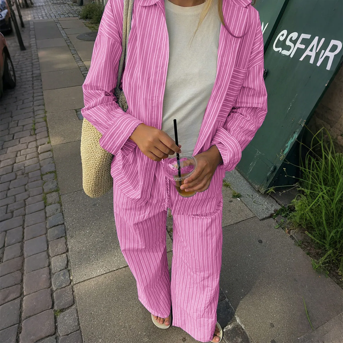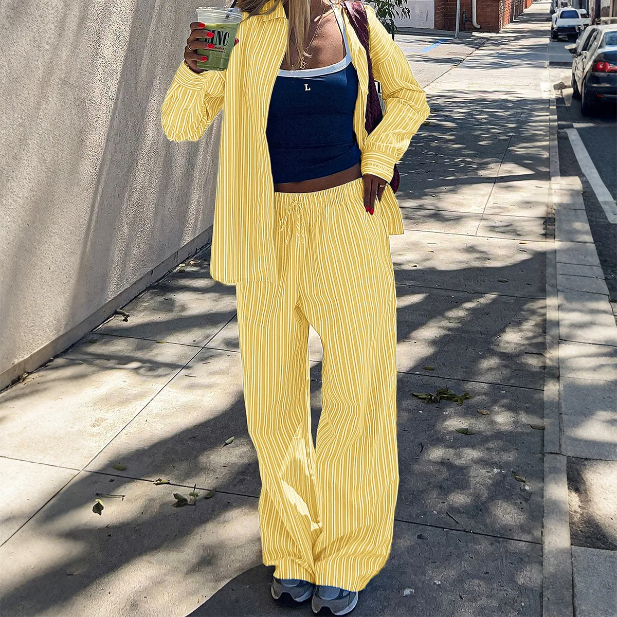New arrivals fall Women's 2 Piece Outfit Striped long sleeve Button Down Shirt and Wide Leg Long Pants Set