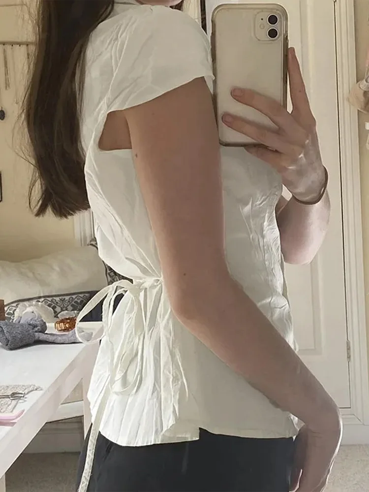 Fashion women shirts blouses and tops turn down collar button short sleeve With a belt white blouse