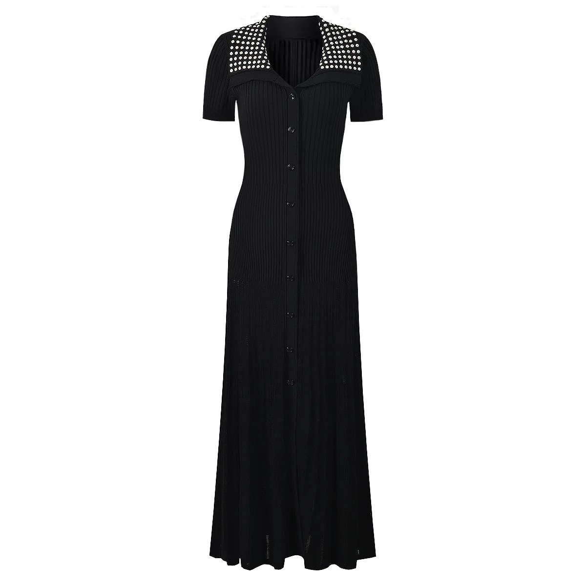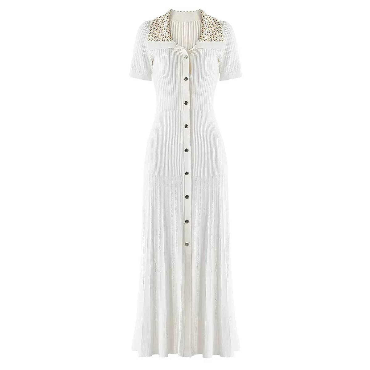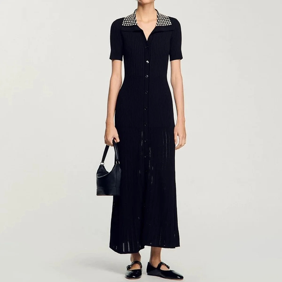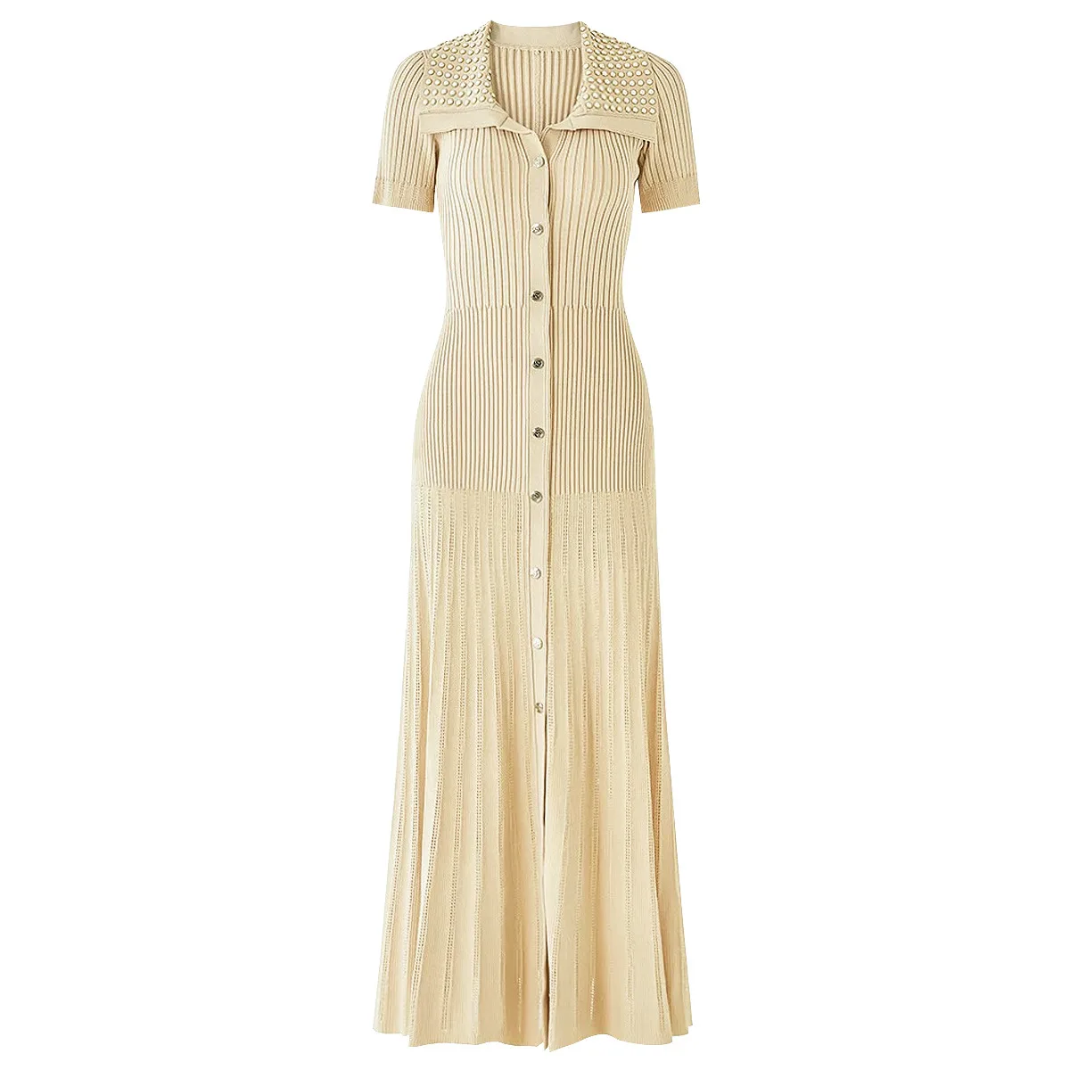 Button Lapel Slim Fit Long Maxi for Women Elegant Casual Polo Rib Knitted Short Sleeves Ruffles Wholesale Sweater