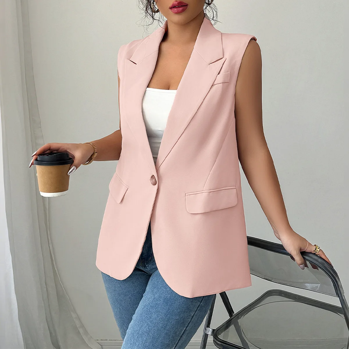 Womens Sleeveless Blazer Vest Open Front Lightweight Casual Blazer Fashion Work Office Waistcoat Vest with Pockets