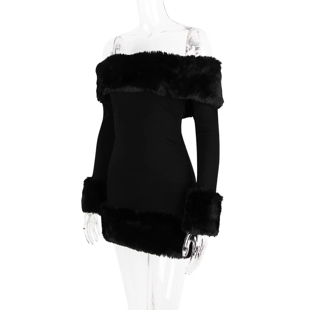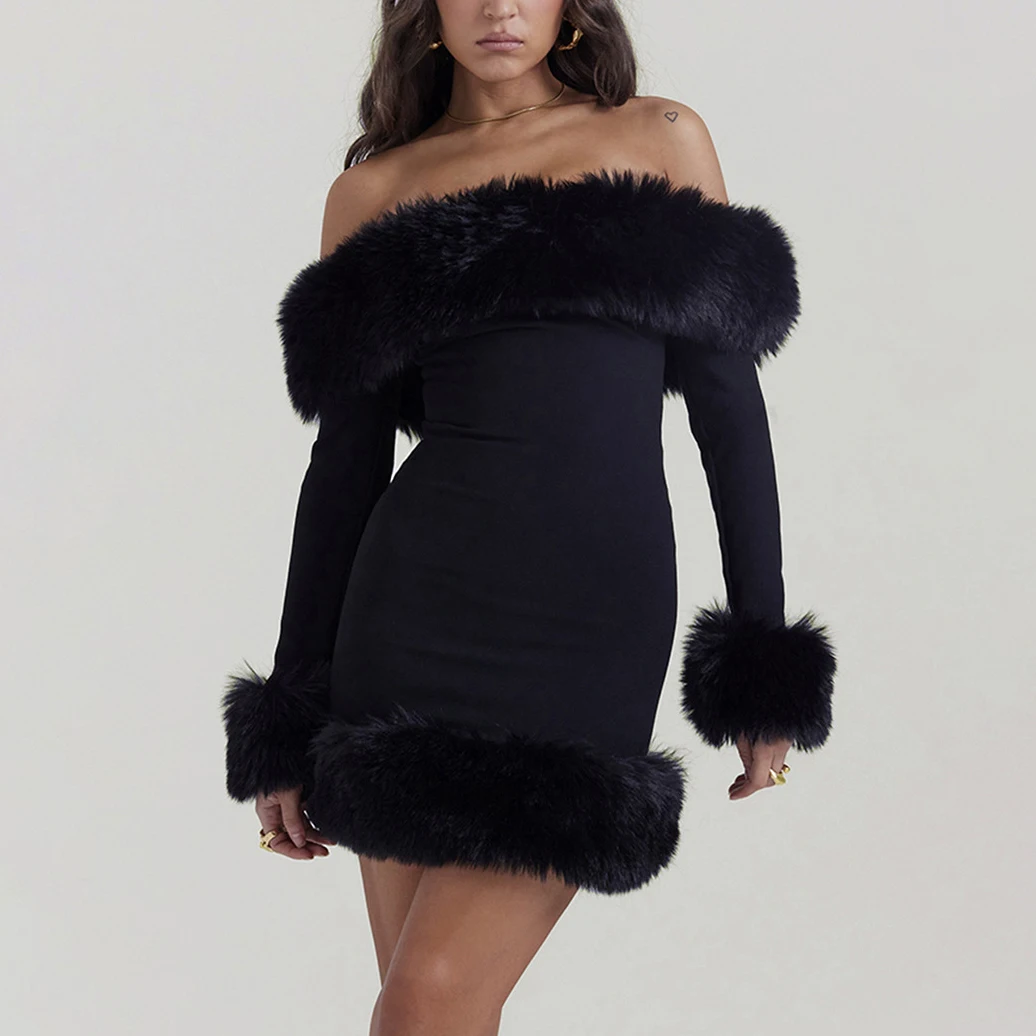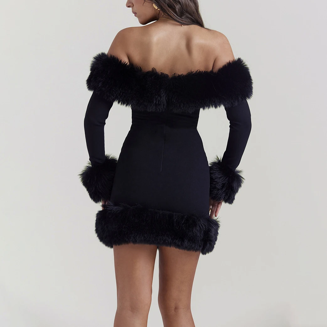Wholesale Women's Dresses off Shoulder Fur Collar Long Sleeve Custom Clothing Backless Mini Casual Dresses for Women