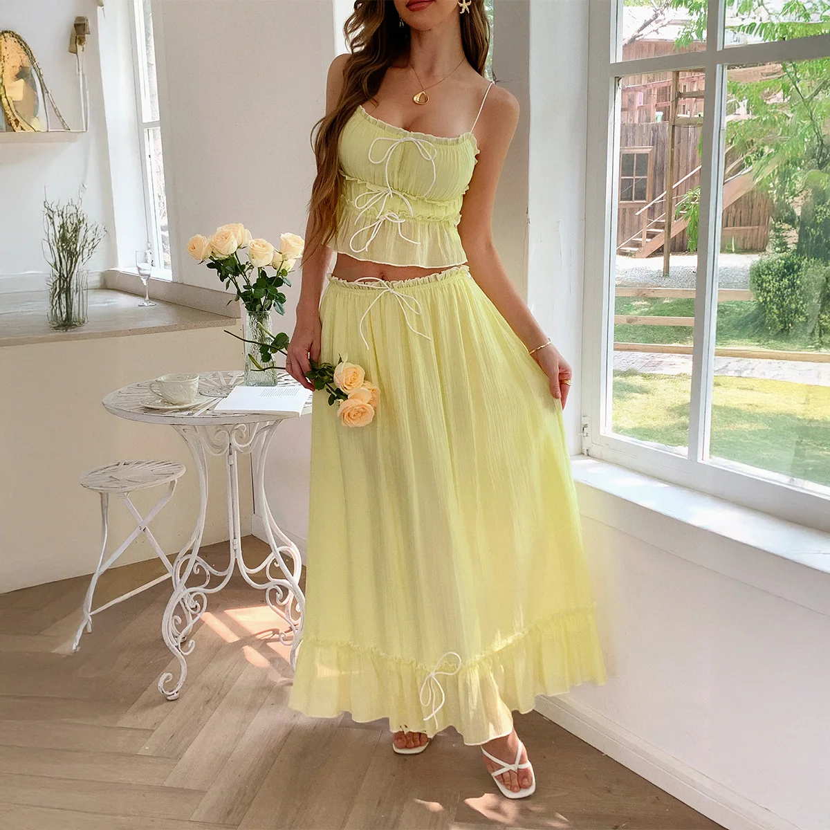 Women's Summer 2 Piece Skirt Sets Casual Spaghetti Straps Cropped Cami Ruffle Maxi Skirt Flowy Beach Outfit