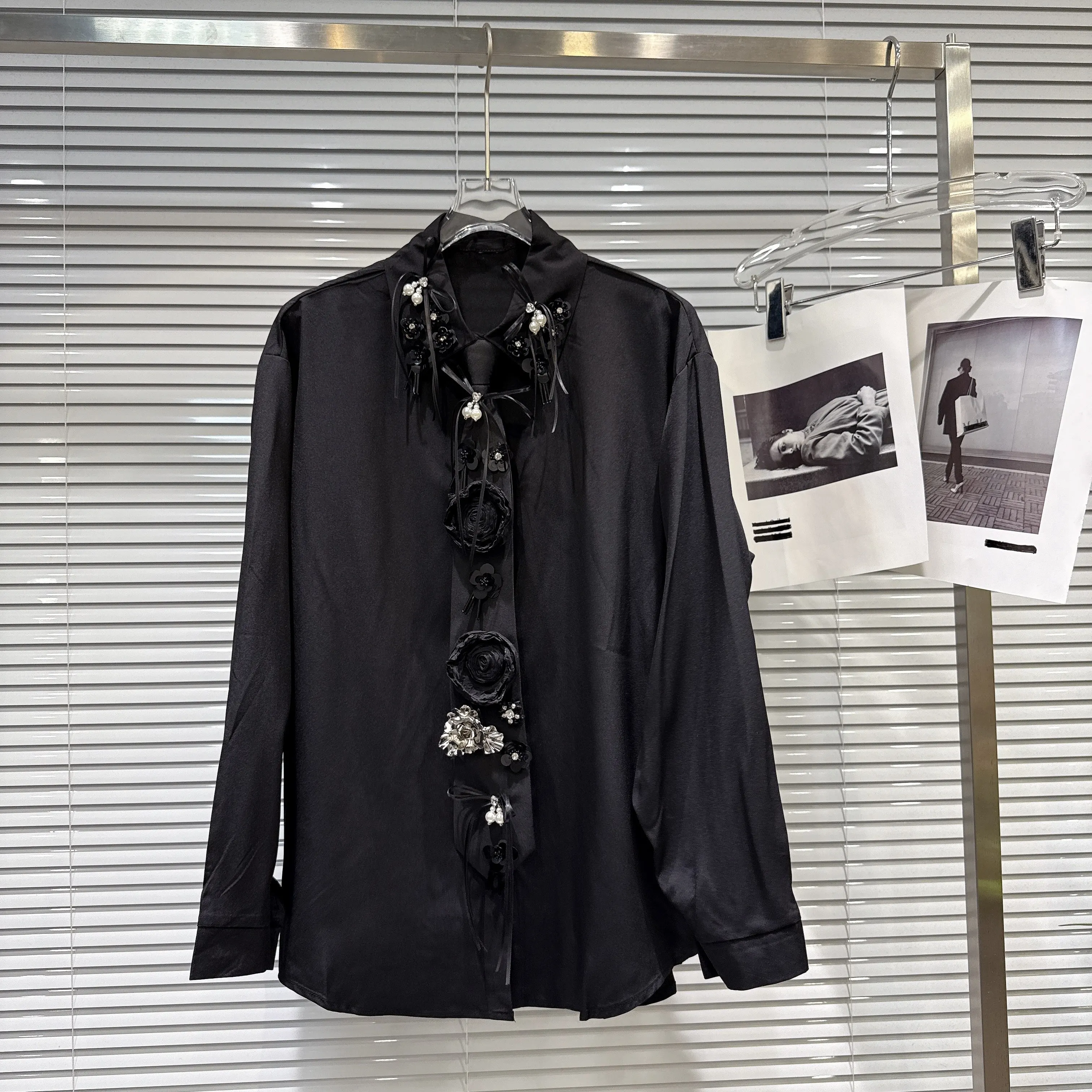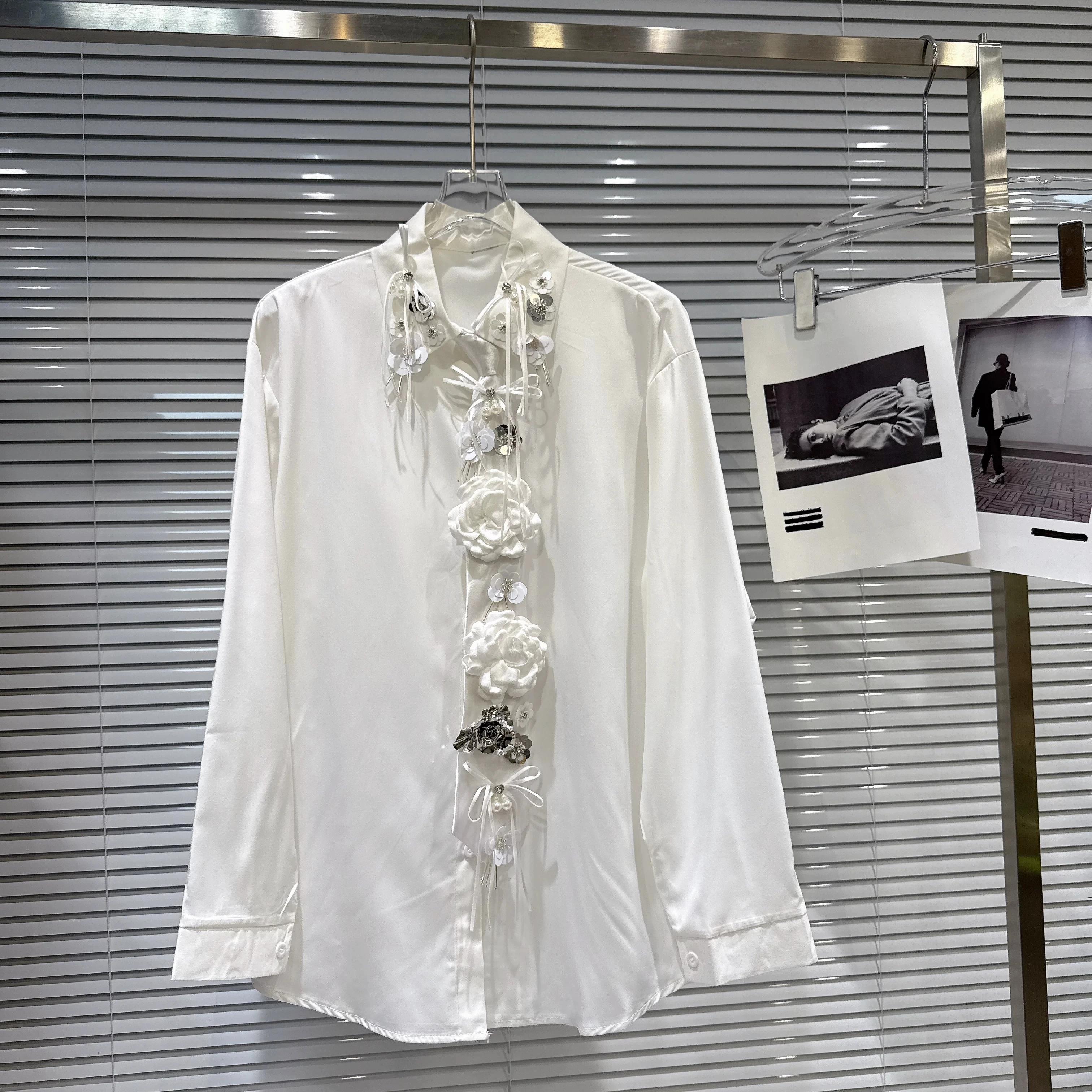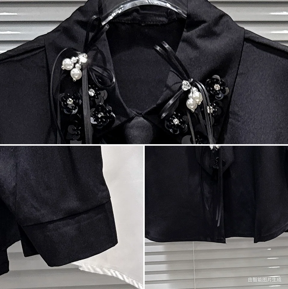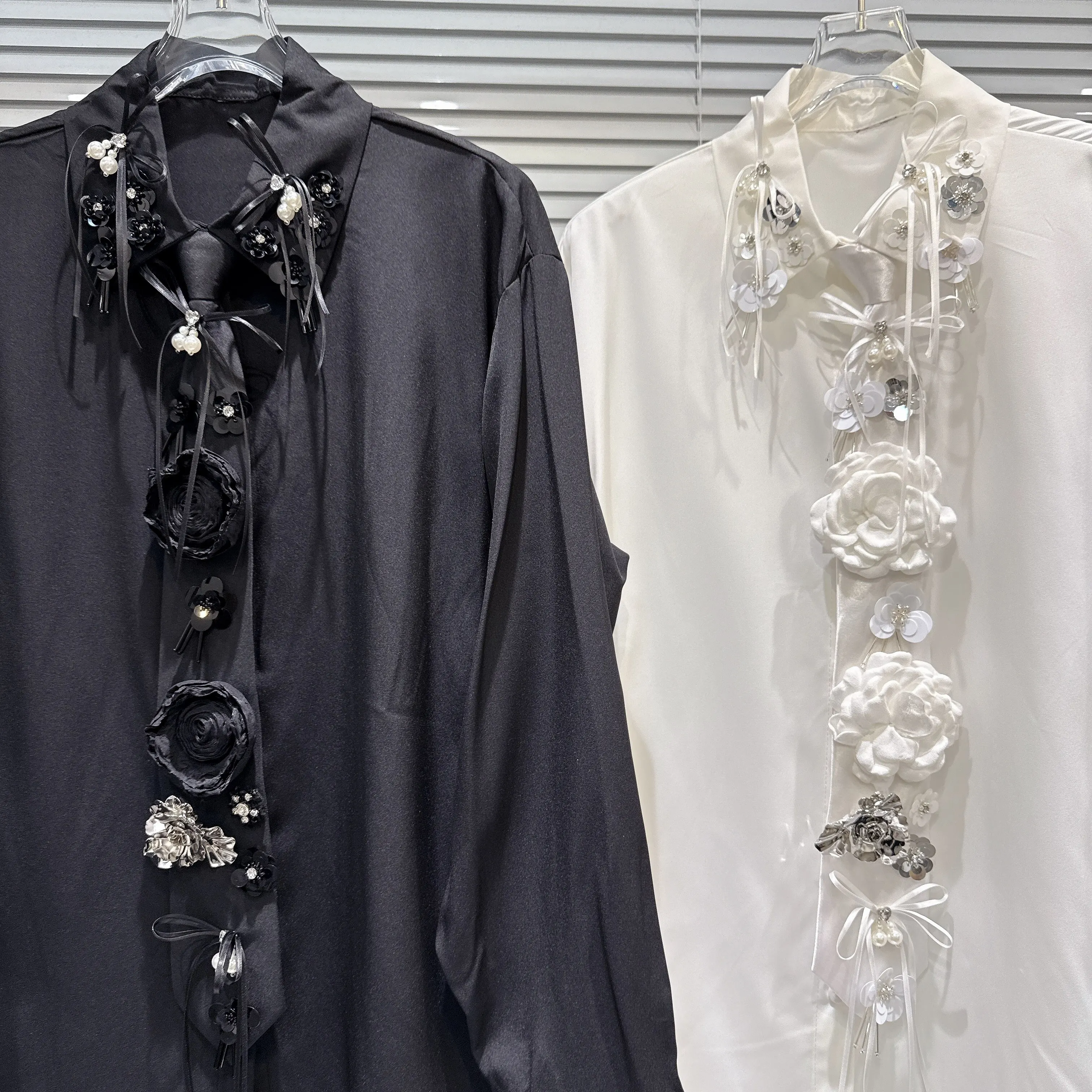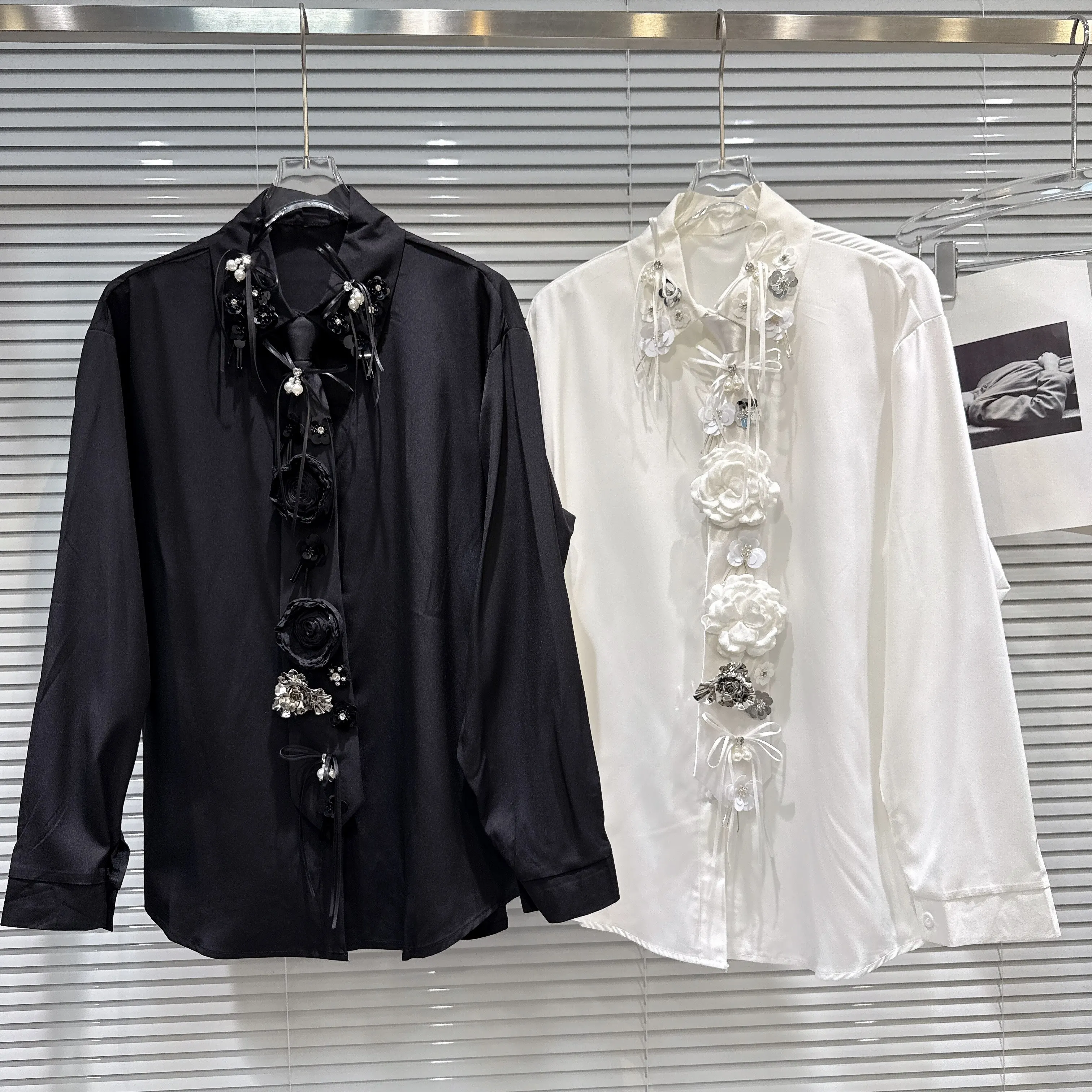 Factory Wholesale Designer Fashion Spring Summer 3D Appliques Shirt Turn-down Collar Belt Casual Diamonds Sequined Blouse