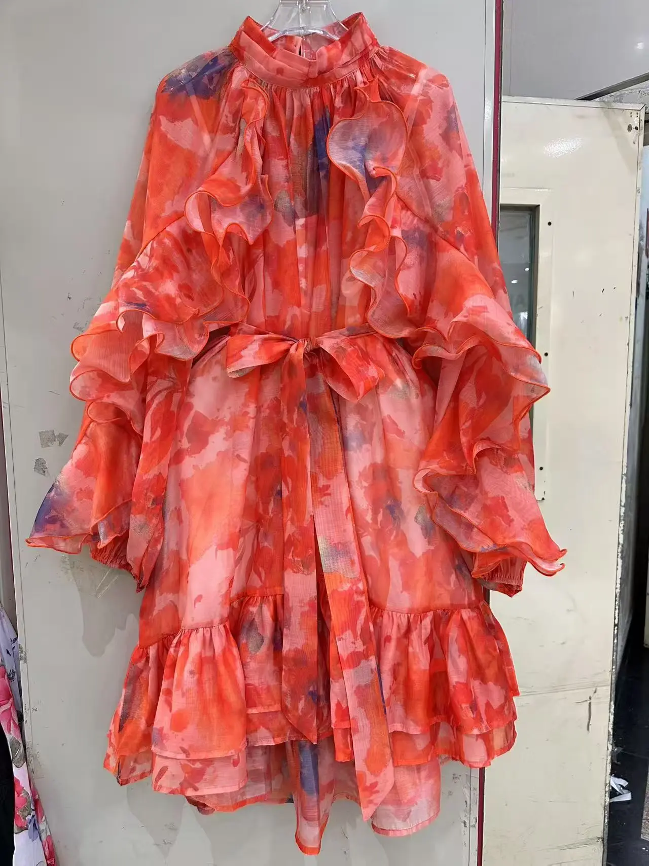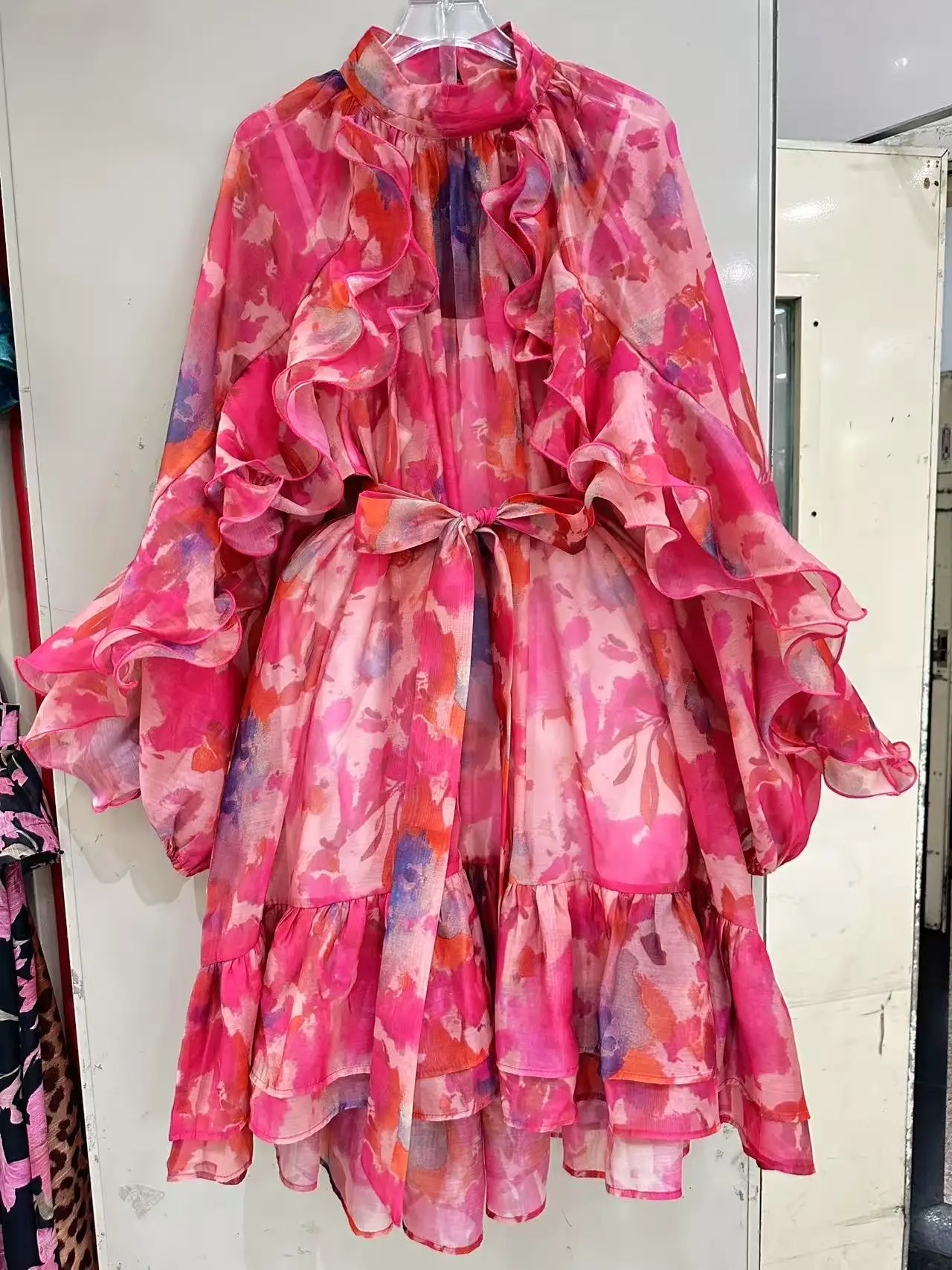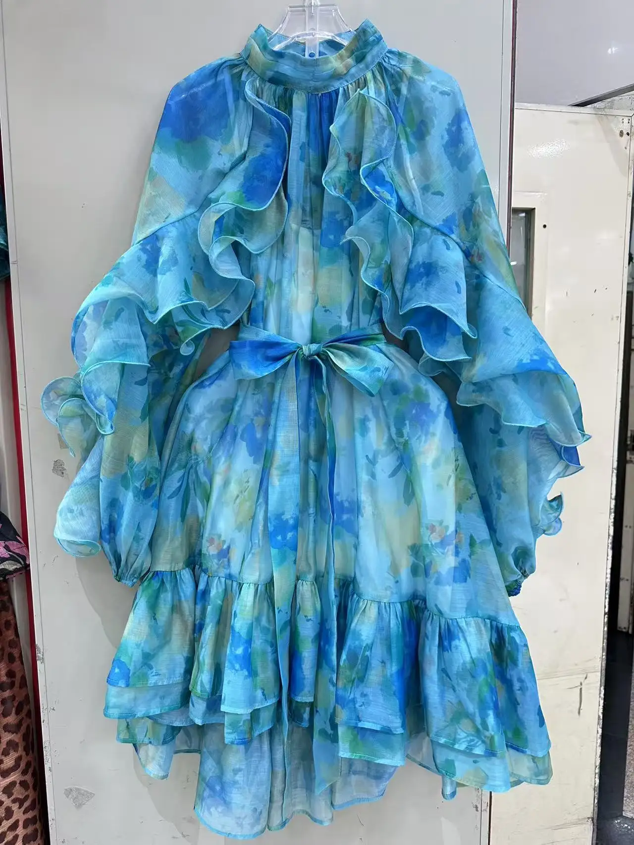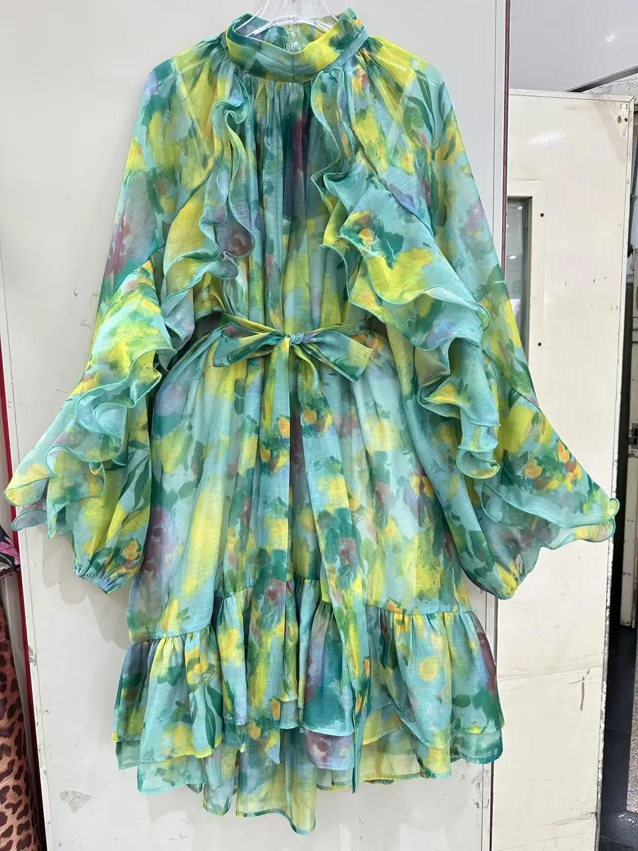 AELESEEN 2026 Spring Summer Loose Dress Women Ruffled Printed Lantern Sleeve Turtleneck Belt Asymmetrical Hem Casual Party