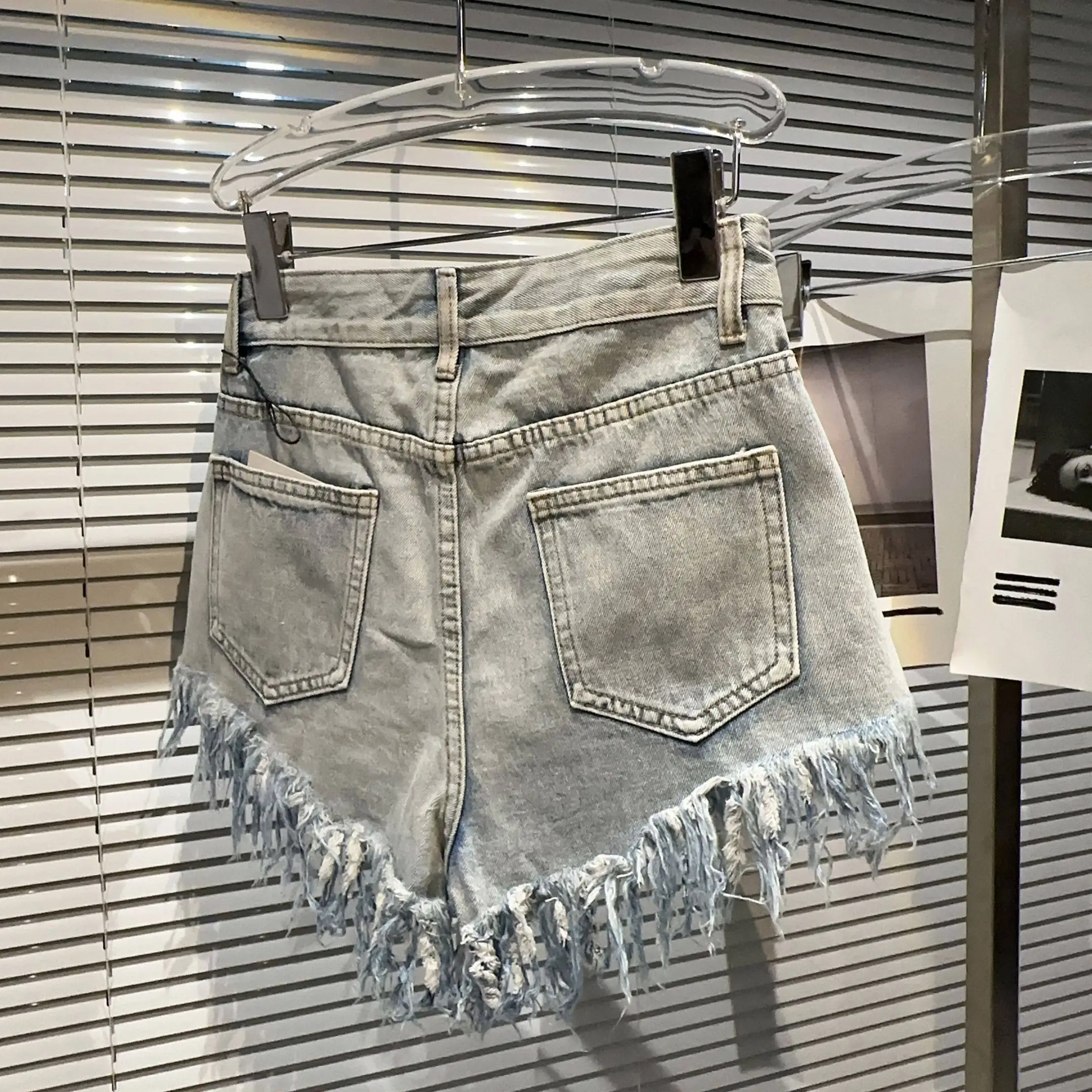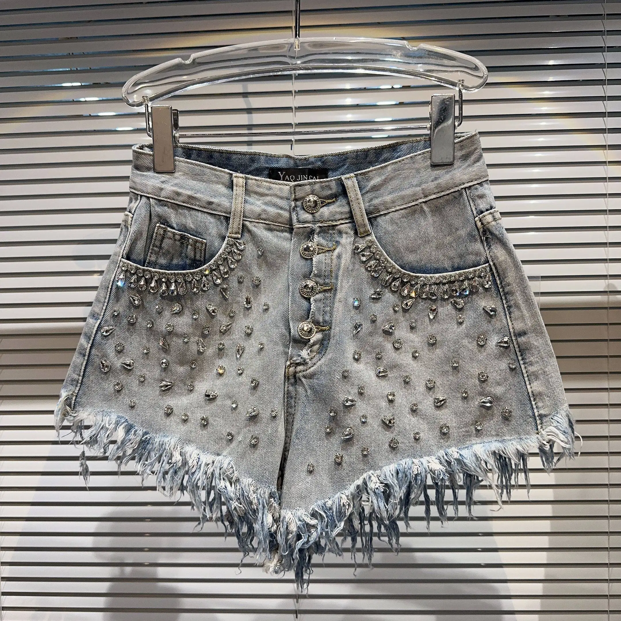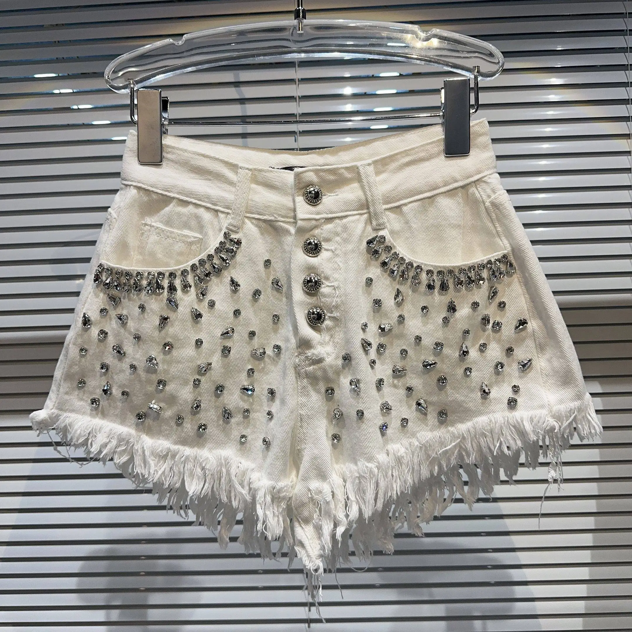AELESEEN Women's High-Waist Streetwear Denim Pants Tassel Rhinestone Decor Cool Short Jeans Featuring Drawstring Washed