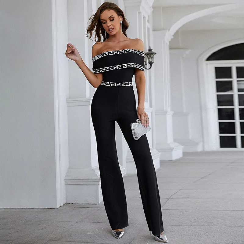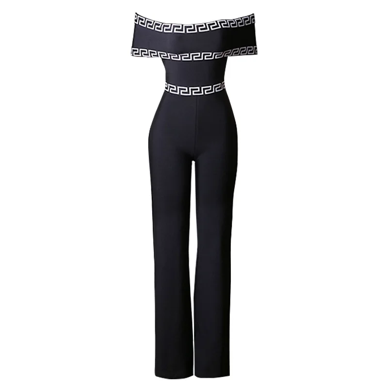 Factory Wholesale Hot Sale Spring Summer Fashion Wide Leg Slash Neck Elastic Knitted High-end Women Printed Jumpsuit