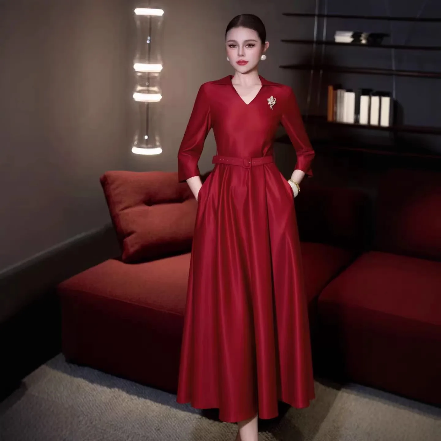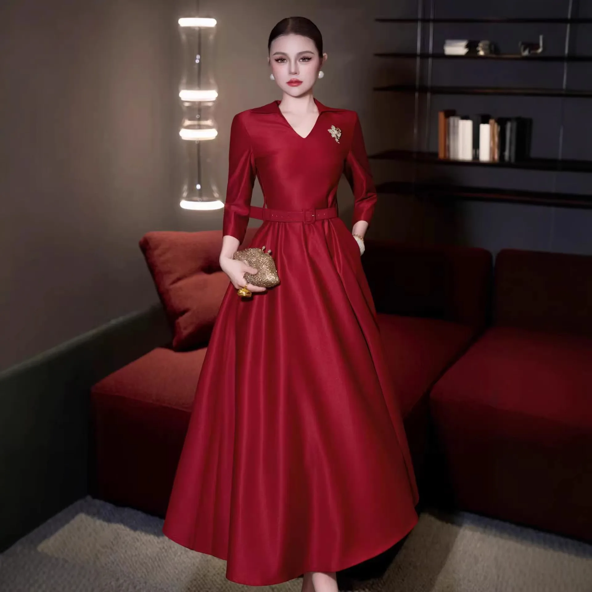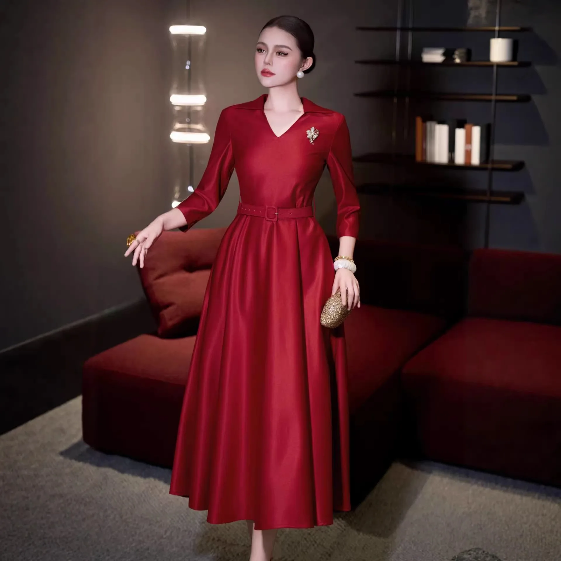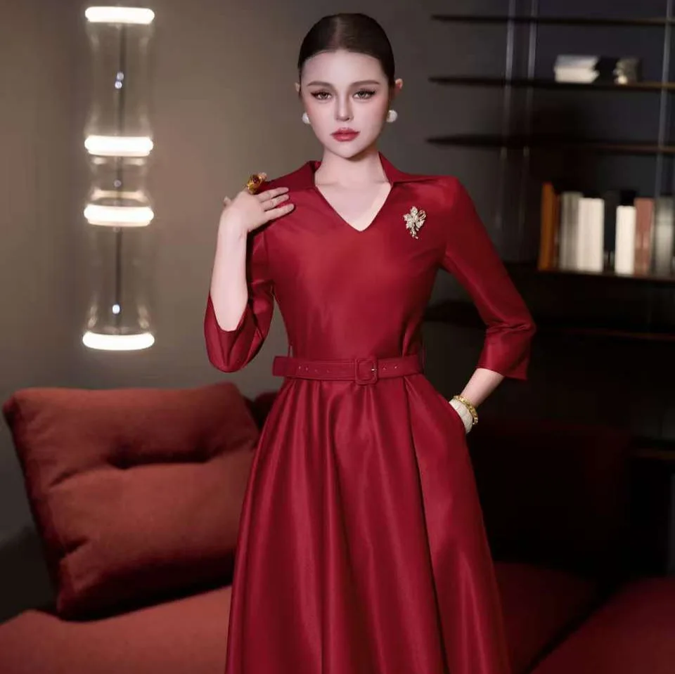 Factory Wholesale European Women's 2026 Spring Autumn New A-Line Diamond Belt Slim Dress V-Neck Long Wine Red Midi Elegant Party