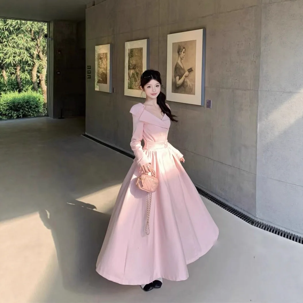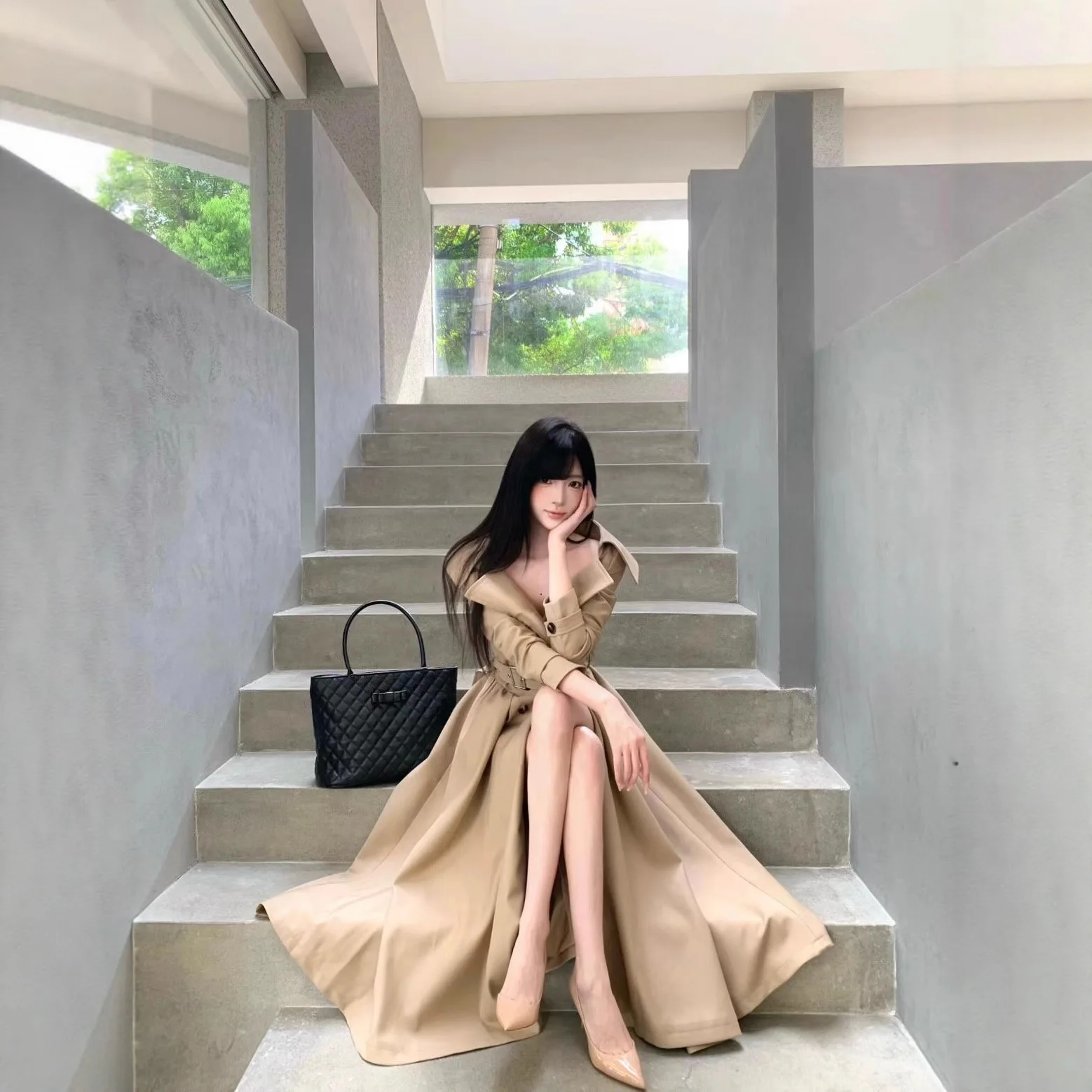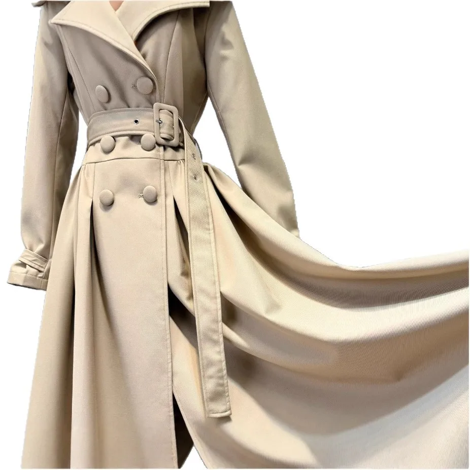 Factory Wholesale Design French Style Elegant Trench Women V-neck Lapel Double-breasted Winter Belt Tight Waist Long Party