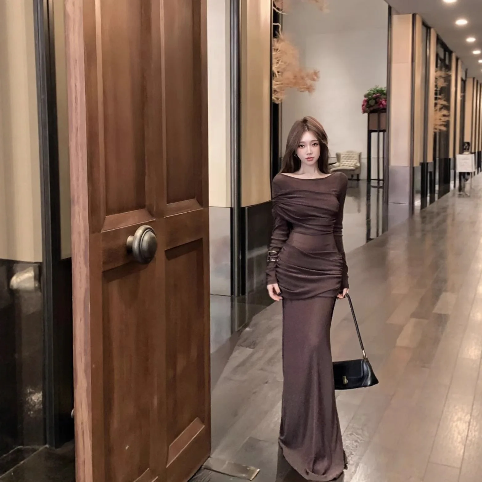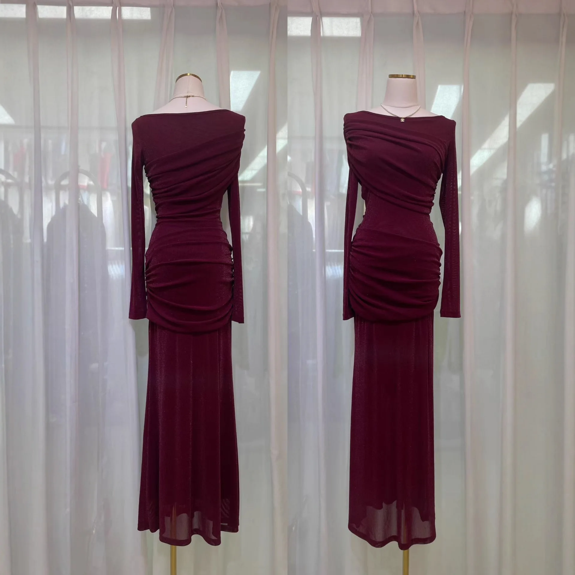 ZYHT 73905 Dusty Rose Off-The-Shoulder Long Sleeve Stretch Jersey Dress Ruched Bodice Floor Length Fish Tail Maxi Dress