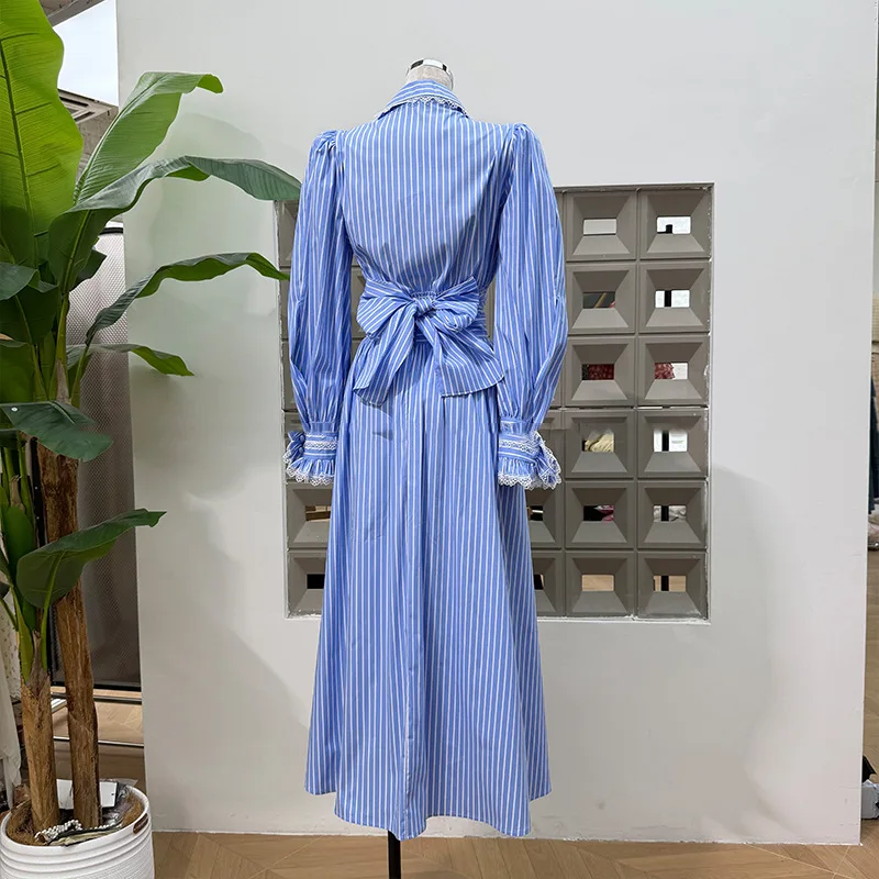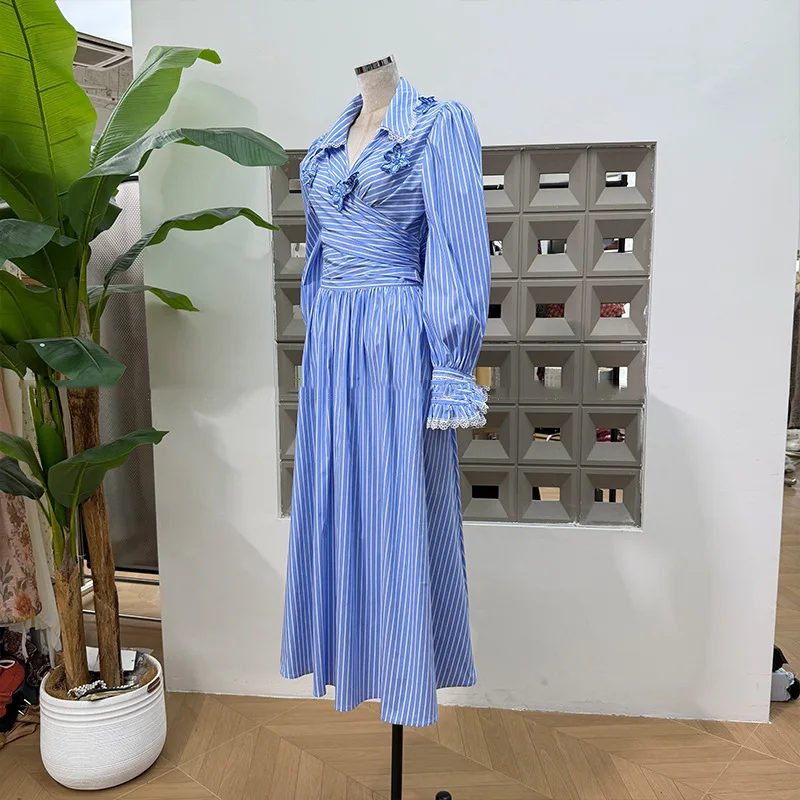 Factory Wholesale 2 Pieces Set Women Spring Autumn Striped Lantern Sleeve 3D Butterfly Bangds Shirt + Midi Skirt Suit Set