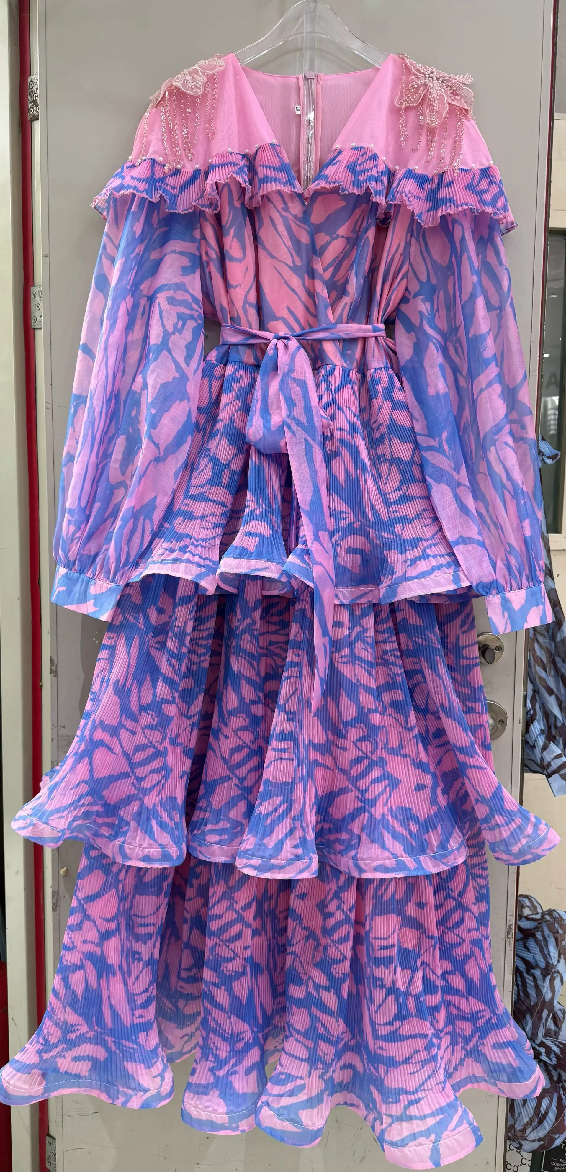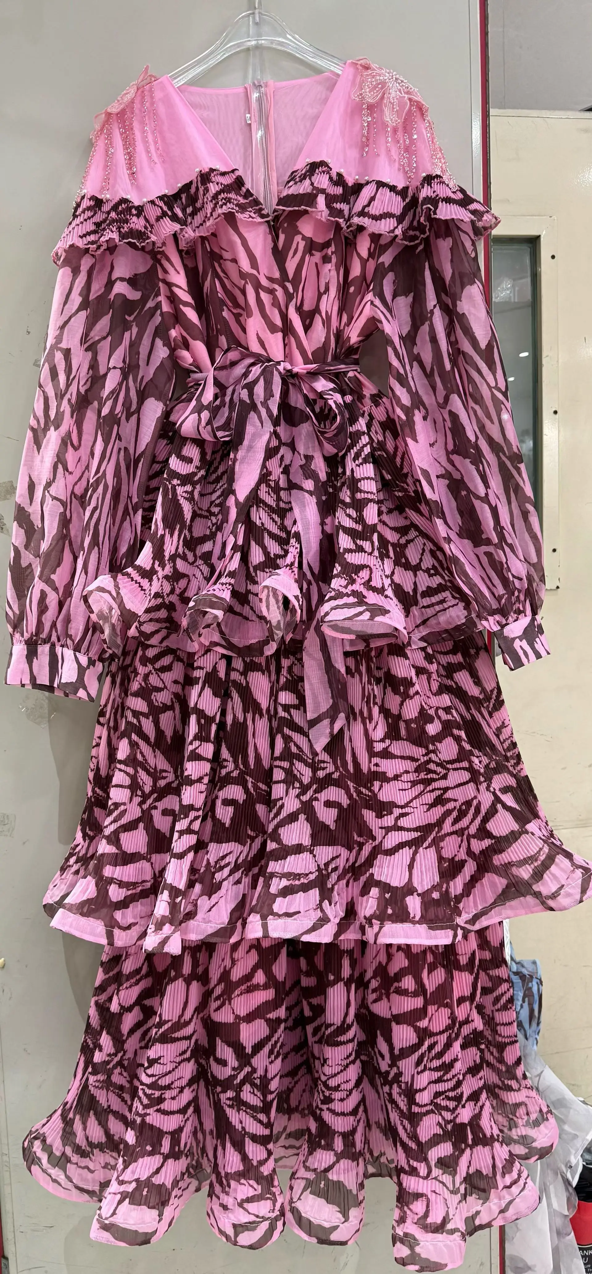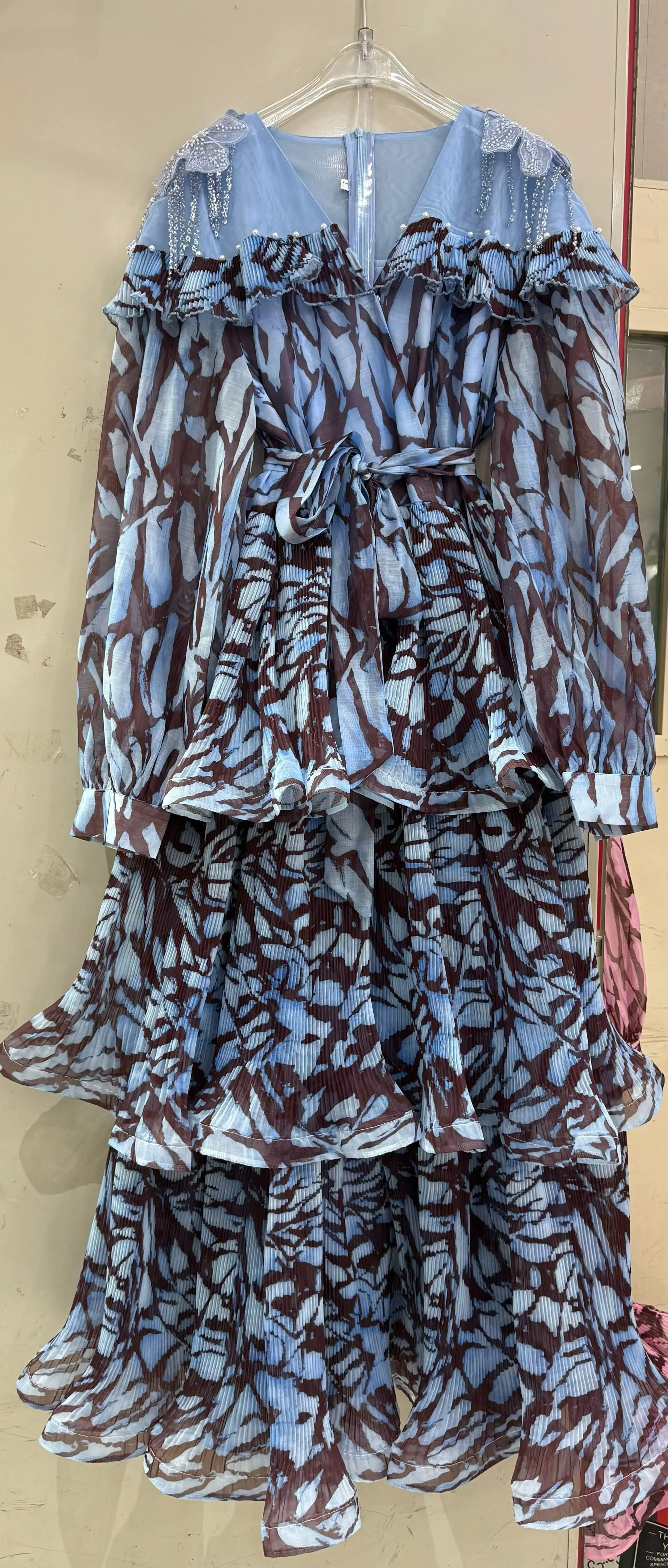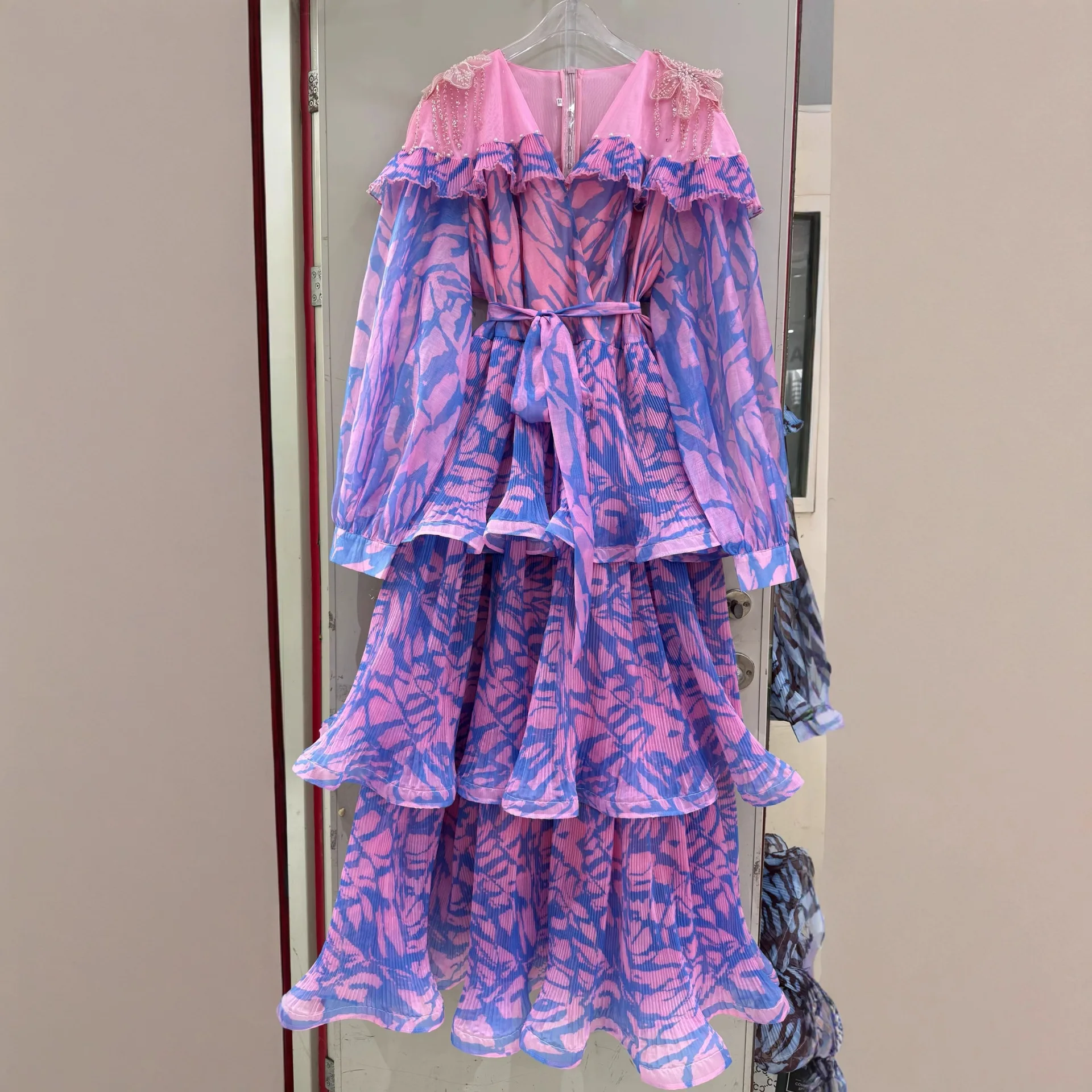 AELESEEN Spring Autumn Dress New Fashion Design Women Runway Beading V-Neck Cascading Ruffles Print Flower Casual Belt Holiday