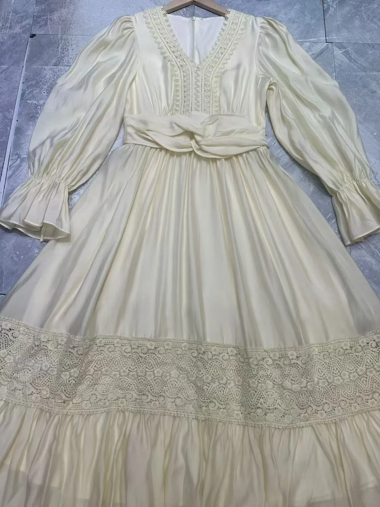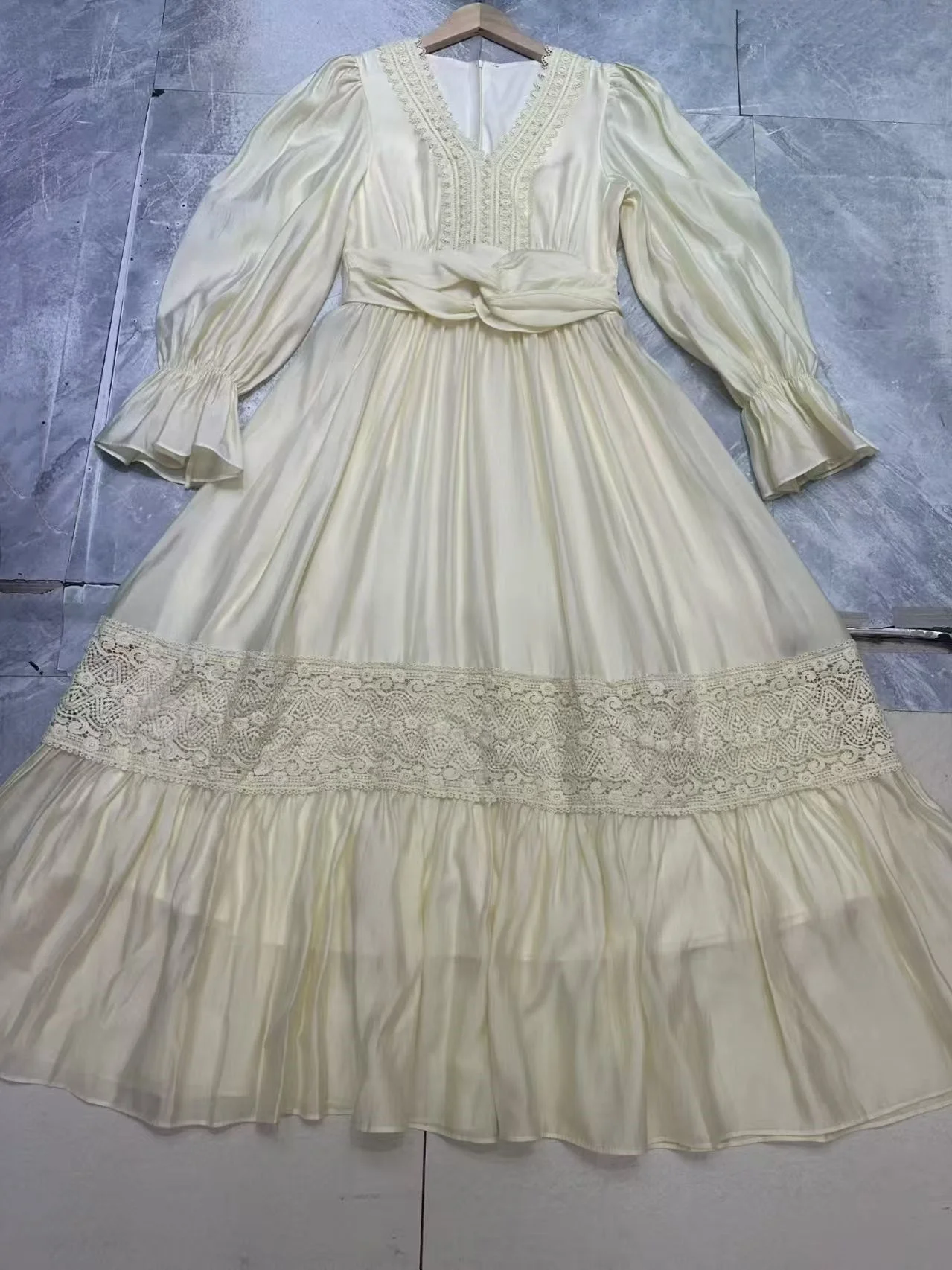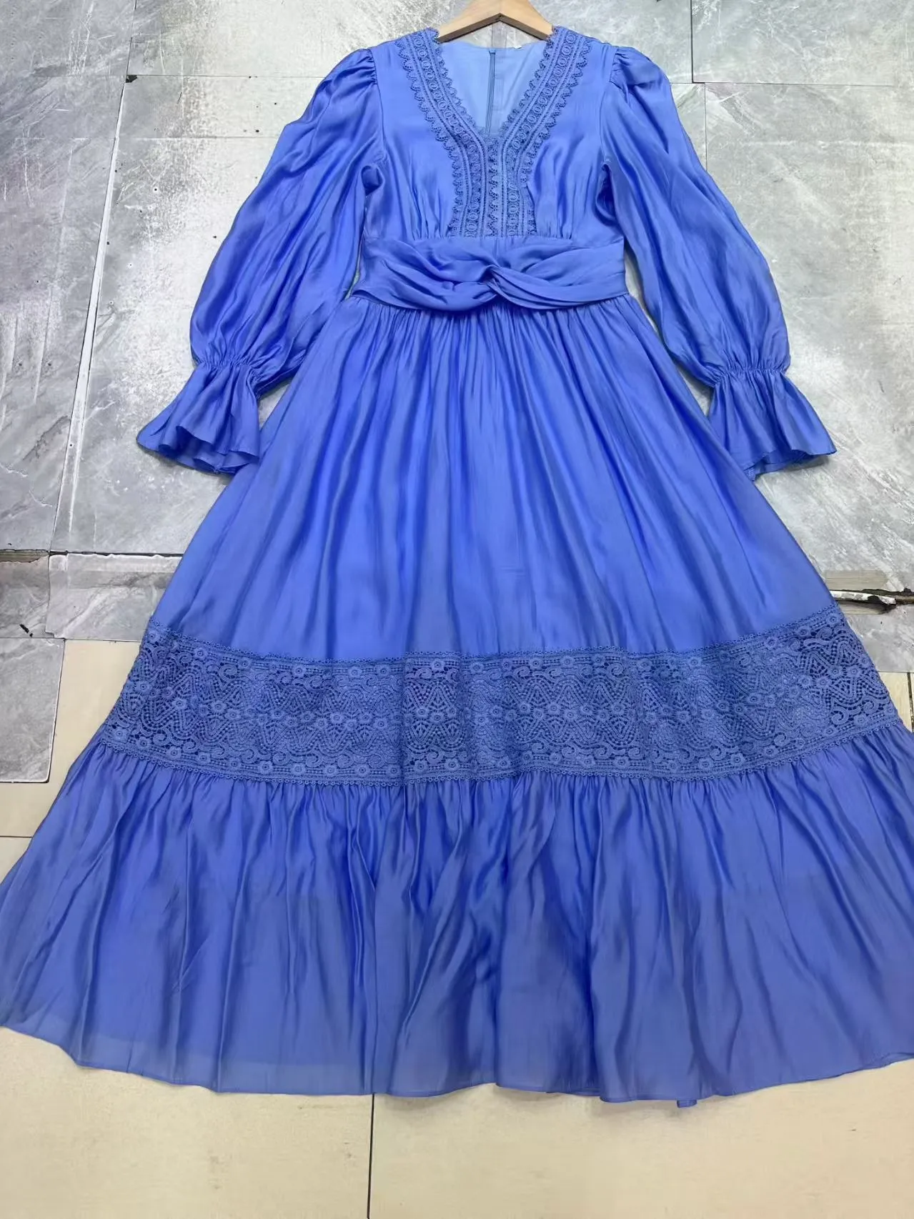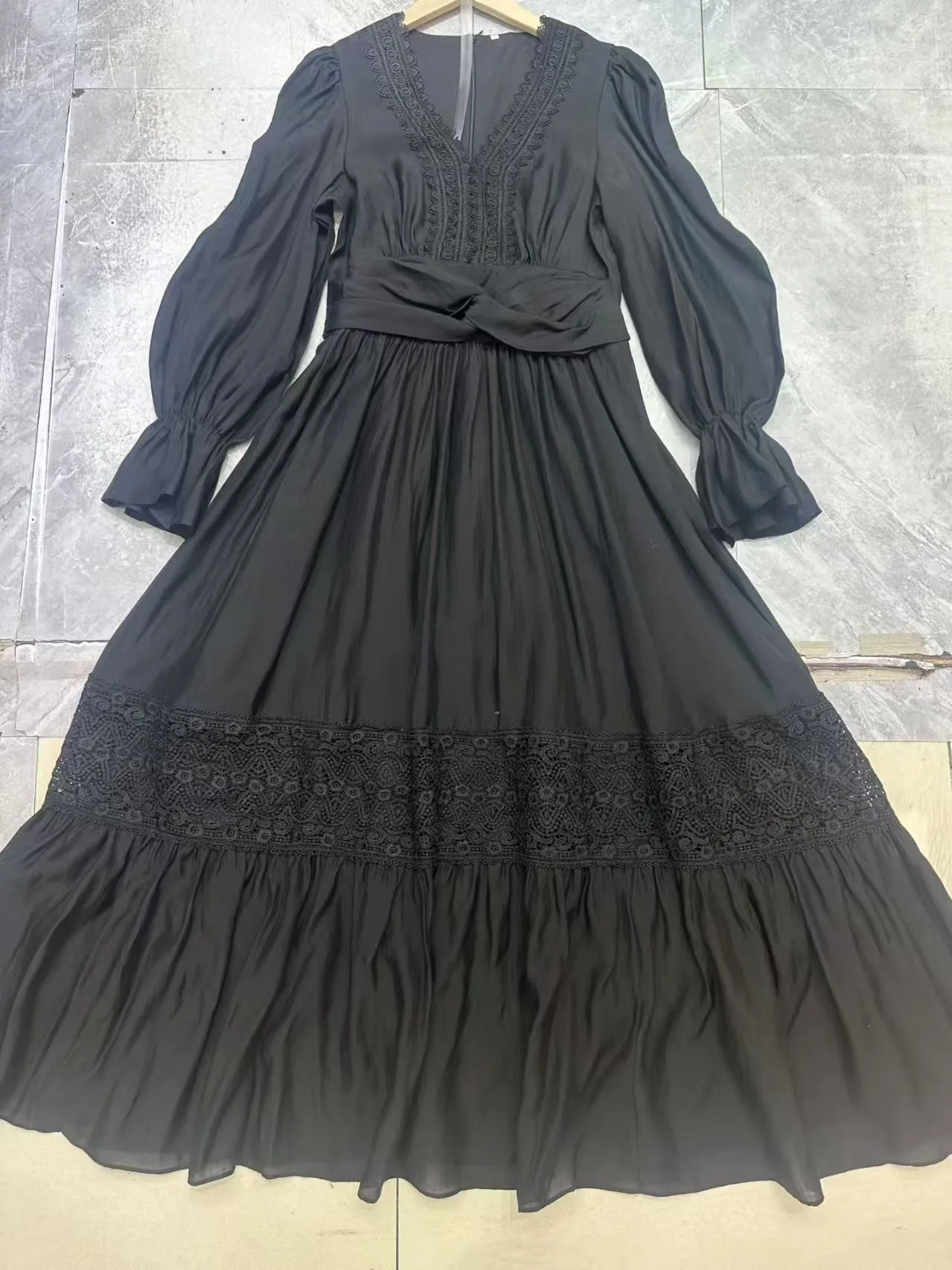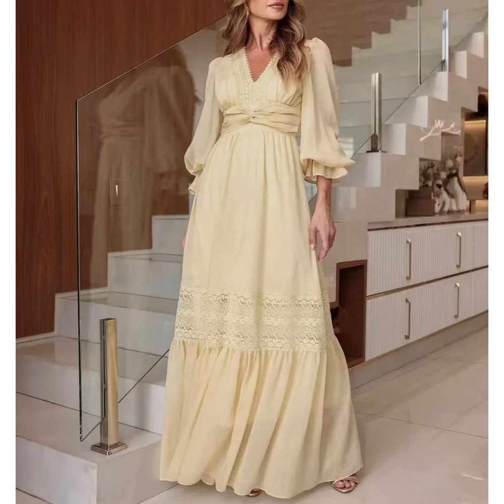 Factory Wholesale Runway Fashion Long Dress Women Spring Autumn American Socialite Elegant V-Neck Lace Stitching Ruffles