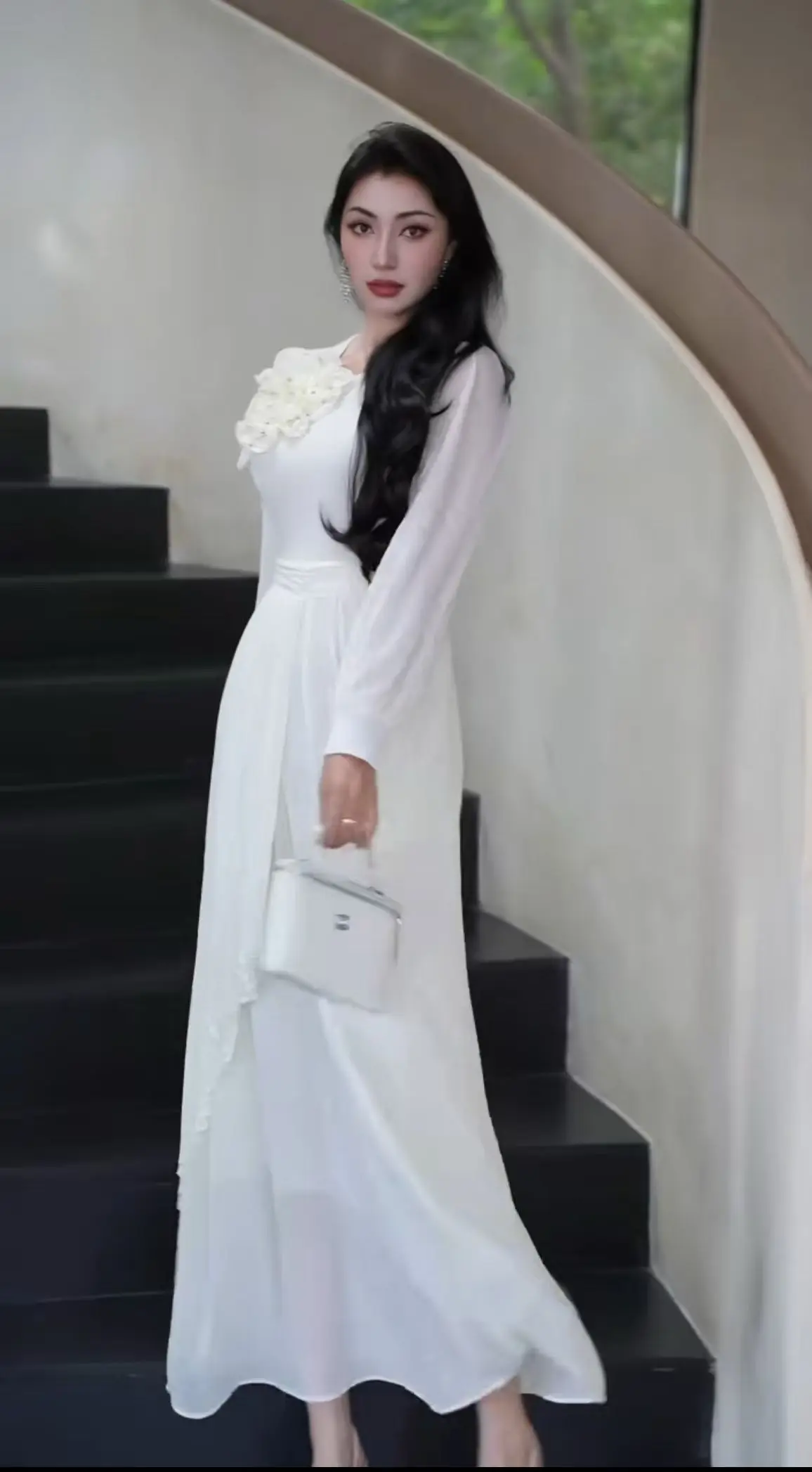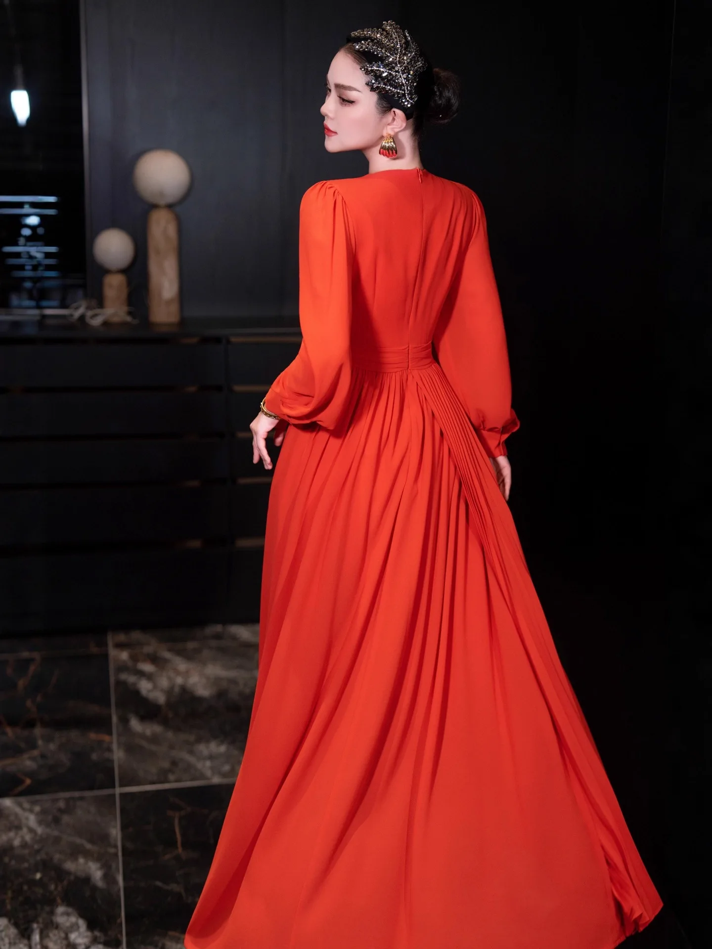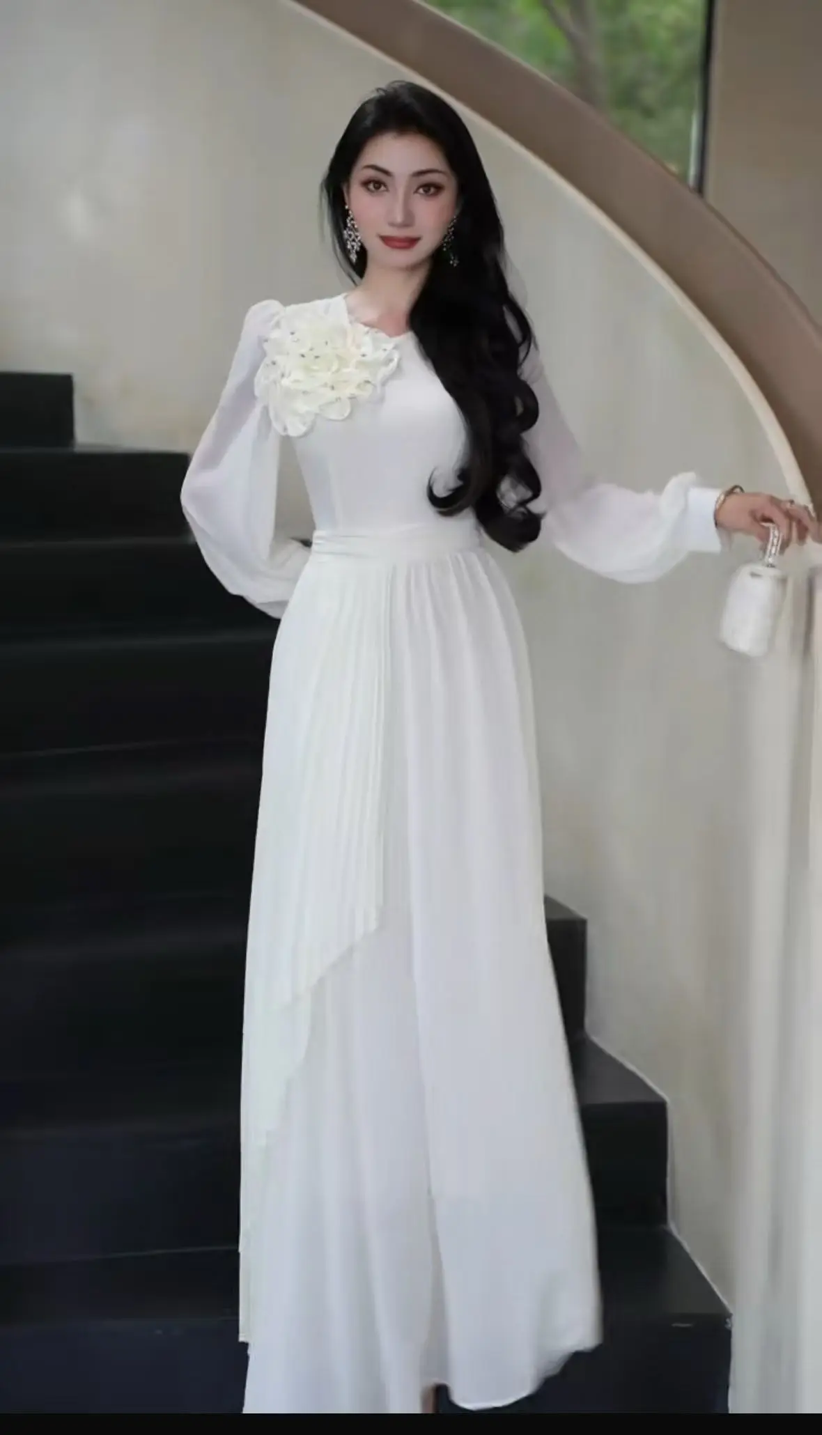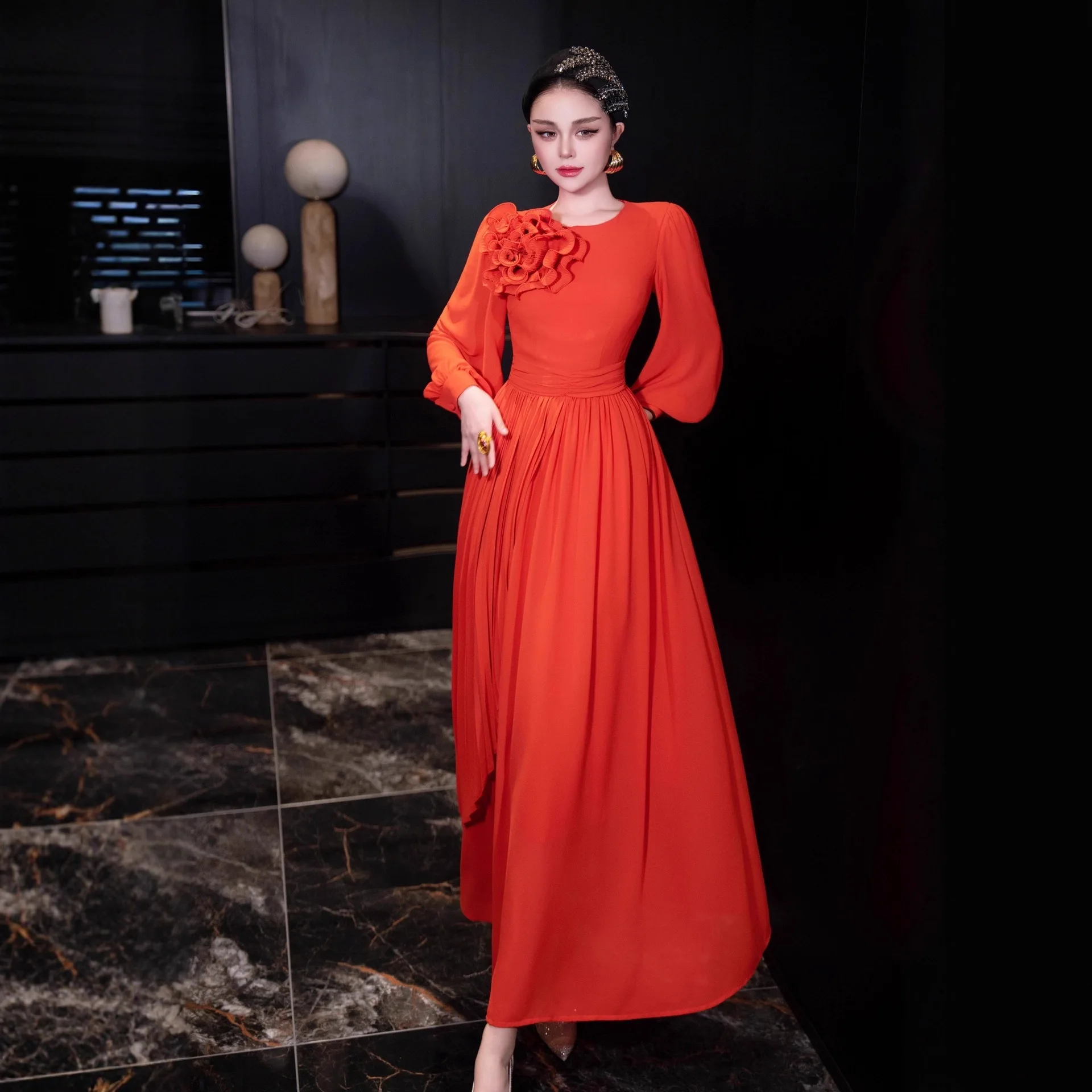 Factory Wholesale Three-dimensional Flower Long Dress Women Spring Autumn Lantern Sleeve Ruffles Pleated Elegant Socialite