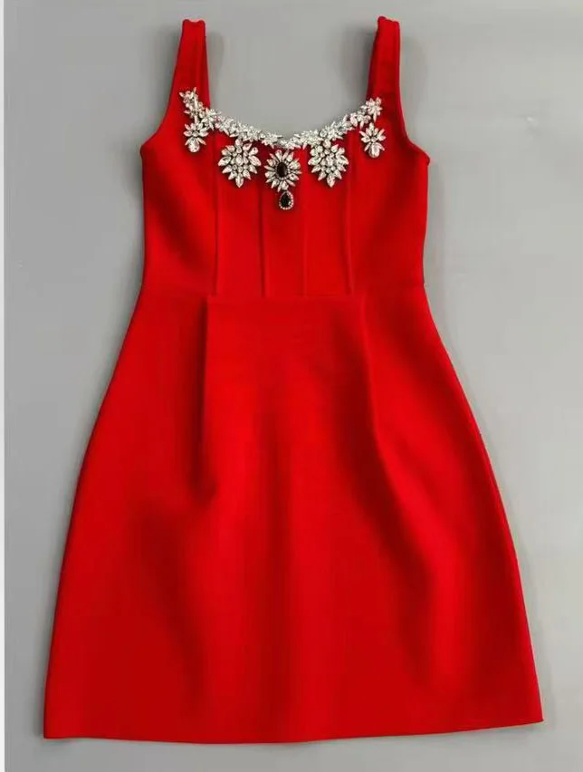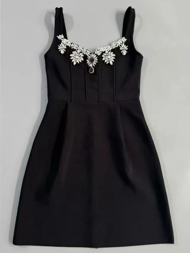 Factory Wholesale Vintage Polyester Mini Dress V-Neck Summer Spaghetti Strap Luxury Diamonds High Waist Elegant Party Dress