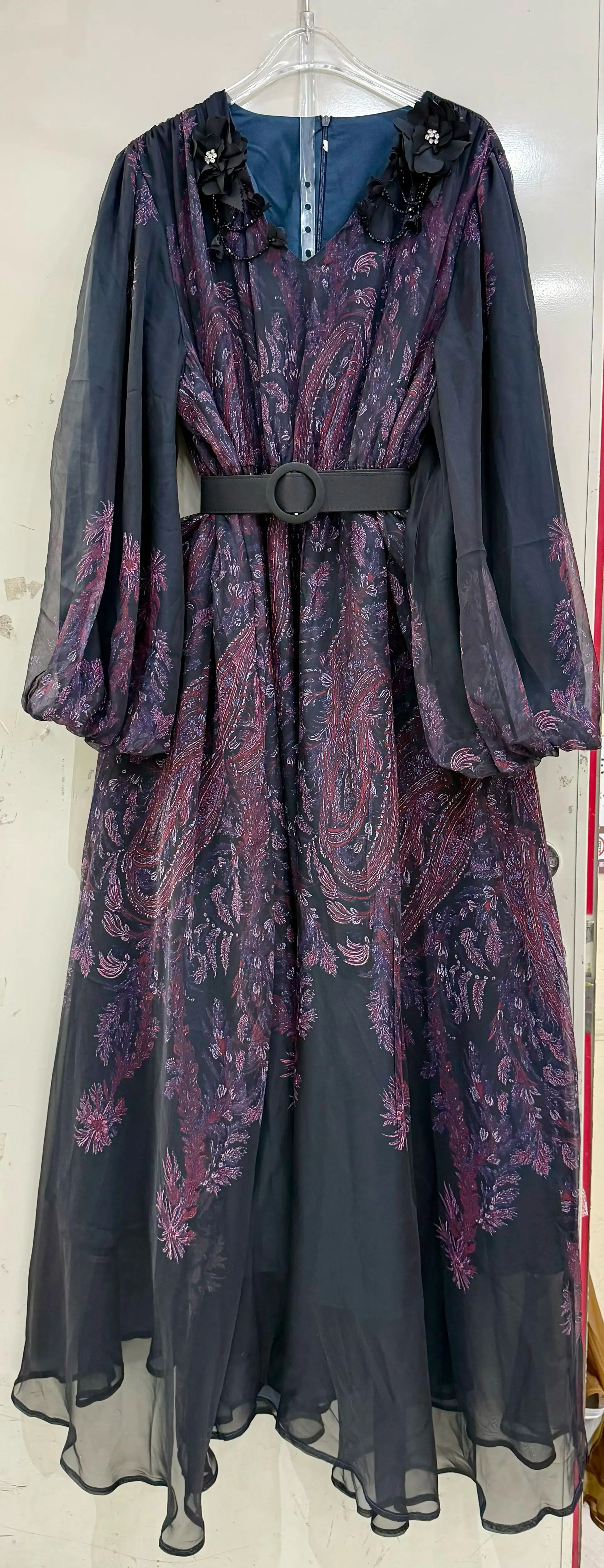 ZYHT 73906 Long Sleeve Deep V Neck High Slit Sexy Elegant Knot Long Floor Length 3D Flower Dark Green Purple Women Evening Dress