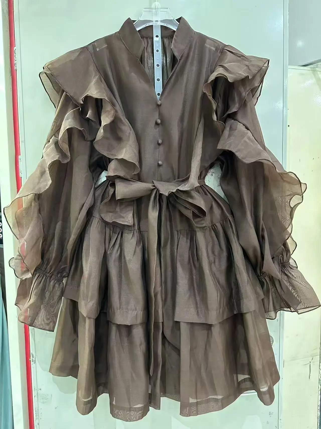 ZYHT 82053 Apricot Lace Top with Tiered Ruffled Sleeves V-Neck & Gold Buttons Blouse Wanita Elegan Women Blouse