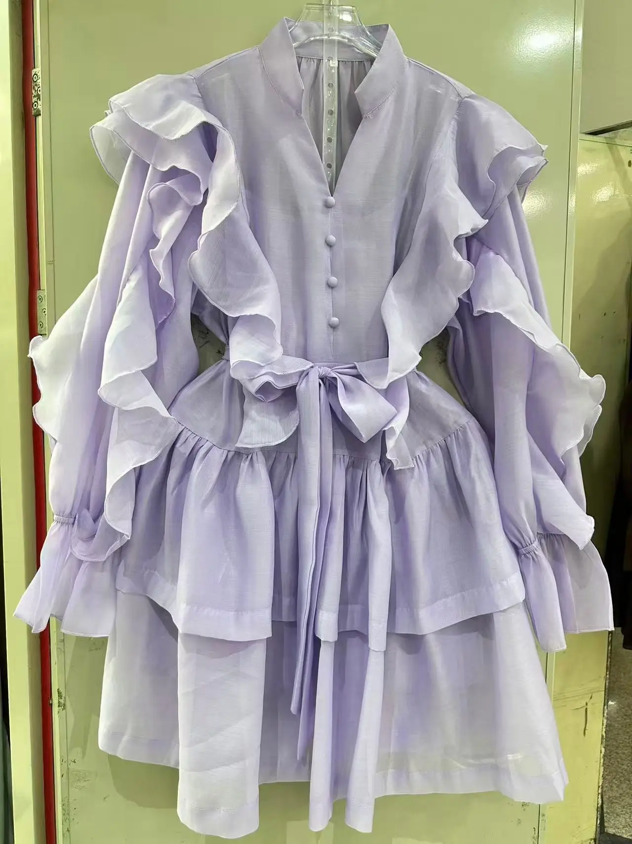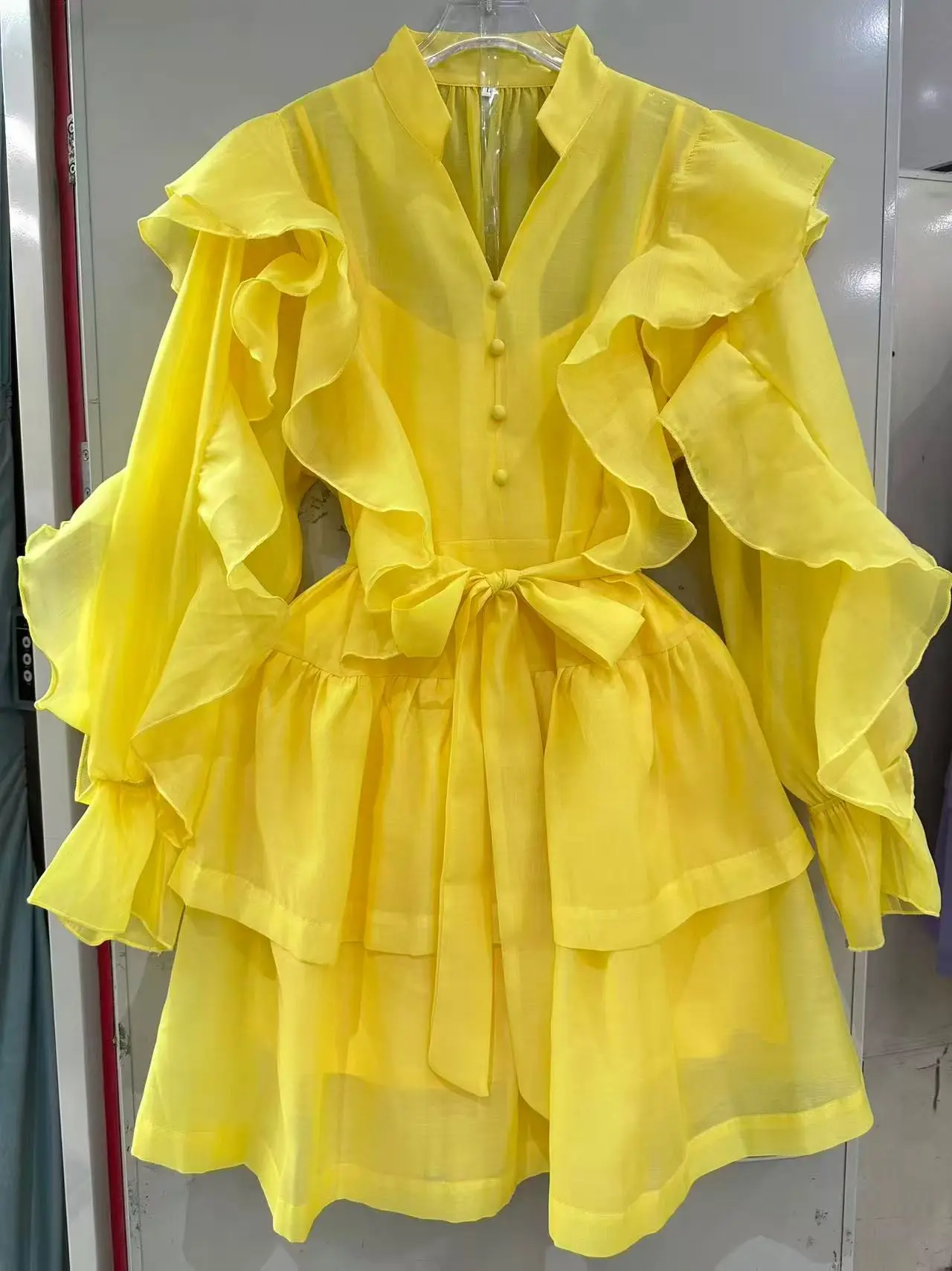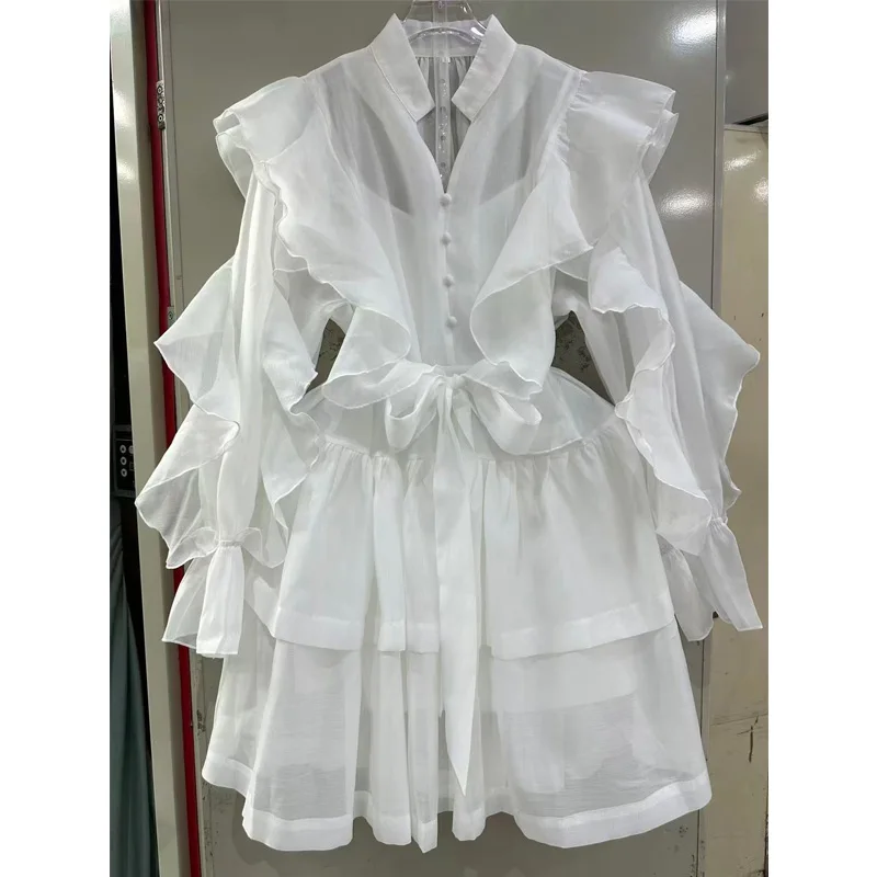 Factory Wholesale Vacation Casual Mini Dress Women Spring Summer Full Sleeve V-Neck Solid Ruffles Loose Oversize Party Dress