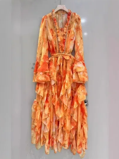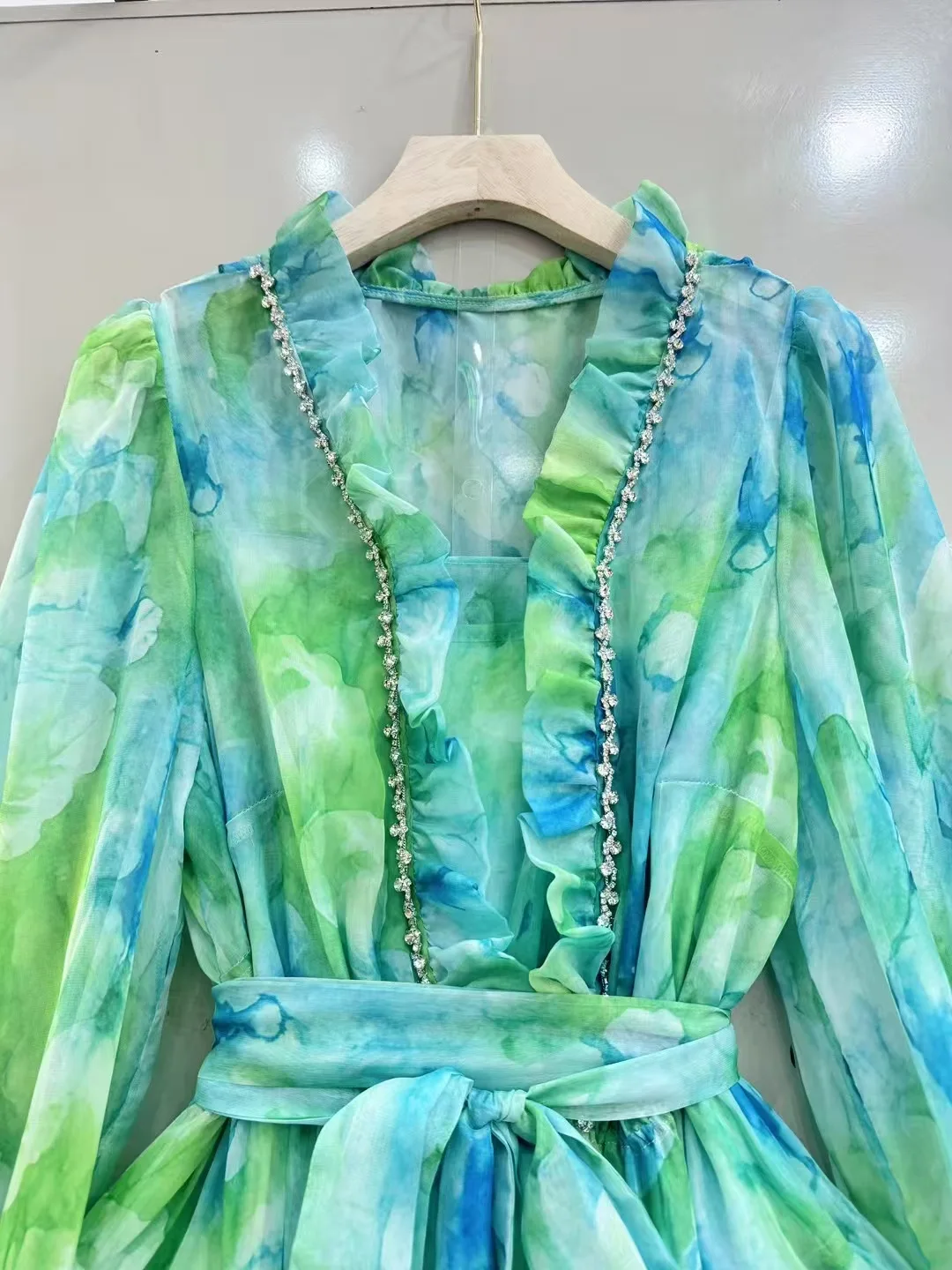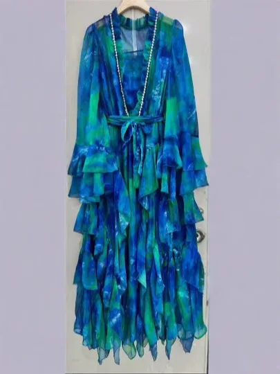 AELESEEN 2026 Spring Summer Midi Dress Women New V-Neck Green Vintage Floral Printed Layers Ruffles Beading Irregular Party