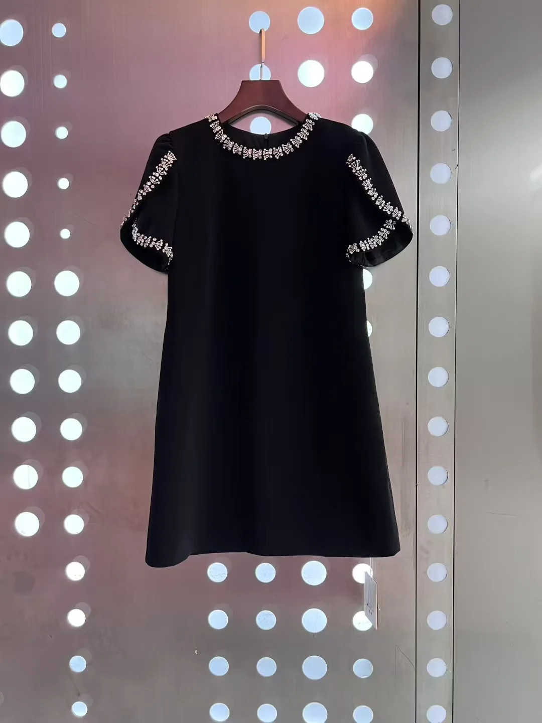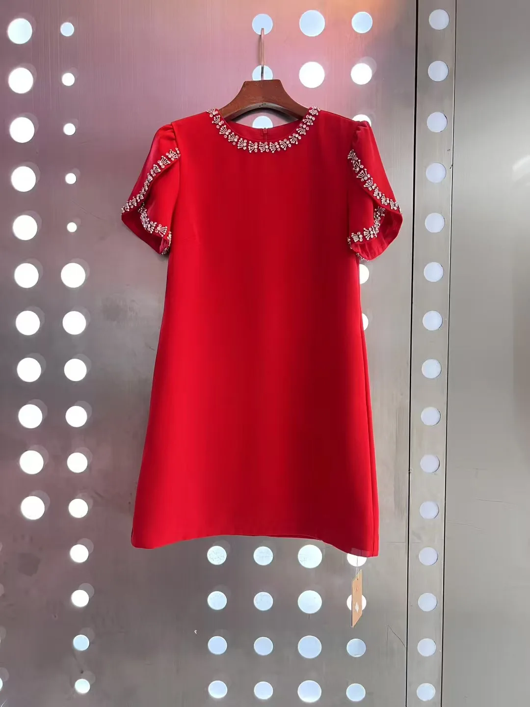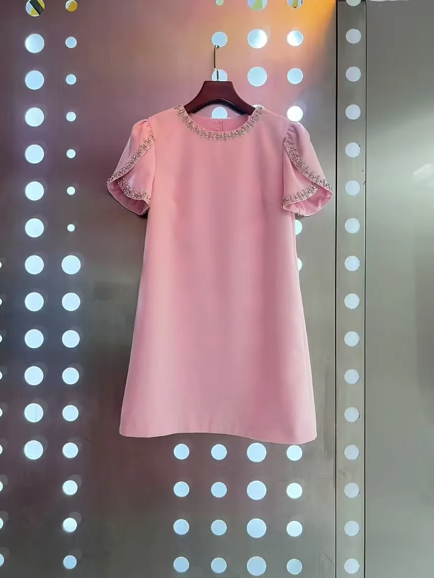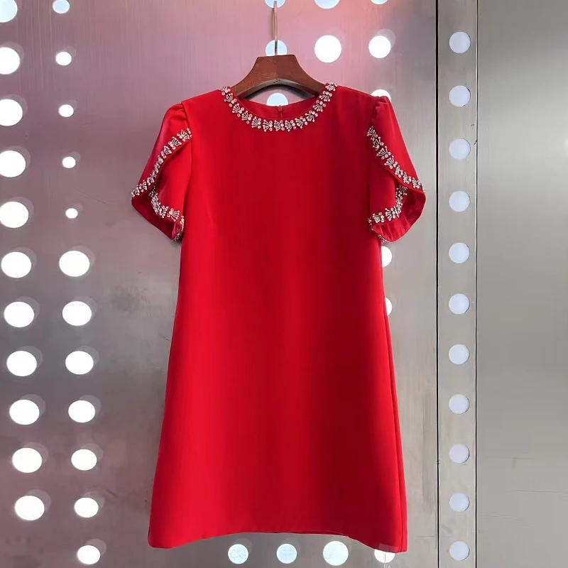 AELESEEN 2026 Spring Summer Mini Dress Elegant O-Neck Red Black Pink White Luxury Beading Diamond Nail Drill Short Sleeve Casual